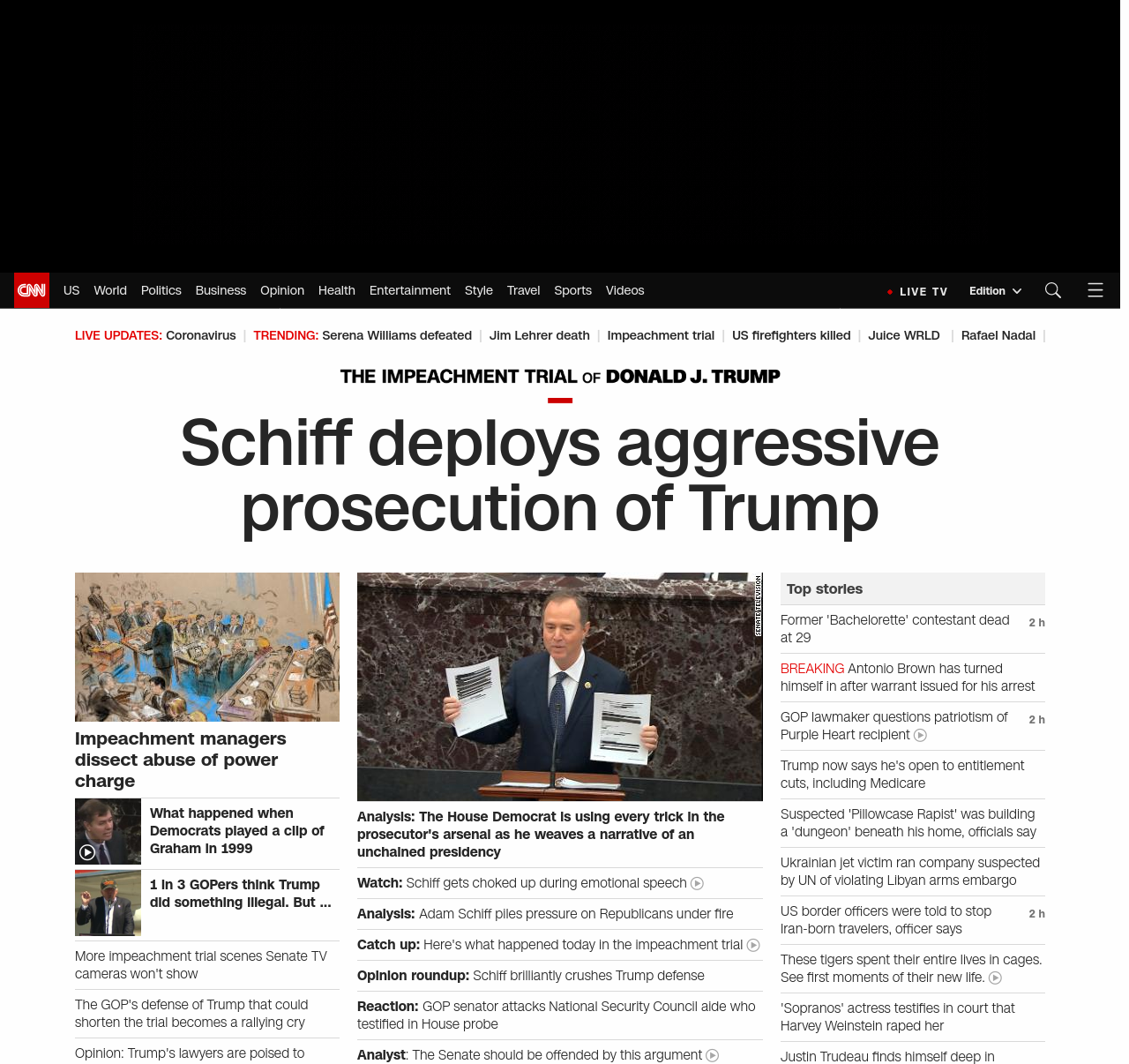 ” , title: “CNN – Breaking News, Latest News and Videos” , siblings: {“articleList”:[{“uri”:”/2020/01/23/politics/senate-impeachment-trial-day-3/index.html”,”headline”:”u003cstrong>Impeachment managers dissect abuse of power chargeu003c/strong>”,”thumbnail”:”//cdn.cnn.com/cnnnext/dam/assets/200122180445-01-day-2-impeachement-trial-sketches-schiff-165311-small-11.jpg”,”duration”:””,”description”:”Democratic u003ca href=”https://www.cnn.com/2020/01/15/politics/what-is-an-impeachment-manager-explainer/index.html” target=”_blank”>impeachment managers u003c/a>on Thursday made their constitutional case for removing President Donald Trump from office for abuse of power, seeking to convince skeptical — and often weary — Republican senators that the Senate trial u003ca href=”https://www.cnn.com/2020/01/19/politics/schumer-trump-impeachment-trial/index.html” target=”_blank”>needs witnesses and documentsu003c/a>.”,”layout”:””