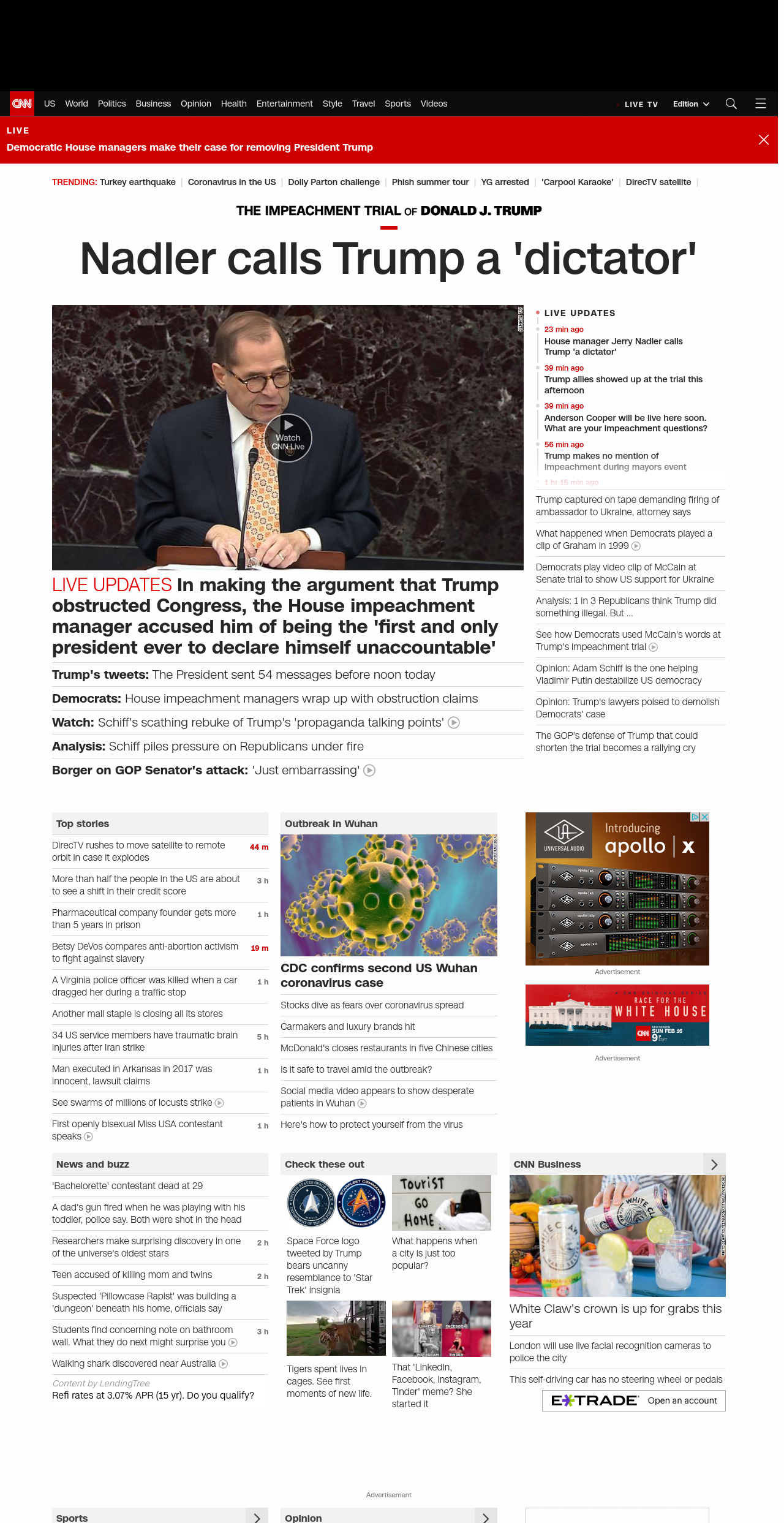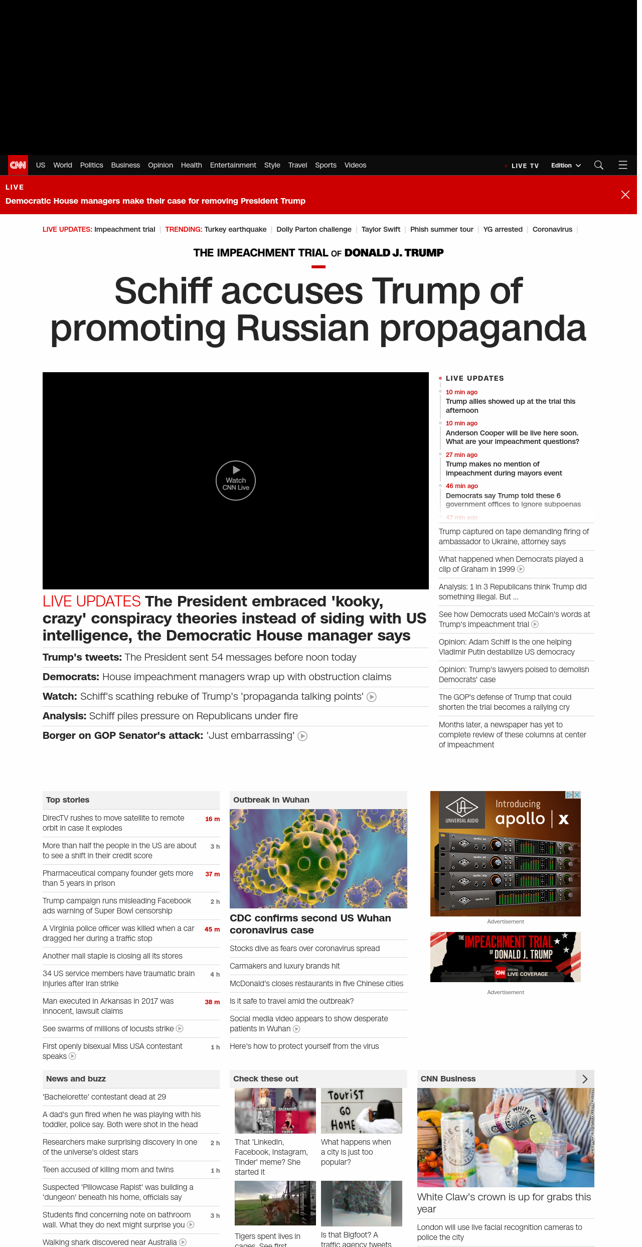 ” , title: “CNN – Breaking News, Latest News and Videos” , siblings: {“articleList”:[{“uri”:”/2020/01/24/politics/senate-impeachment-trial-day-4/index.html”,”headline”:”u003cstrong>Democrats: u003c/strong>House impeachment managers wrap up with obstruction claims”,”thumbnail”:”//cdn.cnn.com/cnnnext/dam/assets/200124121859-02-schiff-impeachment-managers-arrive-0123-small-11.jpg”,”duration”:””,”description”:”House Intelligence Chairman u003ca href=”https://www.cnn.com/2020/01/22/politics/adam-schiff-senate-impeachment-trial-2020/index.html” target=”_blank”>Adam Schiff u003c/a>and the u003ca href=”https://www.cnn.com/2020/01/15/politics/what-is-an-impeachment-manager-explainer/index.html” target=”_blank”>impeachment managers u003c/a>finish their opening arguments on Friday in what’s their final chance to make an uninterrupted pitch to senators on the fence that they should hear from more witnesses in the impeachment trial of President Donald Trump.”,”layout”:””