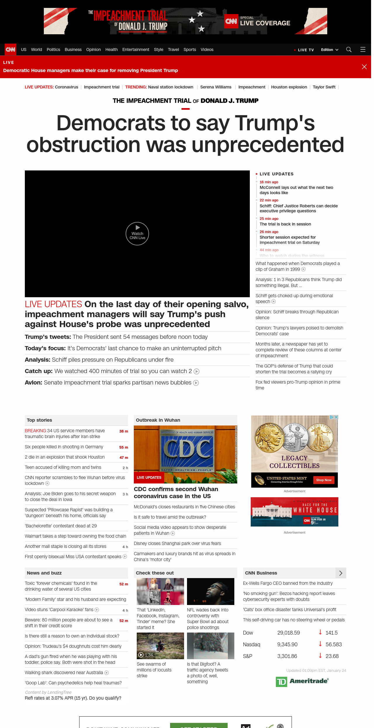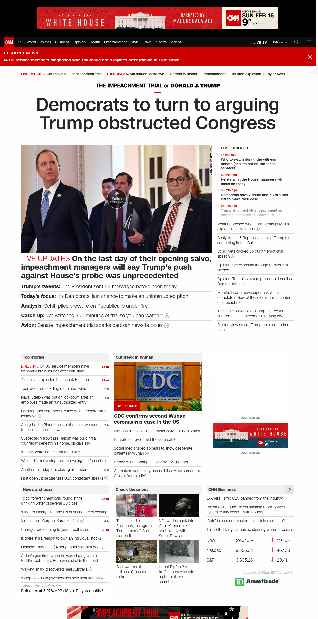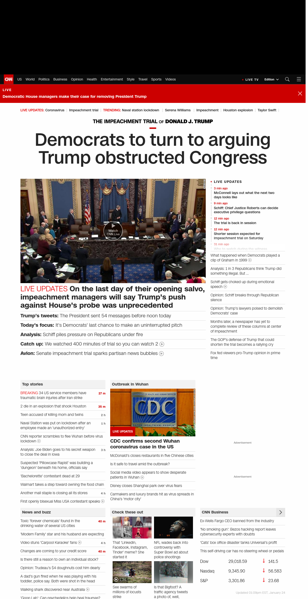 ” , title: “CNN – Breaking News, Latest News and Videos” , siblings: {“articleList”:[{“uri”:”/2020/01/24/politics/senate-impeachment-trial-day-4/index.html”,”headline”:”u003cstrong>Today’s focus: u003c/strong>It’s Democrats’ last chance to make an uninterrupted pitch”,”thumbnail”:”//cdn.cnn.com/cnnnext/dam/assets/200124121859-02-schiff-impeachment-managers-arrive-0123-small-11.jpg”,”duration”:””,”description”:”House Intelligence Chairman u003ca href=”https://www.cnn.com/2020/01/22/politics/adam-schiff-senate-impeachment-trial-2020/index.html” target=”_blank”>Adam Schiff u003c/a>and the u003ca href=”https://www.cnn.com/2020/01/15/politics/what-is-an-impeachment-manager-explainer/index.html” target=”_blank”>impeachment managers u003c/a>finish their opening arguments on Friday in what’s their final chance to make an uninterrupted pitch to senators on the fence that they should hear from more witnesses in the impeachment trial of President Donald Trump.”,”layout”:””