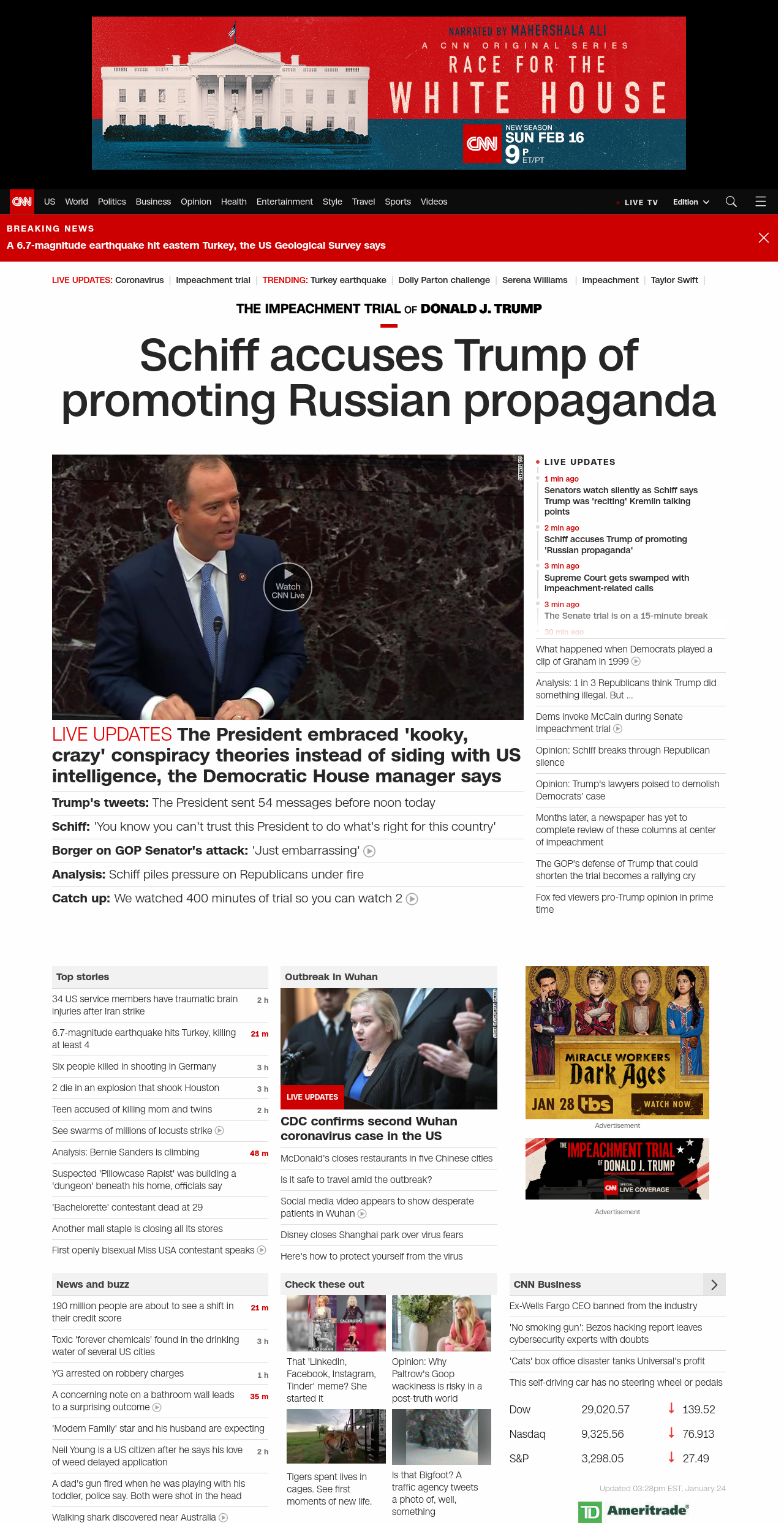 ” , title: “CNN – Breaking News, Latest News and Videos” , siblings: {“articleList”:[{“uri”:”/2020/01/24/politics/senate-impeachment-trial-day-4/index.html”,”headline”:”u003cstrong>Schiff: u003c/strong>’You know you can’t trust this President to do what’s right for this country'”,”thumbnail”:”//cdn.cnn.com/cnnnext/dam/assets/200124121859-02-schiff-impeachment-managers-arrive-0123-small-11.jpg”,”duration”:””,”description”:”House Intelligence Chairman u003ca href=”https://www.cnn.com/2020/01/22/politics/adam-schiff-senate-impeachment-trial-2020/index.html” target=”_blank”>Adam Schiff u003c/a>and the u003ca href=”https://www.cnn.com/2020/01/15/politics/what-is-an-impeachment-manager-explainer/index.html” target=”_blank”>impeachment managers u003c/a>finish their opening arguments on Friday in what’s their final chance to make an uninterrupted pitch to senators on the fence that they should hear from more witnesses in the impeachment trial of President Donald Trump.”,”layout”:””