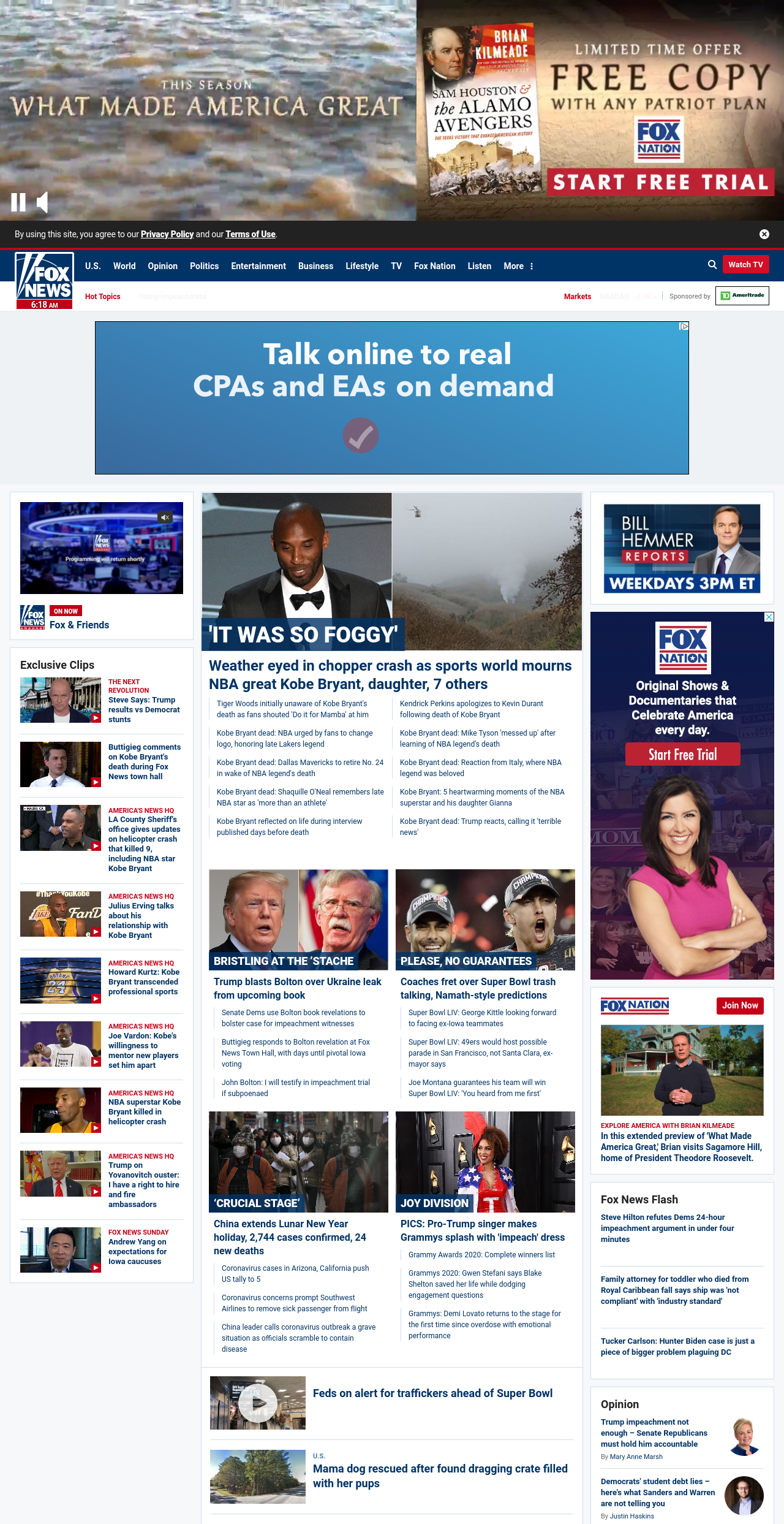 FN: [[' IT WAS SO FOGGY' ]] Weather eyed in chopper crash as sports world mourns NBA great Kobe Bryant, daughter, 7 others ((lubuntu at wor2))