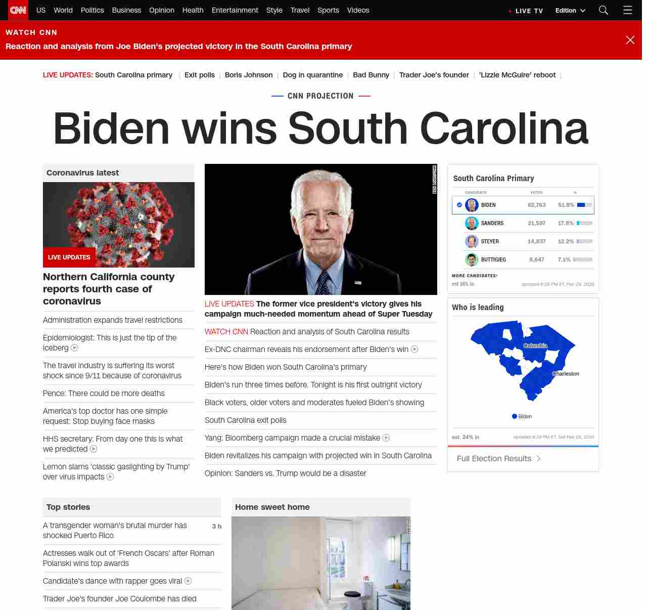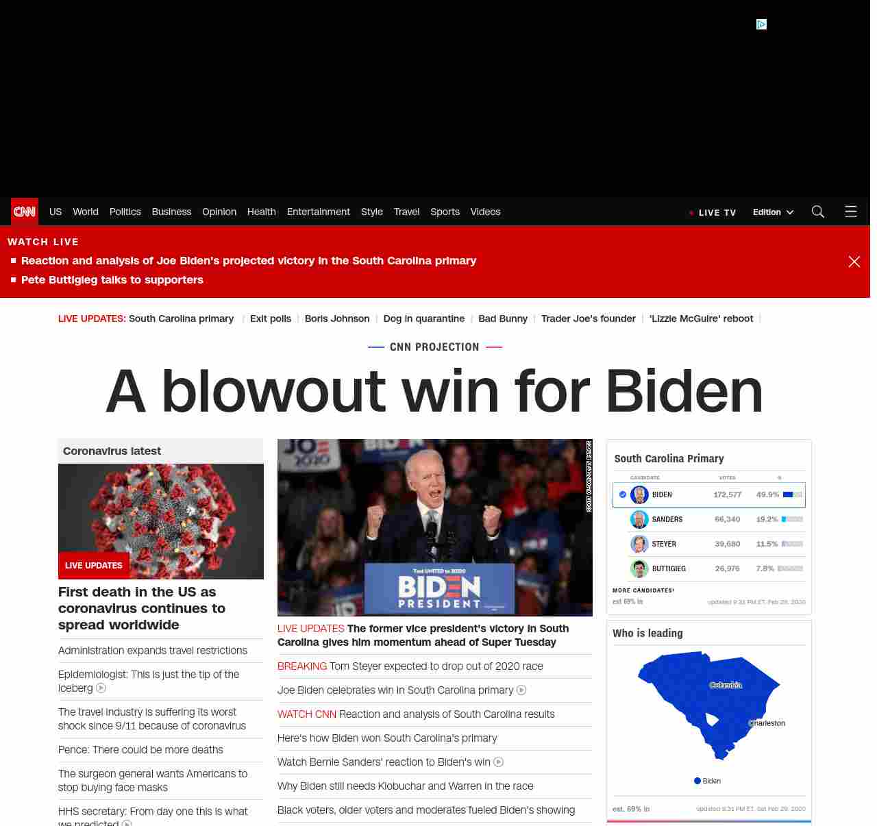 || banner-text–maximized banner-text-size–char-26″> Biden wins South Carolina ||” , title: “CNN – Breaking News, Latest News and Videos” , siblings: {“articleList”:[{“uri”:”/2020/02/29/health/us-coronavirus-saturday/index.html”,”headline”:”Administration expands travel restrictions”,”thumbnail”:”//cdn.cnn.com/cnnnext/dam/assets/200130165125-corona-virus-cdc-image-small-11.jpg”,”duration”:””,”description”:”There are now at least four u003ca href=”https://www.cnn.com/2020/02/28/health/coronavirus-us-updates-california-patient/index.html” target=”_blank”>US coronavirus casesu003c/a> without any related travel history, health officials say.”,”layout”:””