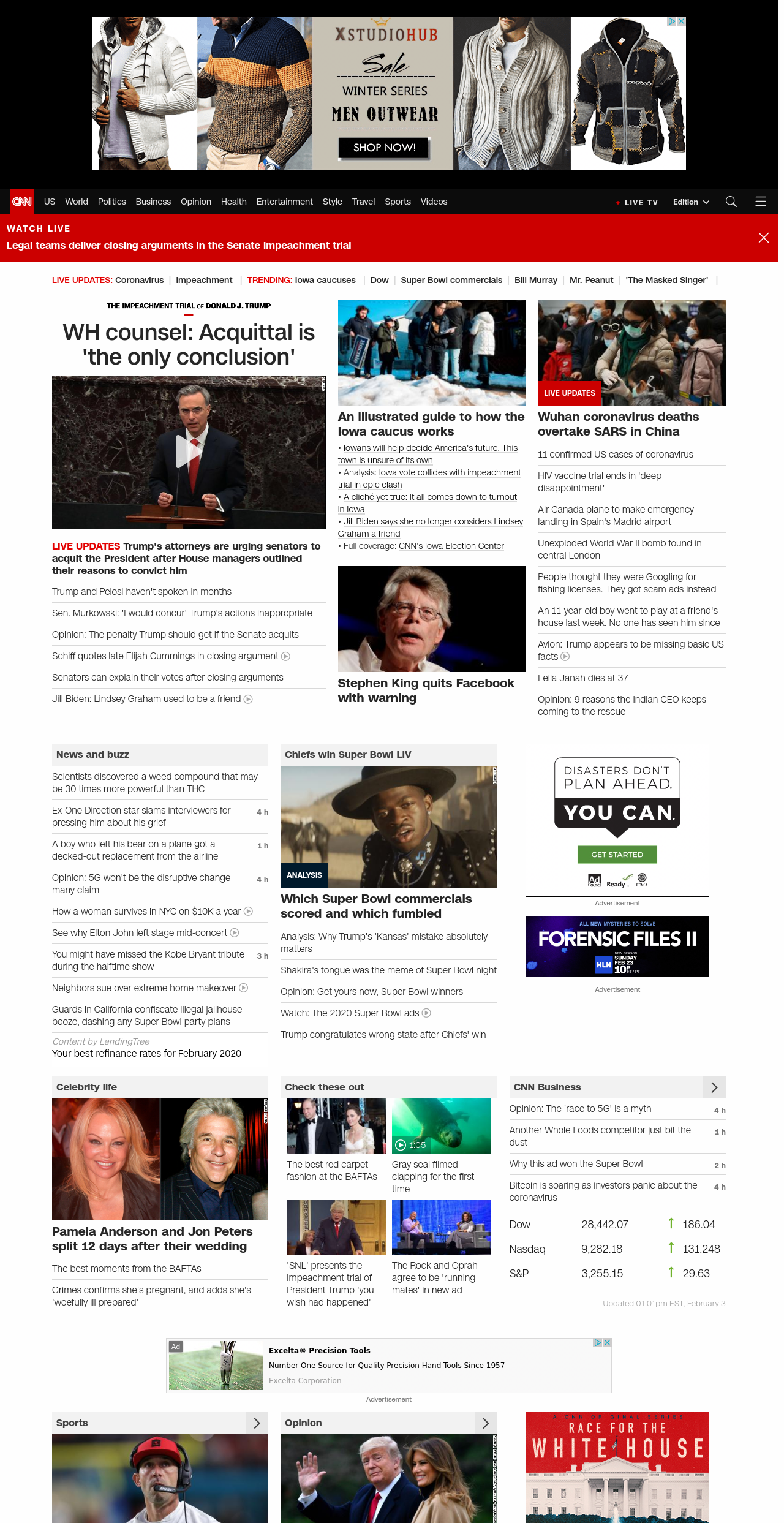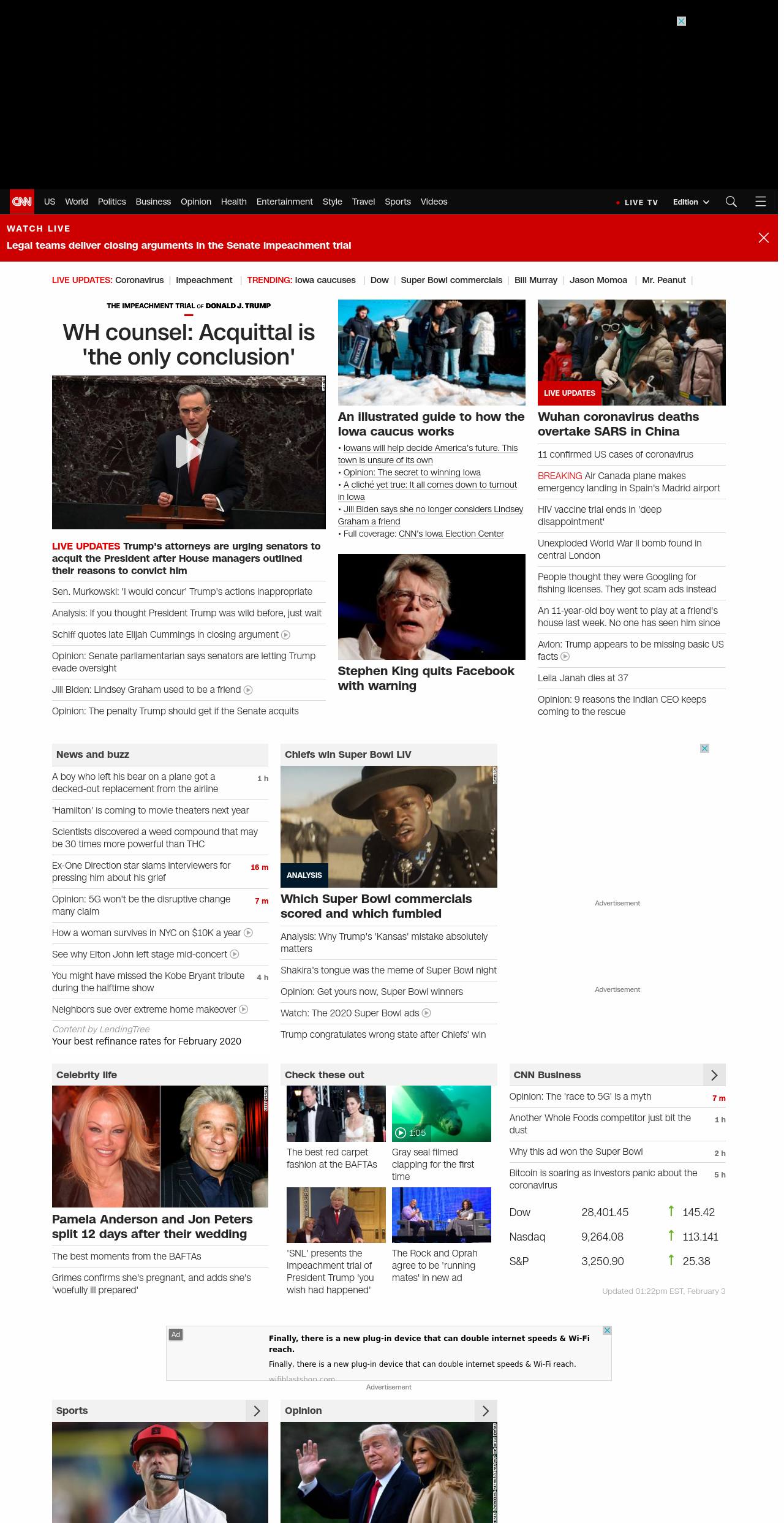 || WH counsel: Acquittal is ‘the only conclusion’ ||” , title: “CNN – Breaking News, Latest News and Videos” , siblings: {“articleList”:[{“uri”:”/2020/02/03/politics/donald-trump-impeachment/index.html”,”headline”:”Analysis: If you thought President Trump was wild before, just wait”,”thumbnail”:”//cdn.cnn.com/cnnnext/dam/assets/200203075930-donald-trump-small-11.jpg”,”duration”:””,”description”:”When President Bill Clinton was acquitted by the Senate following an impeachment trial in 1999, he apologized to the American public for his conduct. When President Donald Trump is almost assuredly acquitted on Wednesday in his own impeachment trial, he will take a victory lap.”,”layout”:””