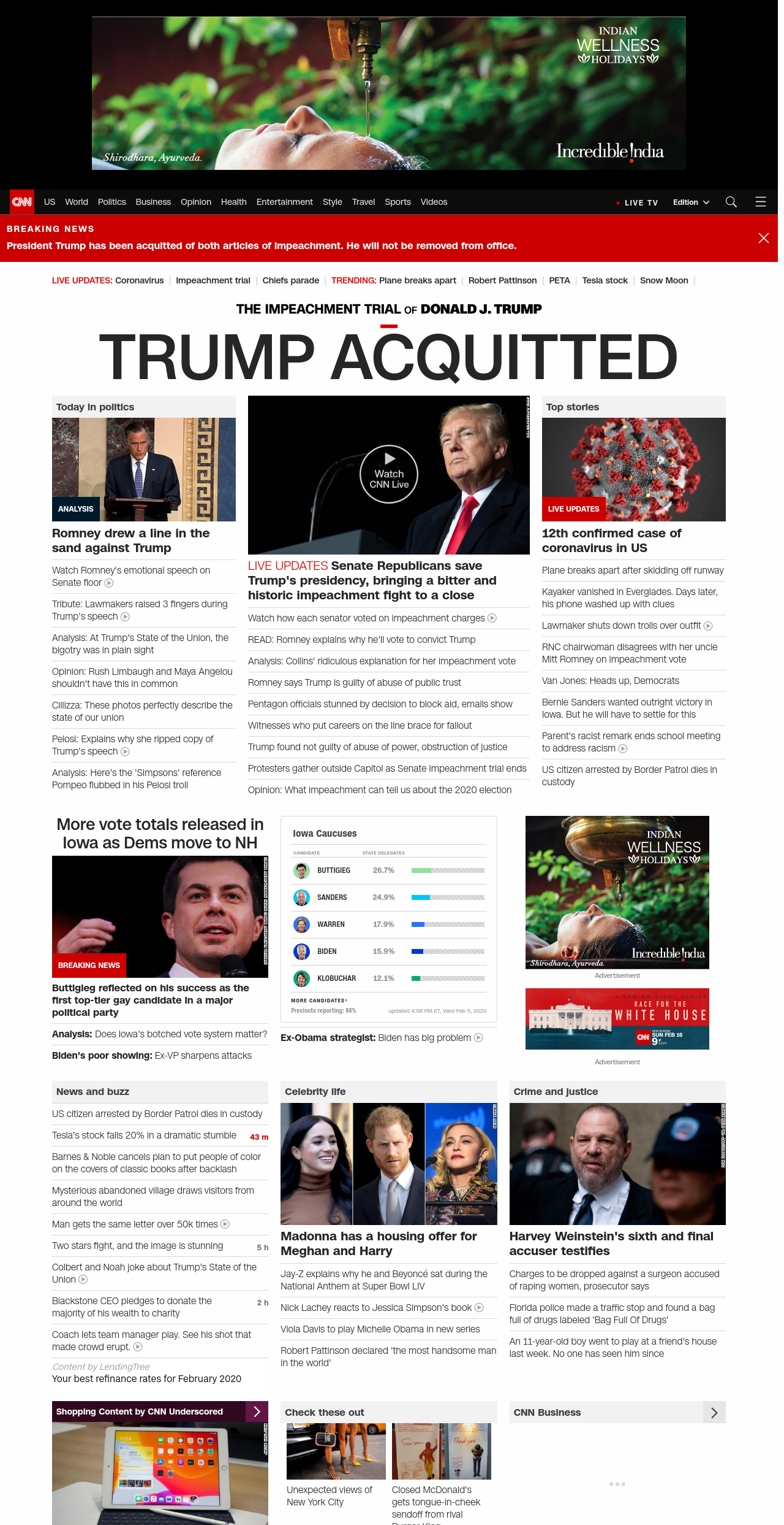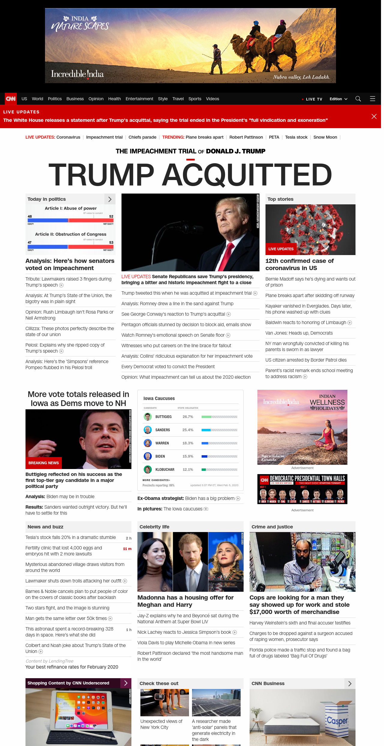 || TRUMP ACQUITTED ||” , title: “CNN – Breaking News, Latest News and Videos” , siblings: {“articleList”:[{“uri”:”/2020/02/05/politics/impeachment-watch-february-5/index.html”,”headline”:”u003cstrong>Analysis: Here’s how senators voted on impeachmentu003c/strong>”,”thumbnail”:”//cdn.cnn.com/cnnnext/dam/assets/200205172004-20200205-impeachment-vote-chart-small-11.jpg”,”duration”:””,”description”:”u003ca href=”https://www.cnn.com/election/2020/candidate/trump” target=”_blank”>President Donald Trumpu003c/a> was acquitted Wednesday by the US Senate of u003ca href=”https://www.cnn.com/2020/02/05/politics/senate-impeachment-trial-vote-acquittal/index.html” target=”_blank”>the two impeachment counts passed by the Houseu003c/a>: abuse of power and obstruction of Congress.”,”layout”:””