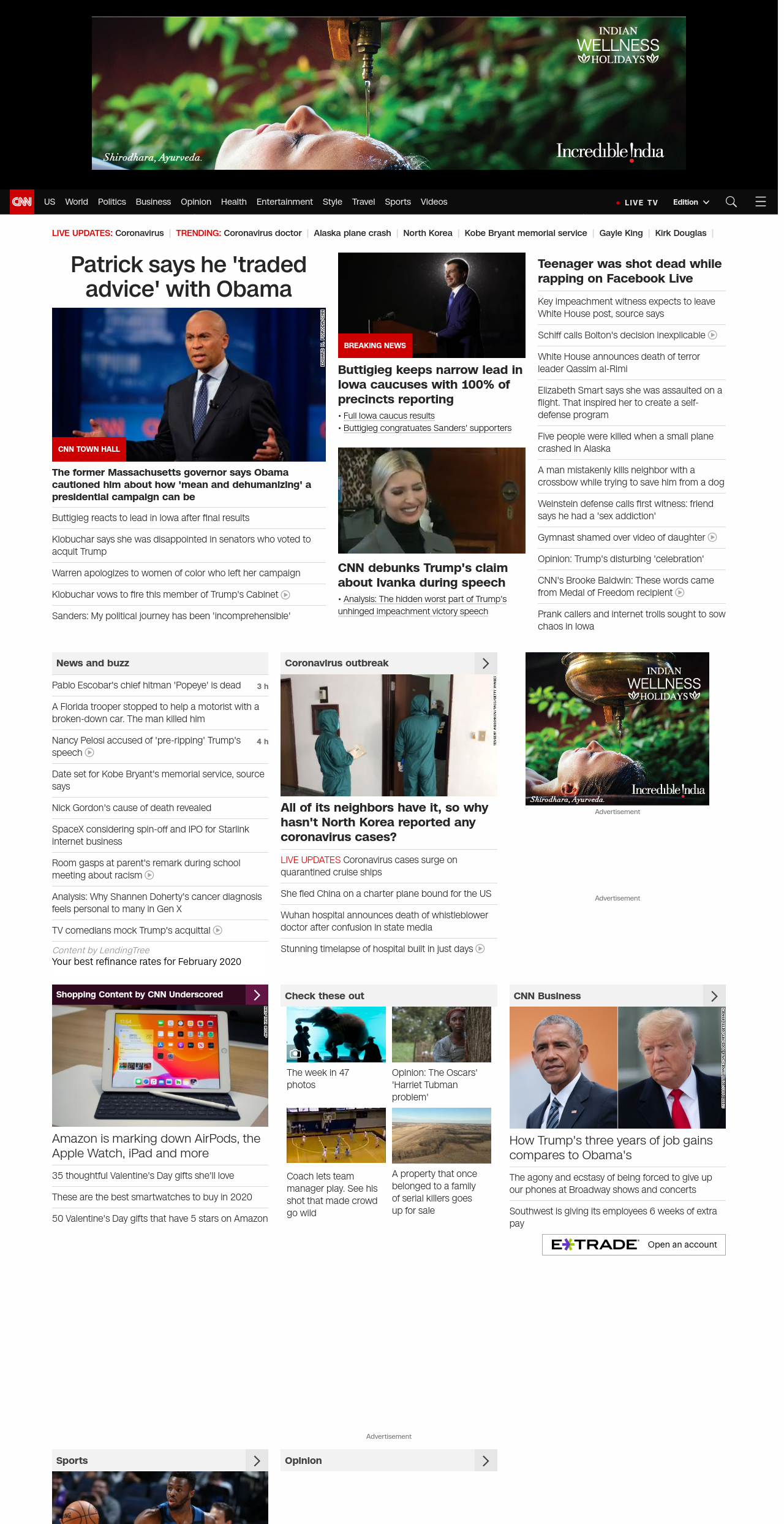 || Patrick says he ‘traded advice’ with Obama ||” , title: “CNN – Breaking News, Latest News and Videos” , siblings: {“articleList”:[{“uri”:”/politics/live-news/cnn-02-06-20/index.html”,”headline”:”u003cstrong>The former Massachusetts governor says Obama cautioned him about how ‘mean and dehumanizing’ a presidential campaign can beu003c/strong>”,”thumbnail”:”//cdn.cnn.com/cnnnext/dam/assets/200206230703-04-deval-patrick-town-hall-0206-small-11.jpg”,”duration”:””,”description”:”⢠u003ca href=”https://www.cnn.com/election/2020/state/iowa” target=”_blank”>Full Iowa caucuses resultsu003c/a>u003cbr />⢠u003ca href=”https://www.cnn.com/2020/02/06/politics/iowa-caucus-results/index.html” target=”_blank”>DNC chair calls for a recanvass in Iowau003c/a>u003cbr />â¢u003ca href=”https://www.cnn.com/2020/02/06/opinions/democratic-new-hampshire-primary-up-for-grabs-guild/index.html” target=”_blank”> Opinion: NH primary is still up for grabsu003c/a>u003cbr />⢠u003ca href=”https://www.cnn.com/2020/02/06/politics/iowa-caucus-prank-callers-chaos/index.html” target=”_blank”>Prank callers and internet trolls sought to sow chaos on Iowa caucus nightu003c/a>”,”layout”:””