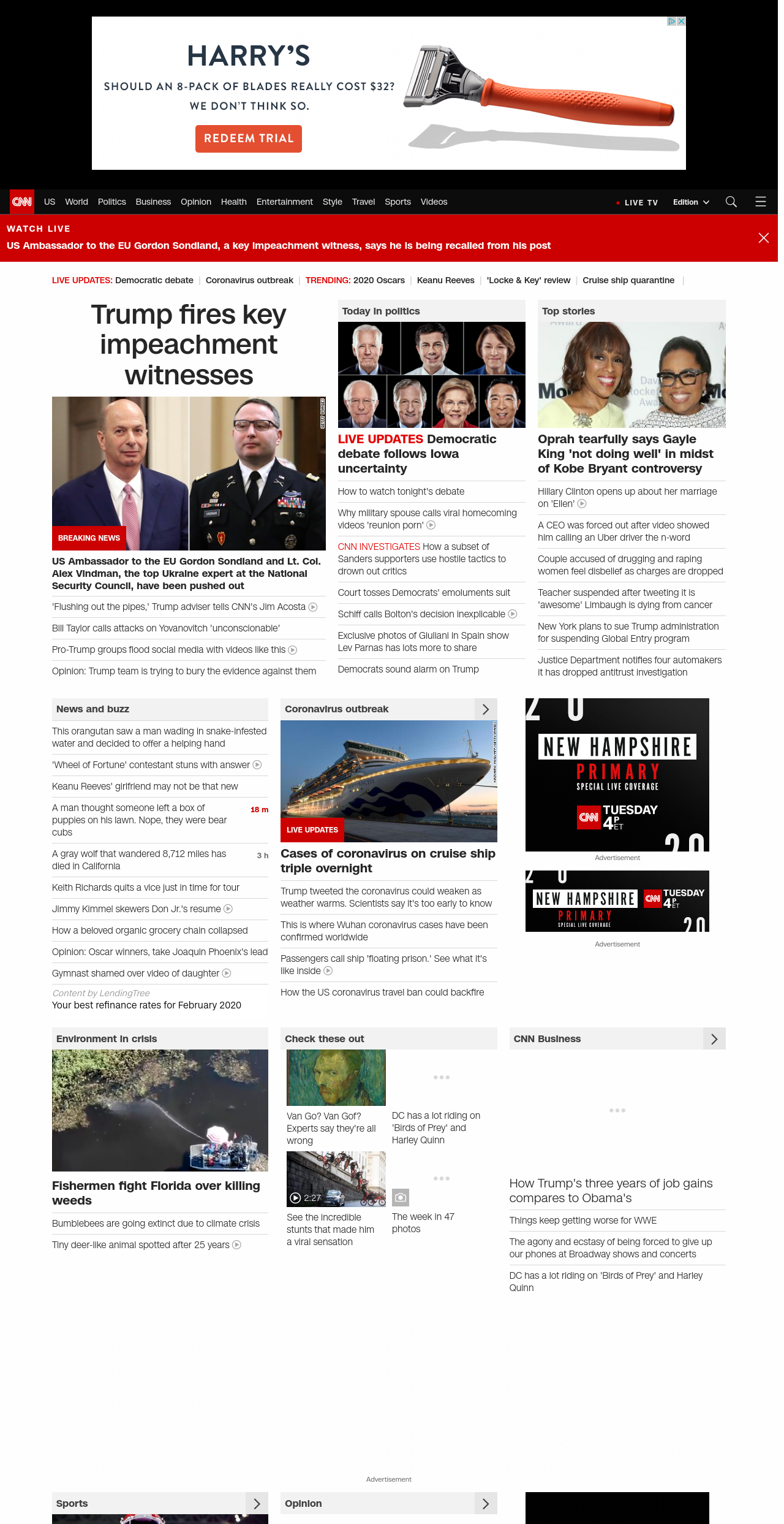 || Trump fires key impeachment witnesses ||” , title: “CNN – Breaking News, Latest News and Videos” , siblings: {“articleList”:[{“uri”:”/2020/02/07/politics/alex-vindman-donald-trump-impeachment/index.html”,”headline”:”u003cstrong>US Ambassador to the EU Gordon Sondland and Lt. Col. Alex Vindman, the top Ukraine expert at the National Security Council, have been pushed outu003c/strong>”,”thumbnail”:”//cdn.cnn.com/cnnnext/dam/assets/200207190802-sondland-vindman-split-small-11.jpg”,”duration”:””,”description”:”u003ca href=”http://www.cnn.com/2020/02/06/politics/alexander-vindman-white-house-national-security-council/index.html” target=”_blank”>Lt. Col. Alex Vindmanu003c/a>, the top Ukraine expert at the National Security Council, was pushed out of his role Friday months earlier than expected, according to a statement from his attorney. Vindman was not slated to leave until July, but had been telling colleagues in recent weeks he would likely leave soon. It was not his decision to leave, however, according to one person familiar with the situation. “,”layout”:””