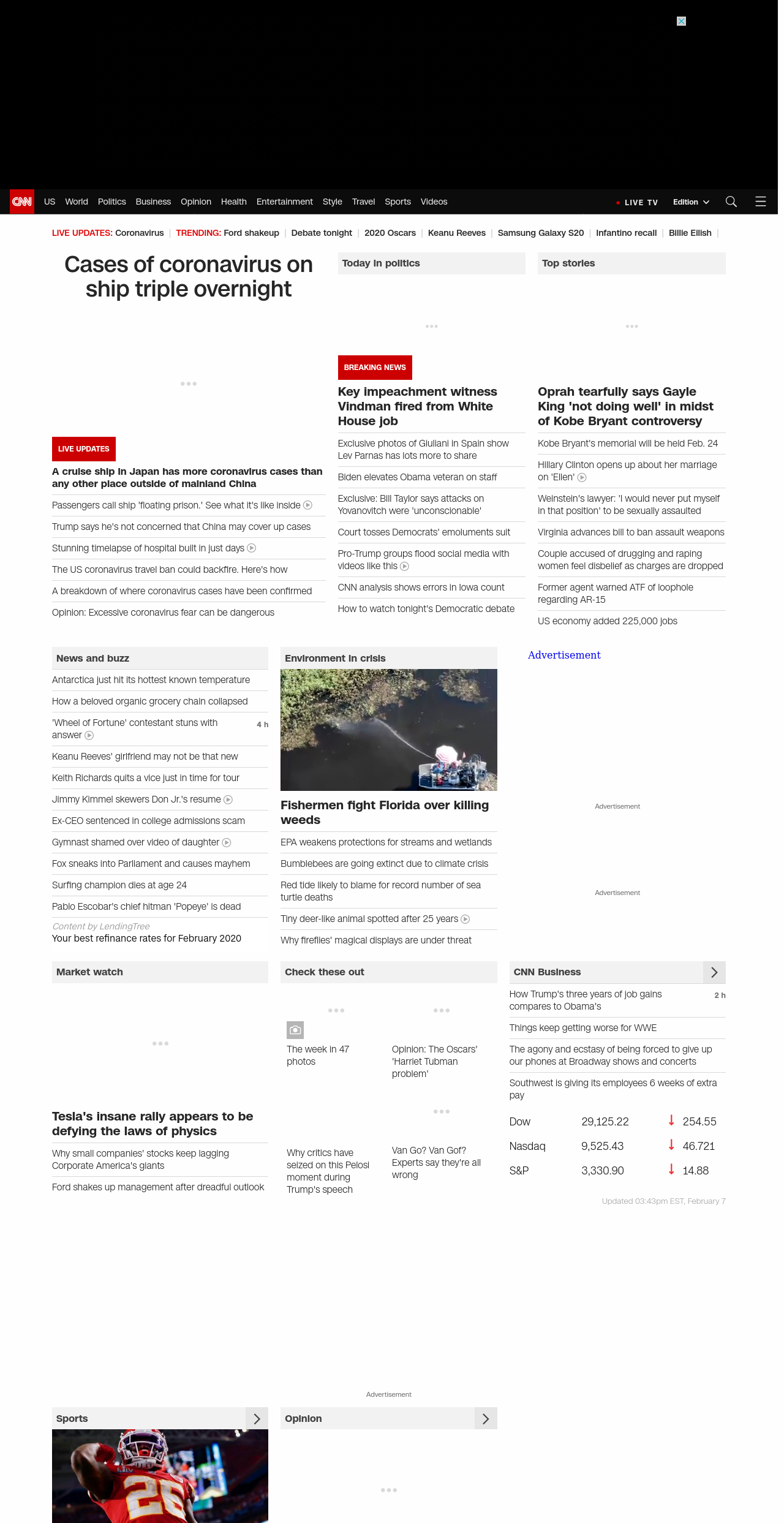 || Cases of coronavirus on ship triple overnight ||” , title: “CNN – Breaking News, Latest News and Videos” , siblings: {“articleList”:[{“uri”:”/videos/world/2020/02/07/coronavirus-diamond-princess-quarantined-cruise-ship-us-patient-ripley-pkg-intl-ldn-vpx.cnn”,”headline”:”Passengers call ship ‘floating prison.’ See what it’s like inside”,”thumbnail”:”//cdn.cnn.com/cnnnext/dam/assets/200207115420-rebecca-frasure-diamond-princess-screenshot-small-11.jpg”,”duration”:”02:36″,”description”:”The Diamond Princess cruise ship has been quarantined off the coast of Yokohama, near Tokyo, since February 4. Rebecca Frasure, who has tested positive for coronavirus, is one of 428 US citizens aboard the ship. u003ca href=”https://edition.cnn.com/profiles/will-ripley” target=”_blank”>CNN’s Will Ripleyu003c/a> reports.”,”layout”:””,”iconType”:”video”