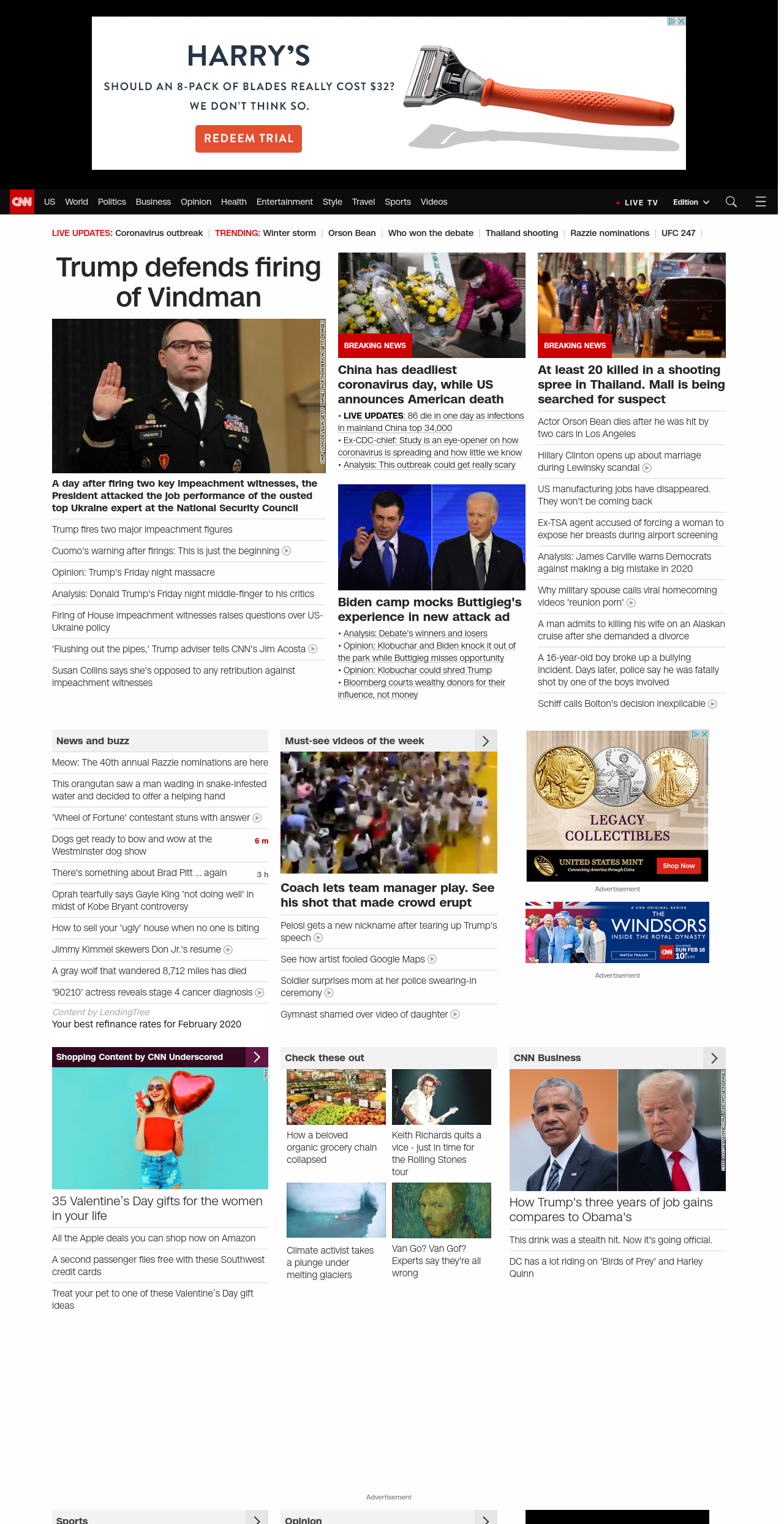 || Trump defends firing of Vindman ||” , title: “CNN – Breaking News, Latest News and Videos” , siblings: {“articleList”:[{“uri”:”/2020/02/08/politics/trump-alexander-vindman-firing-ukraine-impeachment/index.html”,”headline”:”u003cstrong>A day after firing two key impeachment witnesses, the President attacked the job performance of the ousted top Ukraine expert at the National Security Councilu003c/strong>”,”thumbnail”:”//cdn.cnn.com/cnnnext/dam/assets/200207175708-vindman-for-vinograd-oped-2-7-20-small-11.jpg”,”duration”:””,”description”:”u003ca href=”https://www.cnn.com/specials/politics/president-donald-trump-45″ target=”_blank”>President Donald Trumpu003c/a> on Saturday defended the u003ca href=”https://www.cnn.com/2020/02/06/politics/alexander-vindman-white-house-national-security-council/index.html” target=”_blank”>firing of Lt. Col. Alexander Vindmanu003c/a> from the National Security Council. “,”layout”:””