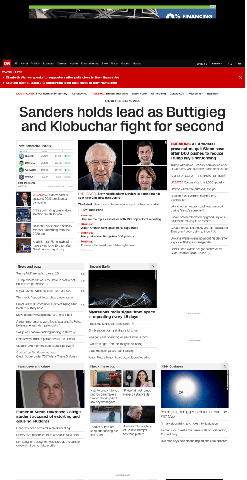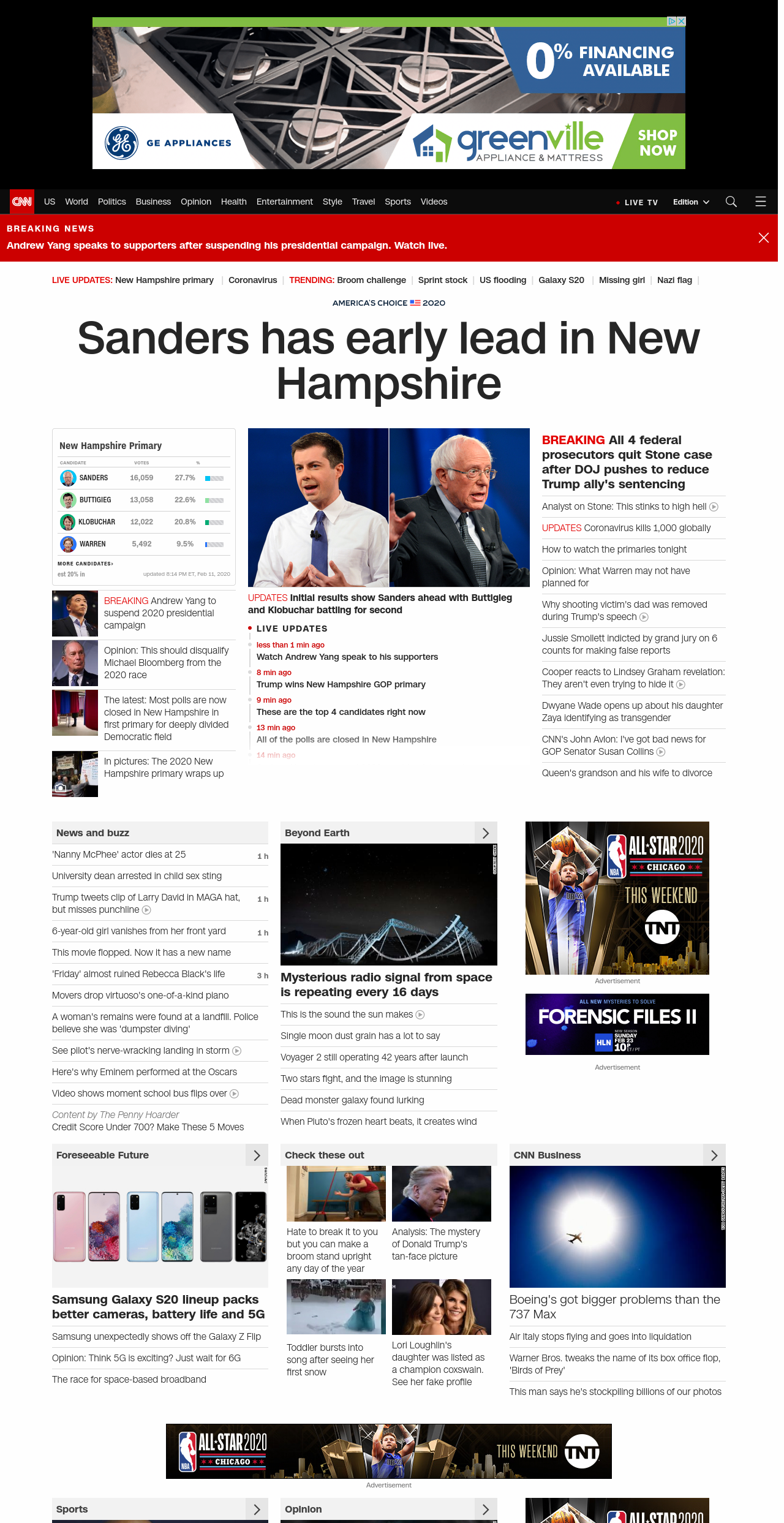 || Sanders has early lead in New Hampshire ||” , title: “CNN – Breaking News, Latest News and Videos” , siblings: {“articleList”:[{“uri”:”/2020/02/11/politics/andrew-yang-ends-2020-presidential-campaign/index.html”,”headline”:”Andrew Yang to suspend 2020 presidential campaign”,”thumbnail”:”//cdn.cnn.com/cnnnext/dam/assets/200211162506-102-andrew-yang-lead-image-small-11.jpg”,”duration”:””,”description”:”u003ca href=”https://www.cnn.com/election/2020/candidate/yang” target=”_blank”>Andrew Yangu003c/a> plans to announce he is suspending his presidential campaign during a speech Tuesday night in New Hampshire, two sources tell CNN.”,”layout”:””