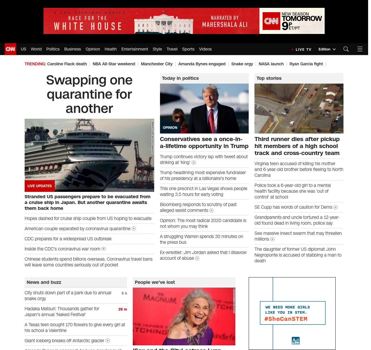 CNN: “:”u003cstrong>Passengers stuck on a Diamond Princess cruise ship in Japan due to the coronavirus outbreak are swapping one quarantine for anotheru003c/strong>”, “BANNER=|pagerendered| ((lubuntu at wor2))