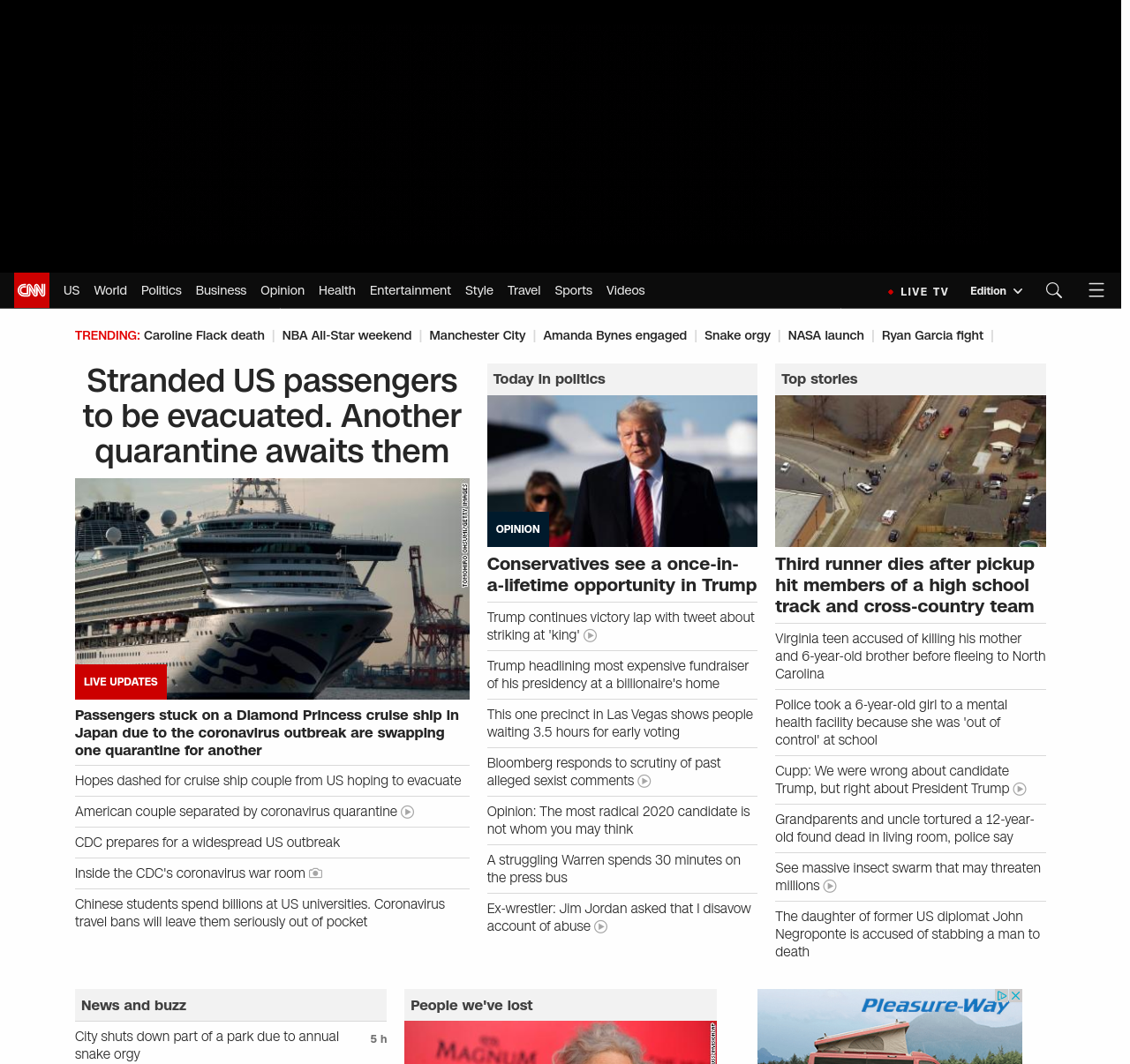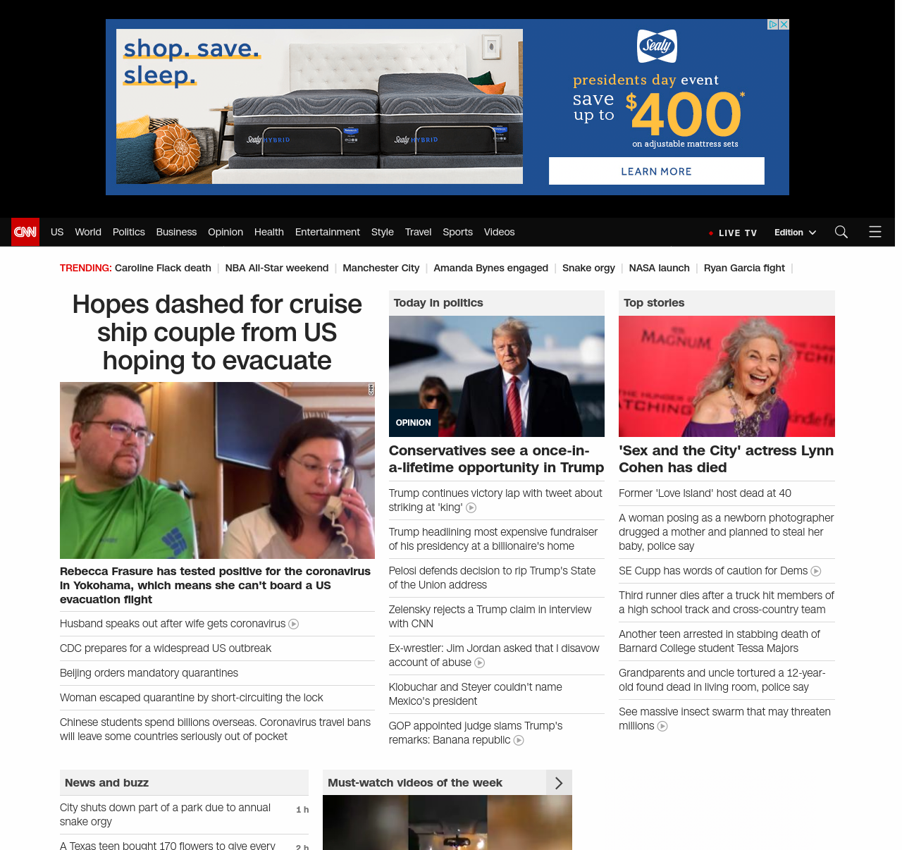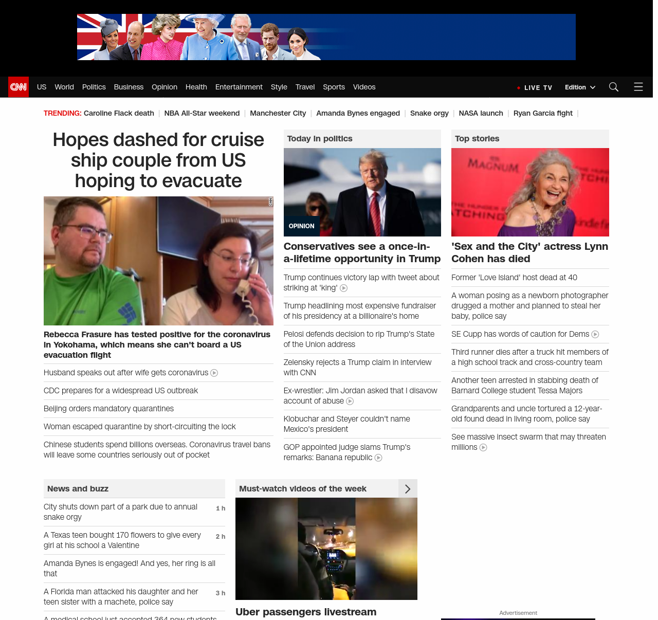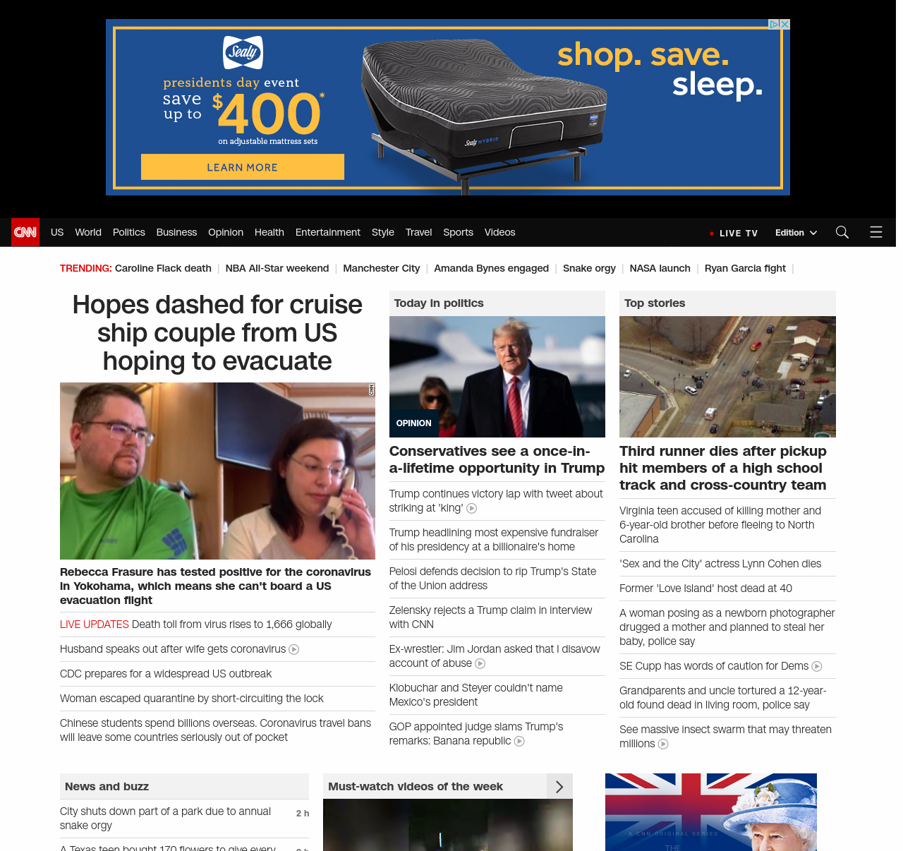 || screaming-banner-text banner-text-size–char-47″ data-analytics=”_list-hierarchical-xs_hyperlink_”> Hopes dashed for cruise ship couple from US hoping to evacuate ||” , title: “CNN – Breaking News, Latest News and Videos” , siblings: {“articleList”:[{“uri”:”/asia/live-news/coronavirus-outbreak-02-16-20-intl-hnk/index.html”,”headline”:”Death toll from virus rises to 1,666 globally”,”thumbnail”:”//cdn.cnn.com/cnnnext/dam/assets/200214185444-02-coronavirus-0214-beijing-small-11.jpg”,”duration”:””,”description”:””,”layout”:””