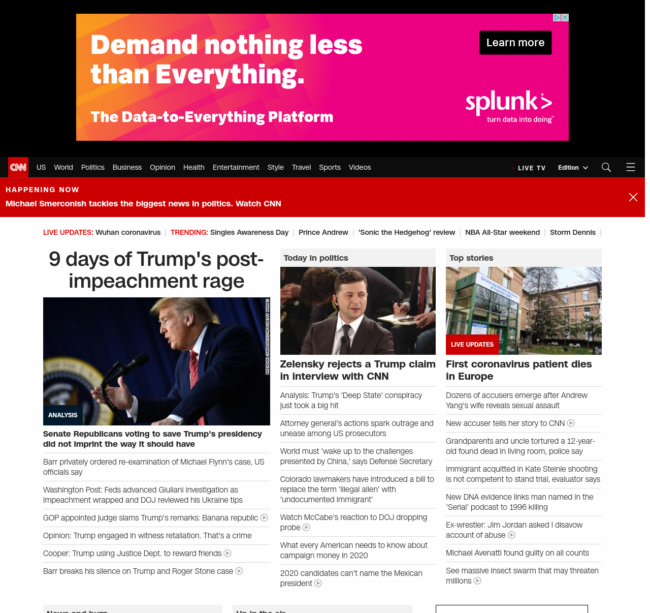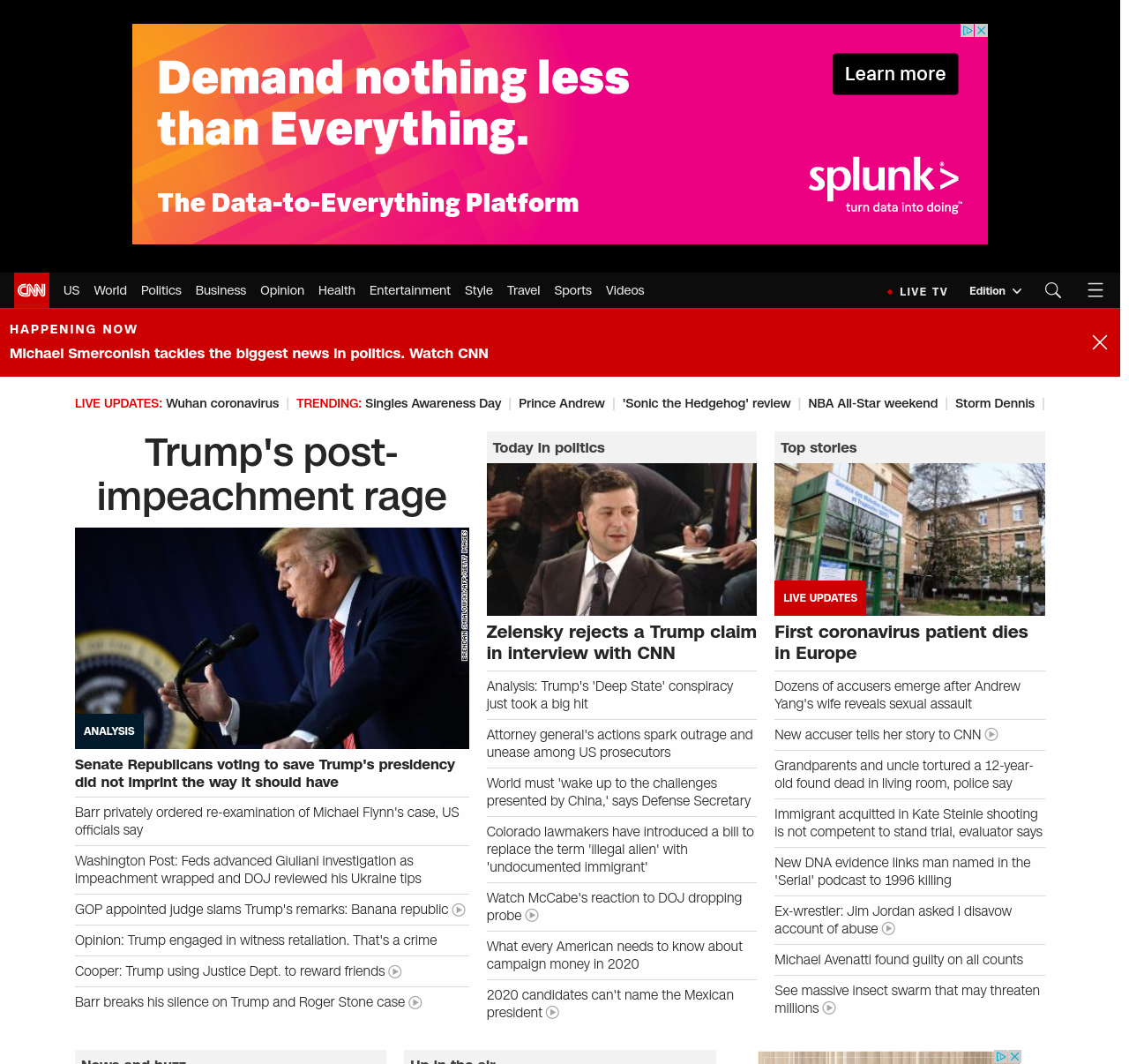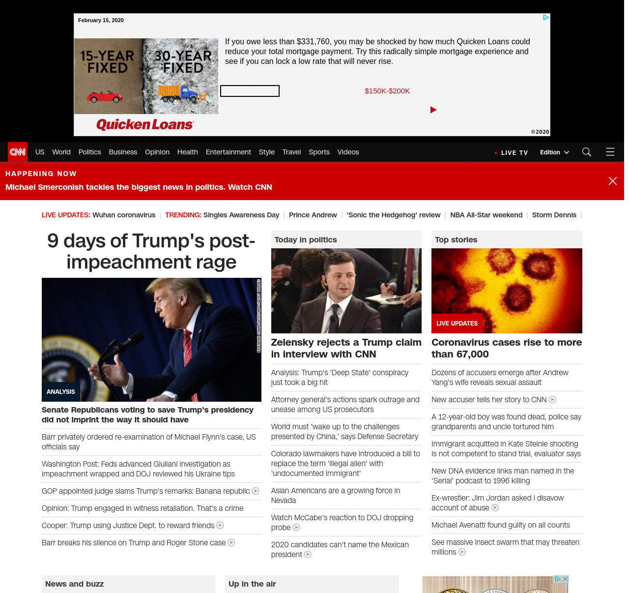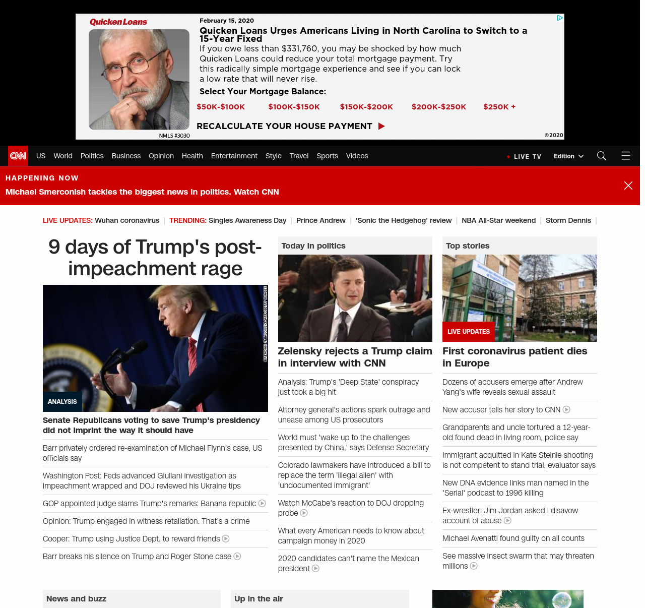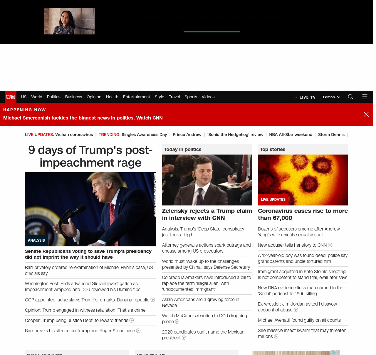 || screaming-banner-text banner-text-size–char-41″ data-analytics=”_list-hierarchical-xs_article_”> 9 days of Trump’s post-impeachment rage ||” , title: “CNN – Breaking News, Latest News and Videos” , siblings: {“articleList”:[{“uri”:”/2020/02/15/politics/what-matters-february-14/index.html”,”headline”:”u003cstrong>Senate Republicans voting to save Trump’s presidency did not imprint the way it should haveu003c/strong>”,”thumbnail”:”//cdn.cnn.com/cnnnext/dam/assets/200214151753-trump-border-patrol-0214-small-11.jpg”,”duration”:””,”description”:”It’s easy to forget how crazy this is. Every week of Donald Trump’s presidency has felt like its own self-contained saga, but even by those dramatic standards, it’s almost incomprehensible that his impeachment acquittal was only nine days ago.”,”layout”:””