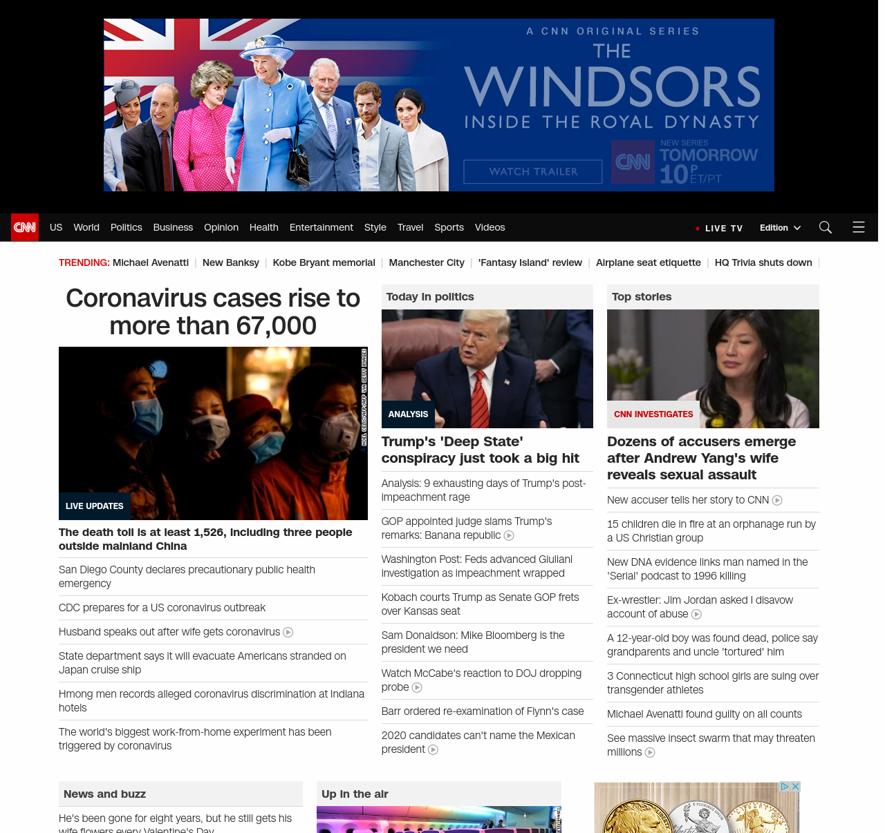 || screaming-banner-text banner-text-size–char-44″ data-analytics=”_list-hierarchical-xs_article_”> Coronavirus cases rise to more than 67,000 ||” , title: “CNN – Breaking News, Latest News and Videos” , siblings: {“articleList”:[{“uri”:”/asia/live-news/coronavirus-outbreak-02-15-20-intl-hnk/index.html”,”headline”:”u003cstrong>The death toll is at least 1,526, including three people outside mainland Chinau003c/strong>”,”thumbnail”:”//cdn.cnn.com/cnnnext/dam/assets/200215092904-0214-coronavirus-shanghai-small-11.jpeg”,”duration”:””,”description”:””,”layout”:””