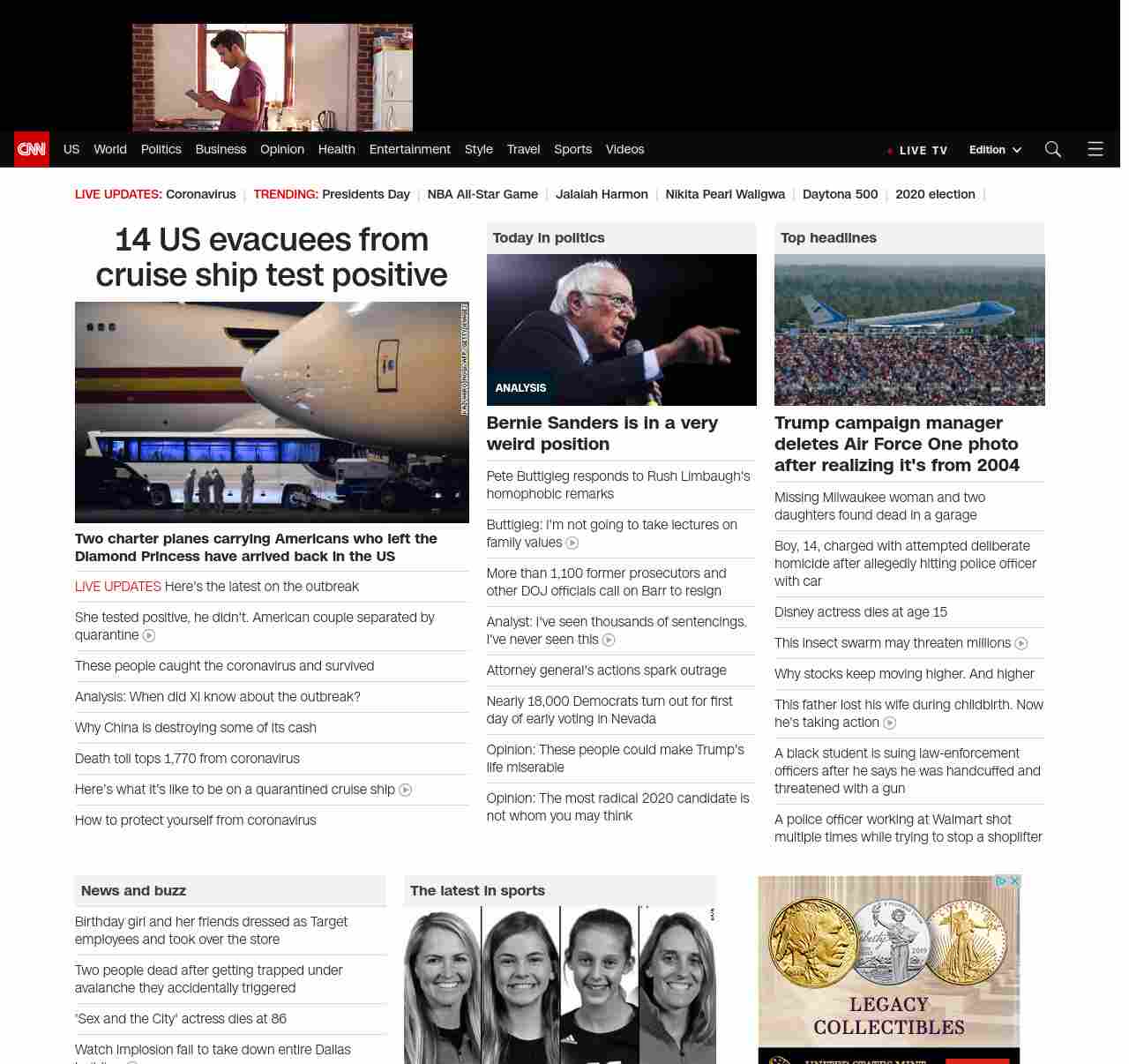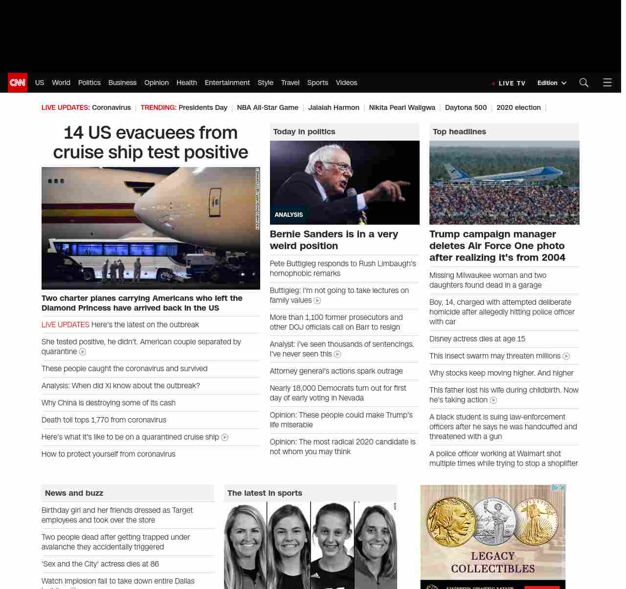 || screaming-banner-text banner-text-size–char-47″ data-analytics=”_list-hierarchical-xs_article_”> 14 US evacuees from cruise ship test positive ||” , title: “CNN – Breaking News, Latest News and Videos” , siblings: {“articleList”:[{“uri”:”/2020/02/17/health/evacuated-passengers-test-positive-coronavirus/index.html”,”headline”:”u003cstrong>Two charter planes carrying Americans who left the Diamond Princess have arrived back in the USu003c/strong>”,”thumbnail”:”//cdn.cnn.com/cnnnext/dam/assets/200217025552-02-coronavirus-us-plane-0216-japan-small-11.jpg”,”duration”:””,”description”:”Fourteen passengers aboard US chartered flights evacuating Americans and their families from the Diamond Princess cruise ship have tested positive foru003ca href=”https://www.cnn.com/specials/asia/coronavirus-outbreak-intl-hnk” target=”_blank”> novel coronavirusu003c/a>, according to a joint statement from the US Departments of State and Health and Human Services.”,”layout”:””