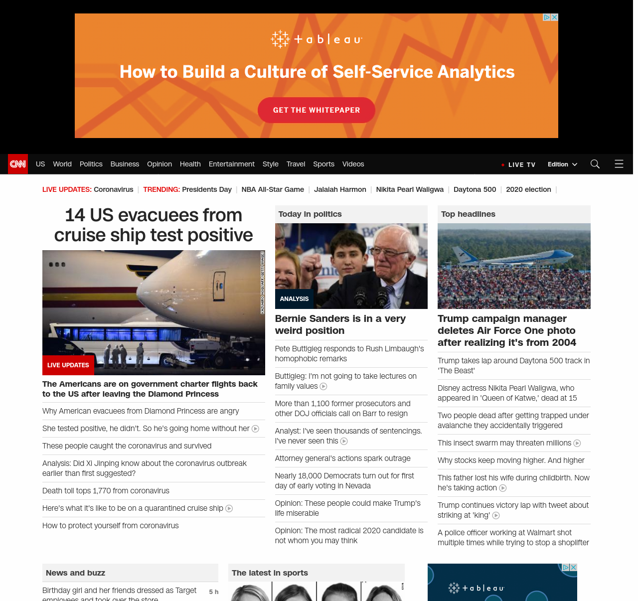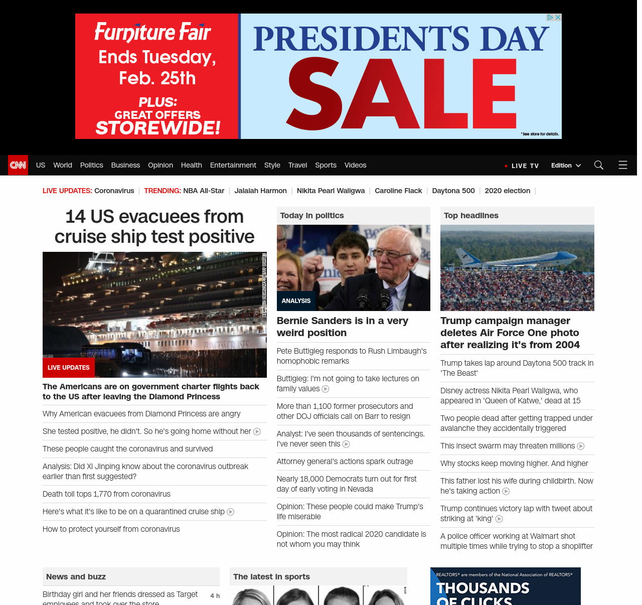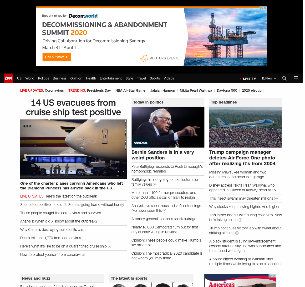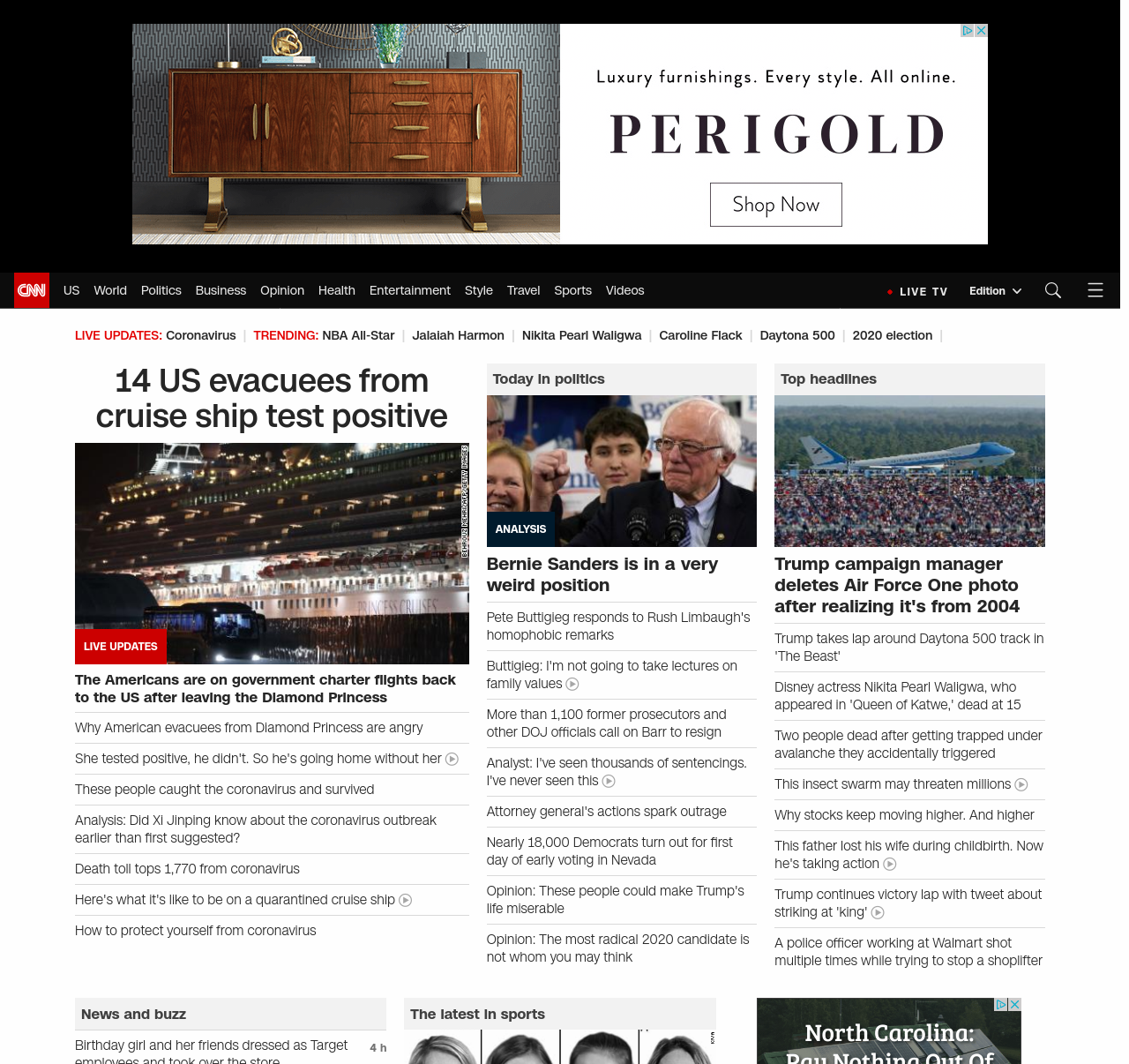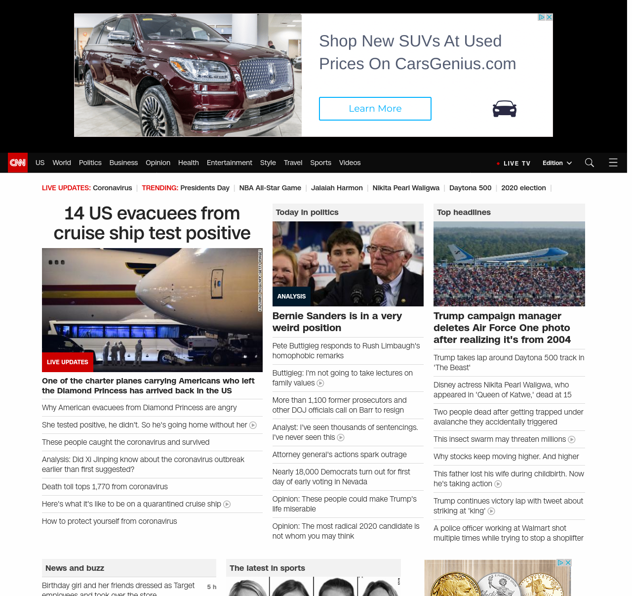|| screaming-banner-text banner-text-size–char-47″ data-analytics=”_list-hierarchical-xs_article_”> 14 US evacuees from cruise ship test positive ||” , title: “CNN – Breaking News, Latest News and Videos” , siblings: {“articleList”:[{“uri”:”/2020/02/17/health/evacuated-passengers-test-positive-coronavirus/index.html”,”headline”:”u003cstrong>One of the charter planes carrying Americans who left the Diamond Princess has arrived back in the USu003c/strong>”,”thumbnail”:”//cdn.cnn.com/cnnnext/dam/assets/200217025552-02-coronavirus-us-plane-0216-japan-small-11.jpg”,”duration”:””,”description”:”Fourteen passengers aboard US chartered flights evacuating Americans and their families from the Diamond Princess cruise ship have tested positive foru003ca href=”https://www.cnn.com/specials/asia/coronavirus-outbreak-intl-hnk” target=”_blank”> novel coronavirusu003c/a>, according to a joint statement from the US Departments of State and Health and Human Services.”,”layout”:””
