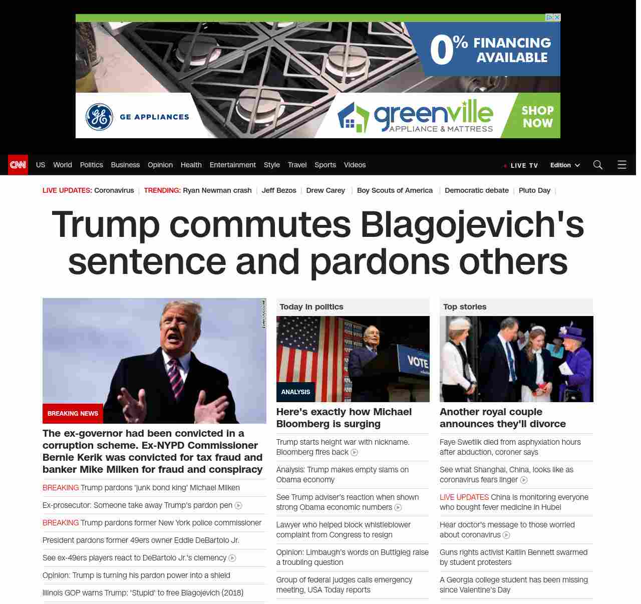 || banner-text–natural”> Trump commutes Blagojevich’s sentence and pardons others ||” , title: “CNN – Breaking News, Latest News and Videos” , siblings: {“articleList”:[{“uri”:”/2020/02/18/politics/bernie-kerik-trump-pardon/index.html”,”headline”:”Trump pardons former New York police commissioner”,”thumbnail”:”//cdn.cnn.com/cnnnext/dam/assets/190930154134-03-trump-0930-small-11.jpg”,”duration”:””,”description”:”President Donald Trump has pardoned former New York police commissioner Bernie Kerik, he announced at Joint Base Andrews on Tuesday.”,”layout”:””