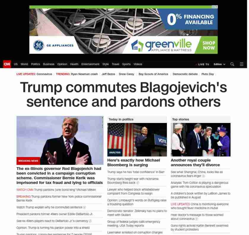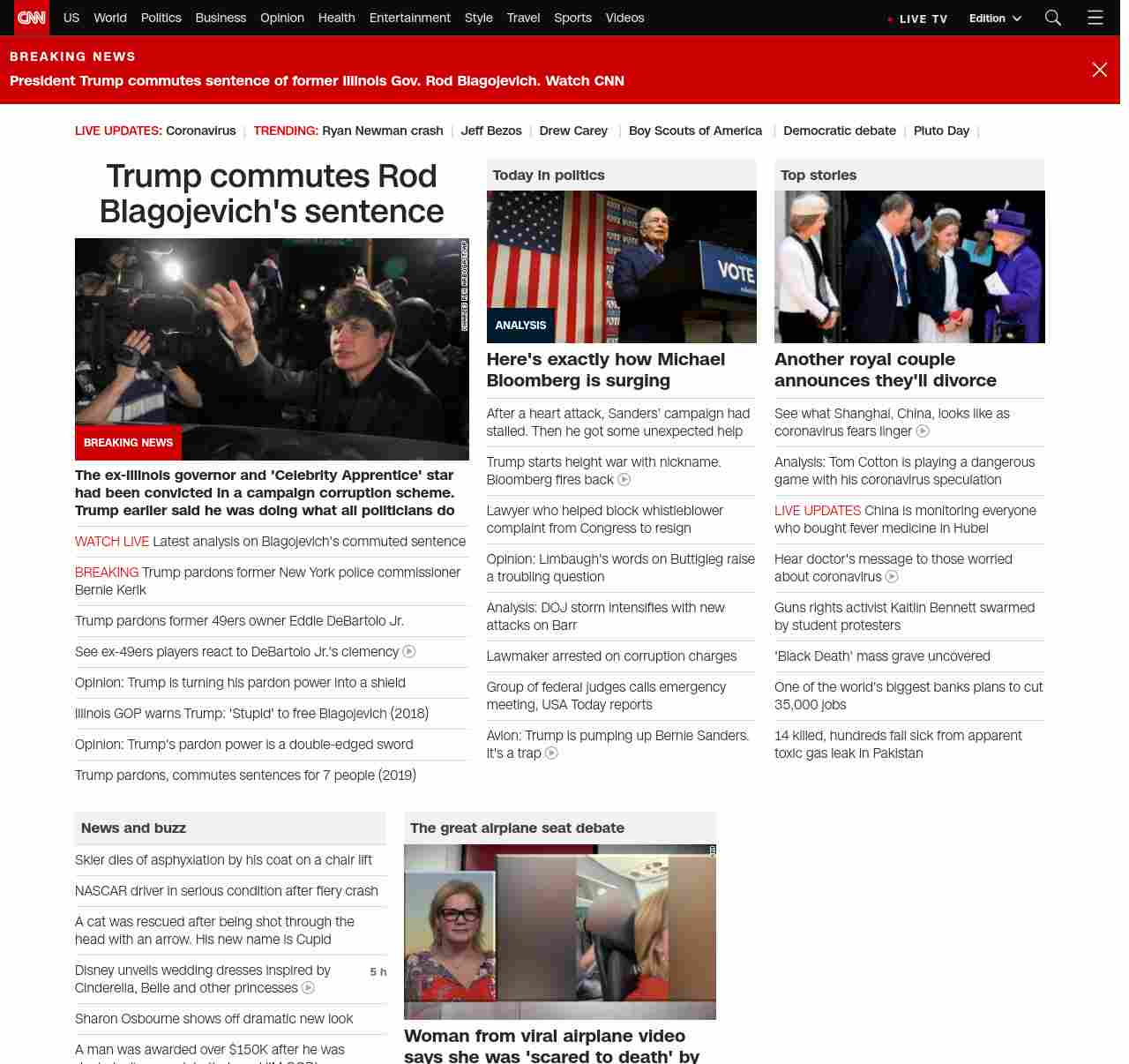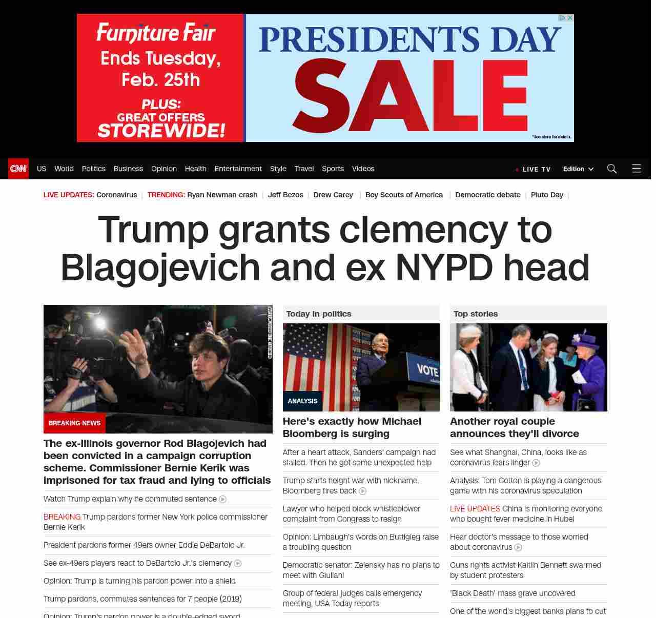 || screaming-banner-text banner-text-size–char-44″ data-analytics=”_list-hierarchical-xs_hyperlink_”> Trump commutes Rod Blagojevich’s sentence ||” , title: “CNN – Breaking News, Latest News and Videos” , siblings: {“articleList”:[{“uri”:”/2020/02/18/politics/bernie-kerik-trump-pardon/index.html”,”headline”:”Trump pardons former New York police commissioner Bernie Kerik”,”thumbnail”:”//cdn.cnn.com/cnnnext/dam/assets/190930154134-03-trump-0930-small-11.jpg”,”duration”:””,”description”:”President Donald Trump has pardoned former New York police commissioner Bernie Kerik, he announced at Joint Base Andrews on Tuesday.”,”layout”:””