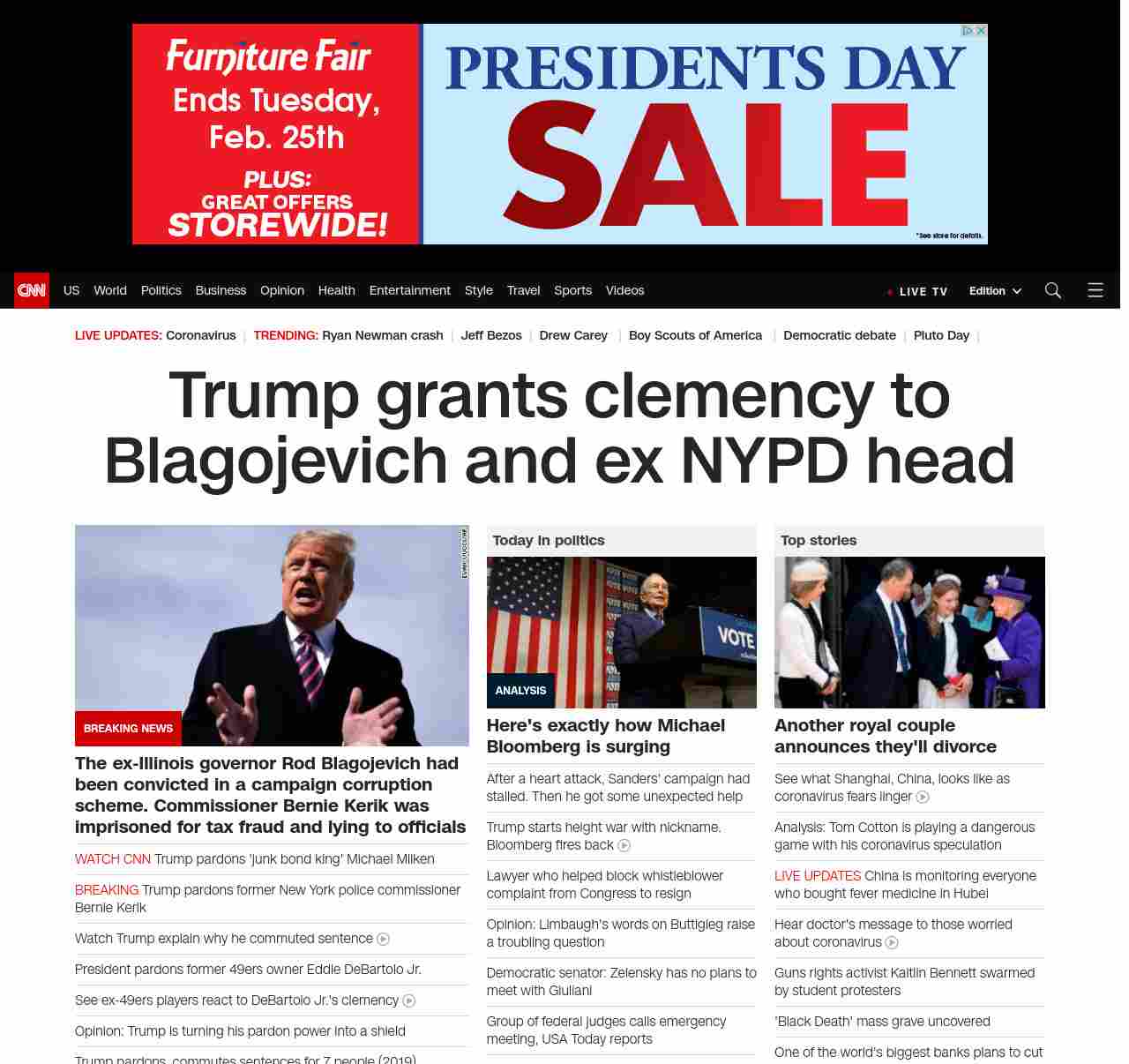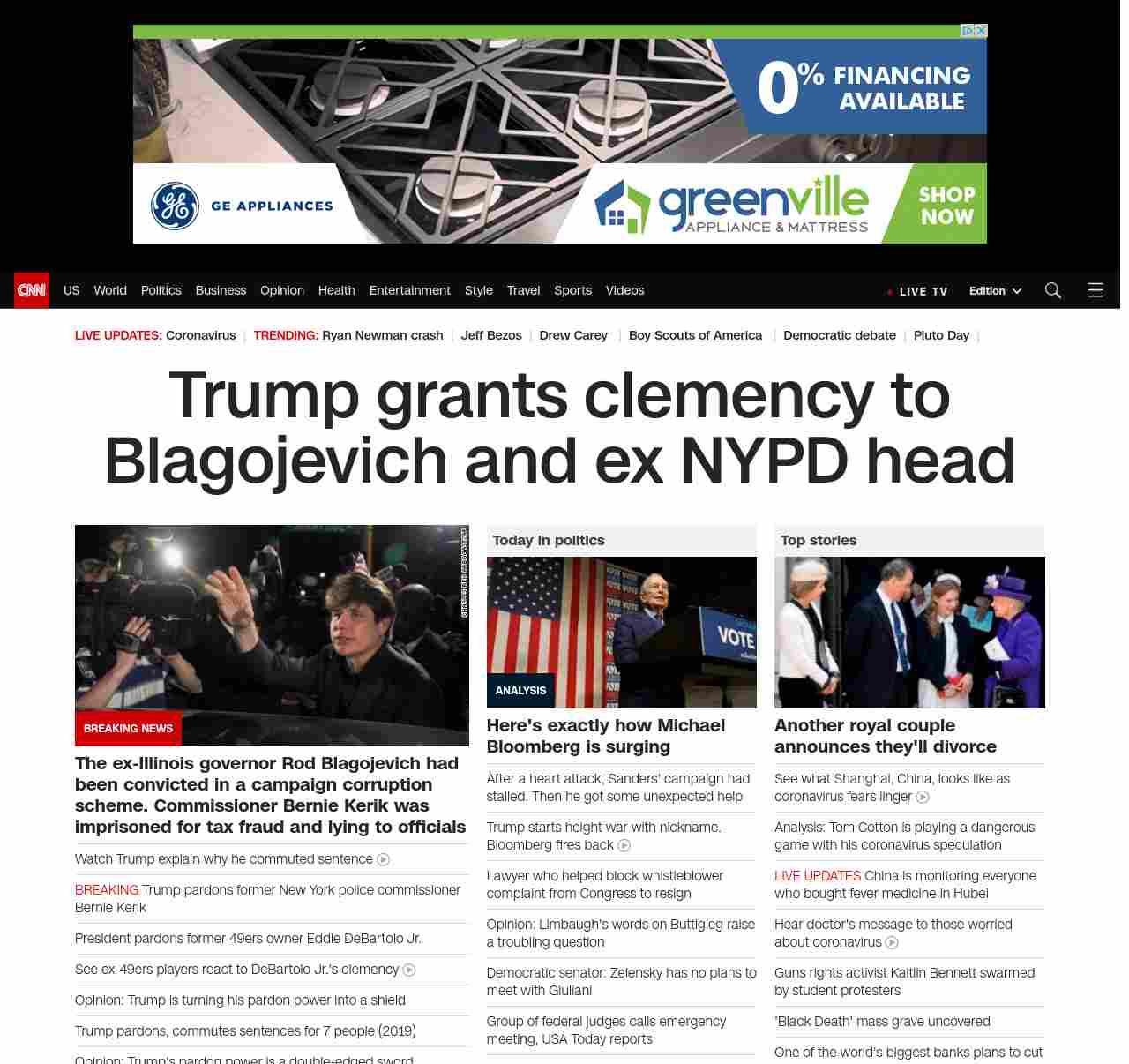 || banner-text–natural”> Trump grants clemency to Blagojevich and ex NYPD head ||” , title: “CNN – Breaking News, Latest News and Videos” , siblings: {“articleList”:[{“uri”:”/2020/02/18/politics/bernie-kerik-trump-pardon/index.html”,”headline”:”Trump pardons former New York police commissioner Bernie Kerik”,”thumbnail”:”//cdn.cnn.com/cnnnext/dam/assets/190930154134-03-trump-0930-small-11.jpg”,”duration”:””,”description”:”President Donald Trump has pardoned former New York police commissioner Bernie Kerik, he announced at Joint Base Andrews on Tuesday.”,”layout”:””