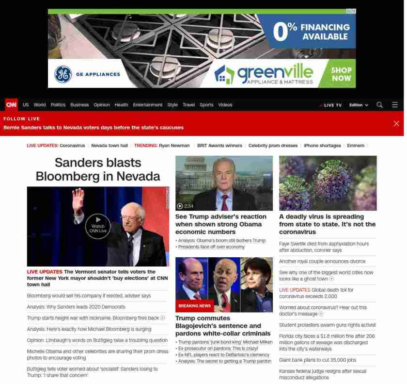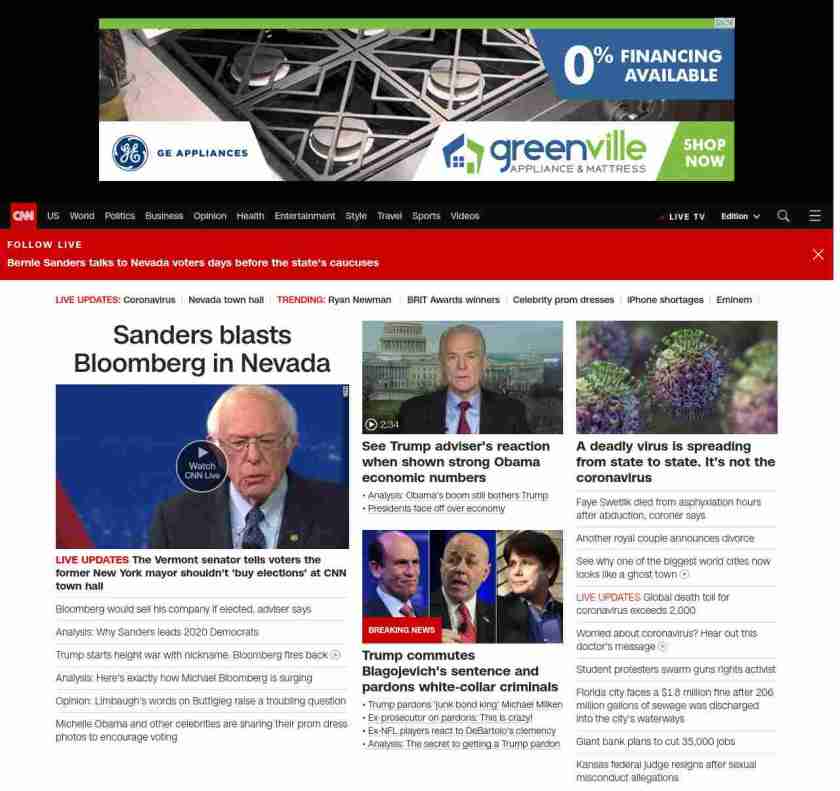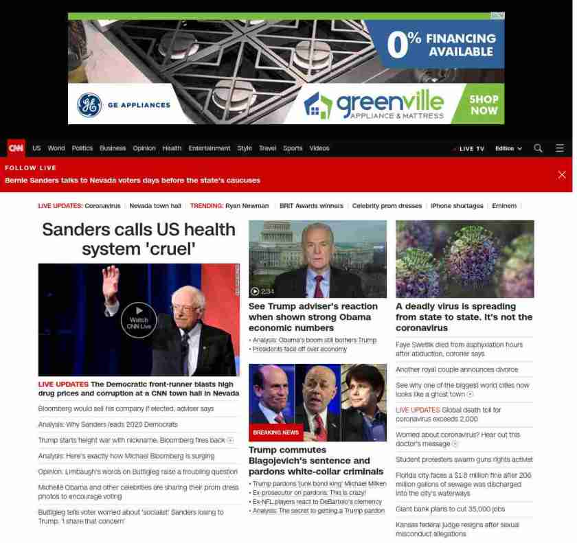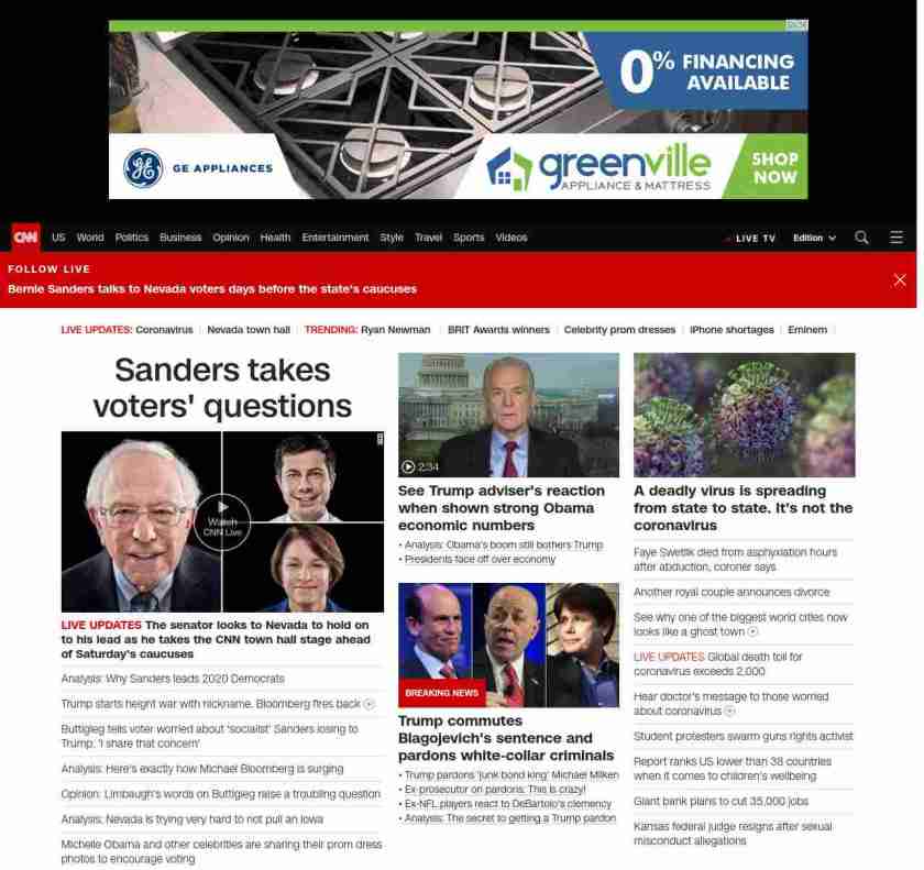 || screaming-banner-text banner-text-size–char-32″ data-analytics=”_list-hierarchical-xs_story_”> Sanders takes voters’ questions ||” , title: “CNN – Breaking News, Latest News and Videos” , siblings: {“articleList”:[{“uri”:”/2020/02/18/politics/bloomberg-business-cnntv/index.html”,”headline”:”Bloomberg would sell his company if elected, adviser says”,”thumbnail”:”//cdn.cnn.com/cnnnext/dam/assets/200218100750-02-bloomberg-0212-lead-image-small-11.jpg”,”duration”:””,”description”:”Michael Bloomberg would sell his financial information and media companyu003ca href=”https://www.google.com/url?sa=t&rct=j&q=&esrc=s&source=web&cd=13&ved=2ahUKEwixvN75o9znAhXoUt8KHXS4DmoQFjAMegQICBAB&url=https%3A%2F%2Fwww.cnn.com%2Felection%2F2020%2Fcandidate%2Fbloomberg&usg=AOvVaw1COmlxeYaVoi2dIi3SomXZ” target=”_blank”> if he’s elected presidentu003c/a> in an effort to be “180 degrees away from where Donald Trump is on these issues,” an adviser to his campaign said Tuesday.”,”layout”:””