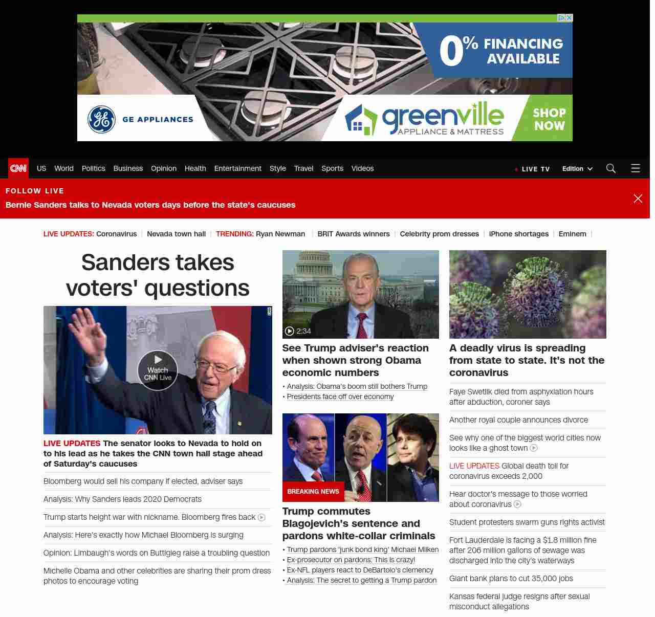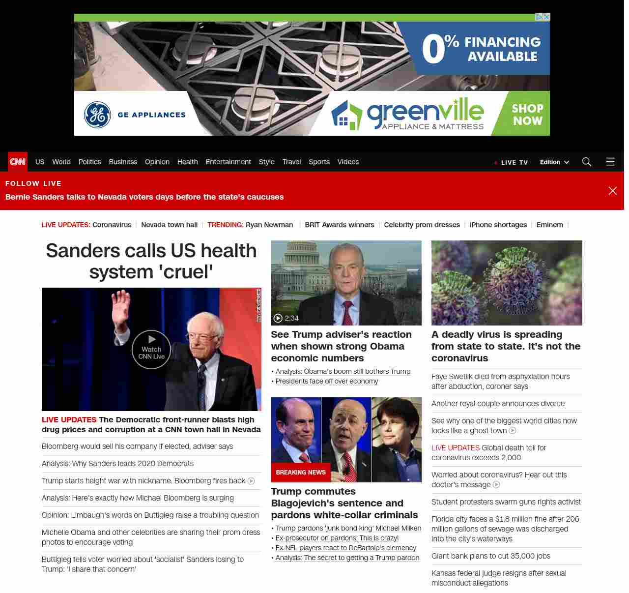 || screaming-banner-text banner-text-size–char-32″ data-analytics=”_list-hierarchical-xs_story_”> Sanders takes voters’ questions ||” , title: “CNN – Breaking News, Latest News and Videos” , siblings: {“articleList”:[{“uri”:”/2020/02/18/politics/bloomberg-business-cnntv/index.html”,”headline”:”Bloomberg would sell his company if elected, adviser says”,”thumbnail”:”//cdn.cnn.com/cnnnext/dam/assets/200218100750-02-bloomberg-0212-lead-image-small-11.jpg”,”duration”:””,”description”:”Michael Bloomberg would sell his financial information and media companyu003ca href=”https://www.google.com/url?sa=t&rct=j&q=&esrc=s&source=web&cd=13&ved=2ahUKEwixvN75o9znAhXoUt8KHXS4DmoQFjAMegQICBAB&url=https%3A%2F%2Fwww.cnn.com%2Felection%2F2020%2Fcandidate%2Fbloomberg&usg=AOvVaw1COmlxeYaVoi2dIi3SomXZ” target=”_blank”> if he’s elected presidentu003c/a> in an effort to be “180 degrees away from where Donald Trump is on these issues,” an adviser to his campaign said Tuesday.”,”layout”:””