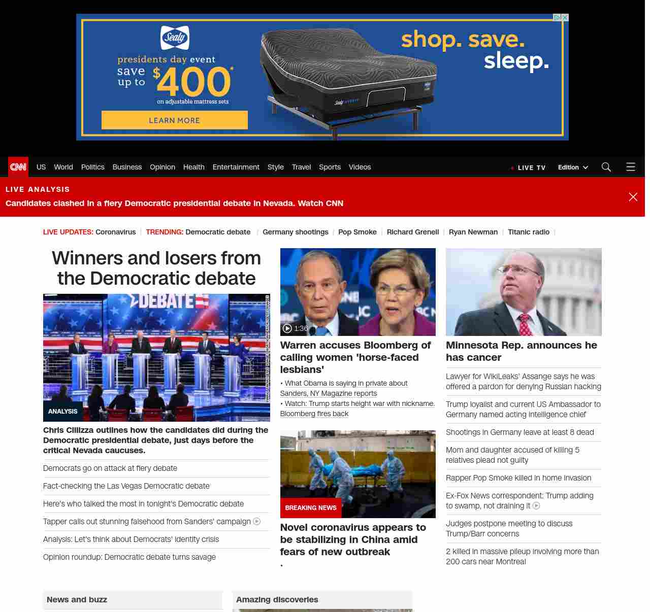 || screaming-banner-text banner-text-size–char-47″ data-analytics=”_list-hierarchical-xs_article_”> Winners and losers from the Democratic debate ||” , title: “CNN – Breaking News, Latest News and Videos” , siblings: {“articleList”:[{“uri”:”/2020/02/19/politics/who-won-democratic-debate/index.html”,”headline”:”u003cstrong>The top six candidates for the Democratic nomination came out swinging just days before the critical Nevada caucuses. Here’s Chris Cillizza’s best and worst u003c/strong>”,”thumbnail”:”//cdn.cnn.com/cnnnext/dam/assets/200219225834-12-msnbc-dem-debate-0219-small-11.jpg”,”duration”:””,”description”:”The top six candidates for the Democratic presidential nomination gathered on a u003ca href=”https://www.cnn.com/politics/live-news/nevada-democratic-debate-live/index.html” target=”_blank”>debate stage Wednesday nightu003c/a>, just days before the critical Nevada caucuses. “,”layout”:””