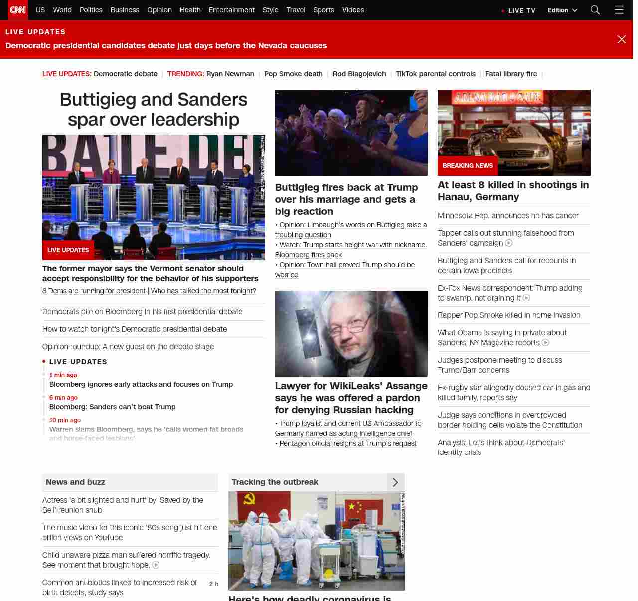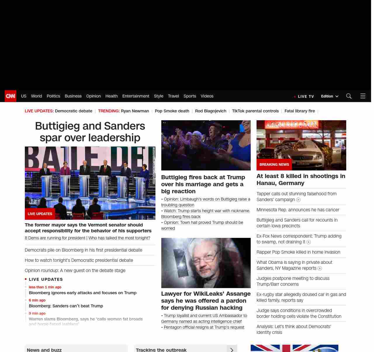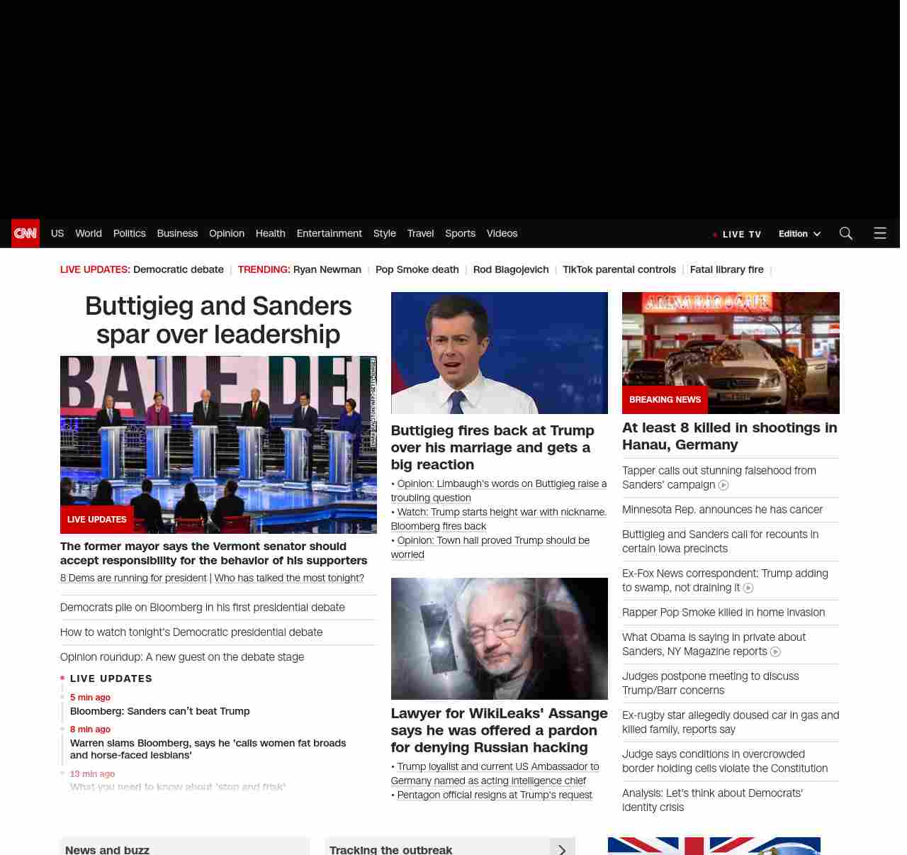 || screaming-banner-text banner-text-size–char-44″ data-analytics=”_list-hierarchical-xs_hyperlink_”> Buttigieg and Sanders spar over leadership ||” , title: “CNN – Breaking News, Latest News and Videos” , siblings: {“articleList”:[{“uri”:”/2020/02/19/politics/2020-primary-debate-las-vegas/index.html”,”headline”:”Democrats pile on Bloomberg in his first presidential debate”,”thumbnail”:”//cdn.cnn.com/cnnnext/dam/assets/200219124719-03-bernie-sanders-nevada-0215-small-11.jpg”,”duration”:””,”description”:”The Democratic presidential candidates on Wednesday immediately piled on Michael Bloomberg as the former New York City mayor made his first appearance on the debate stage, slamming the billionaire for his past sexist remarks and the influence of his money in politics.”,”layout”:””