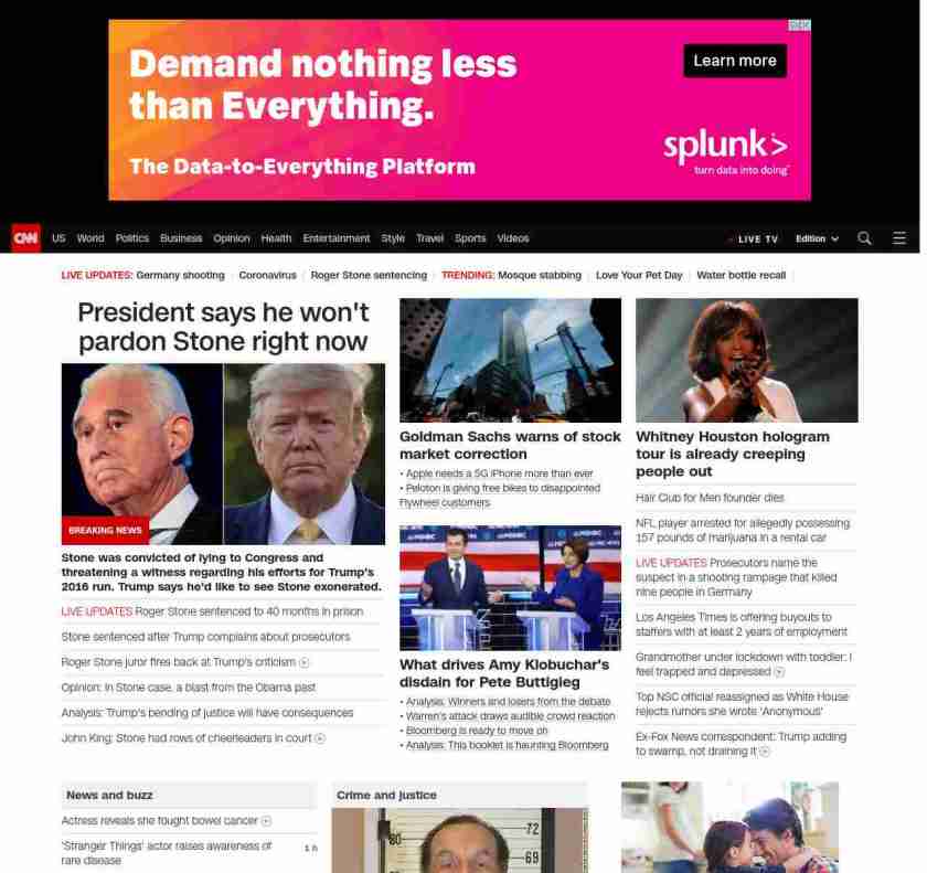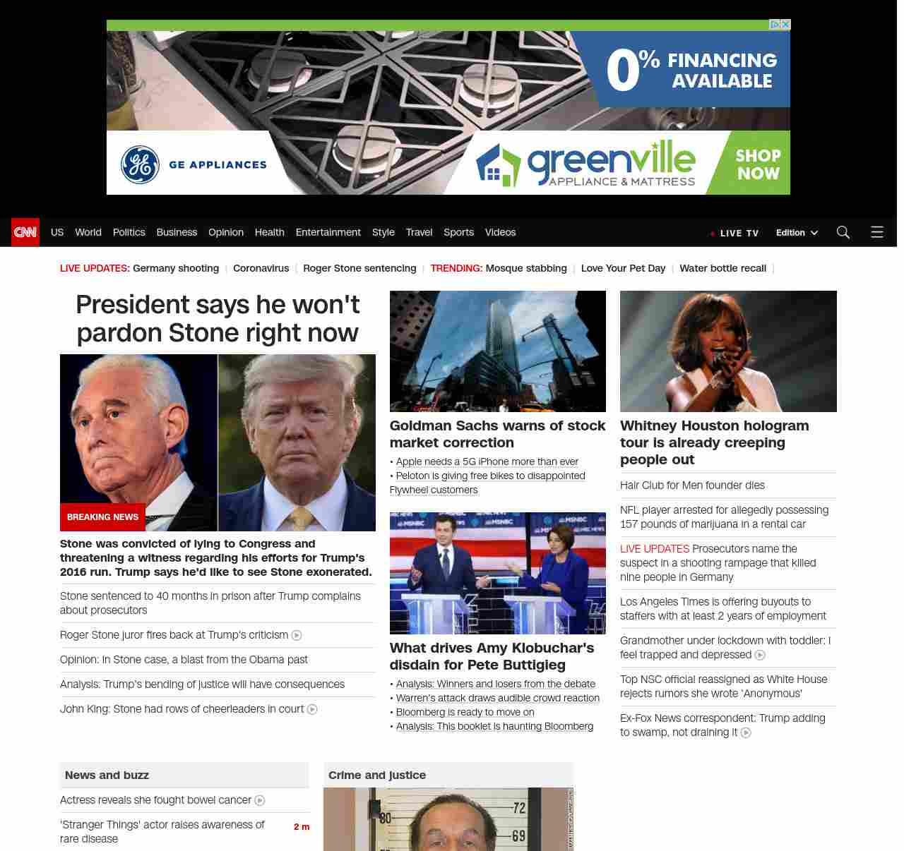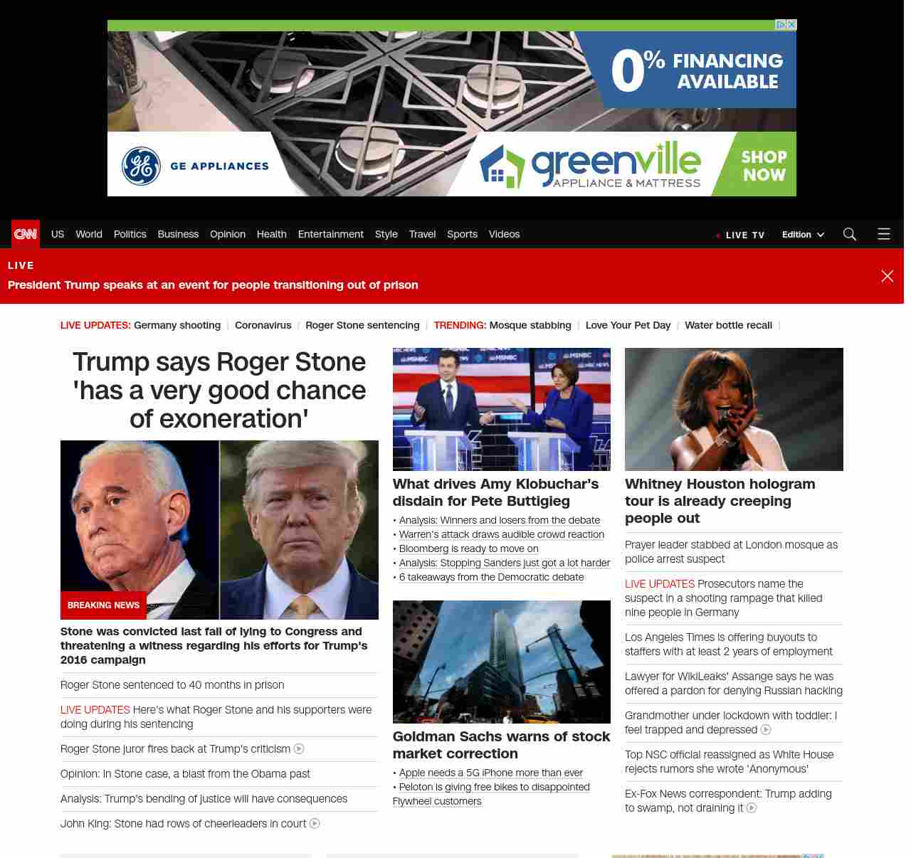 || screaming-banner-text banner-text-size–char-47″ data-analytics=”_list-hierarchical-xs_article_”> Trump says Roger Stone ‘has a very good chance of exoneration’ ||” , title: “CNN – Breaking News, Latest News and Videos” , siblings: {“articleList”:[{“uri”:”/2020/02/20/politics/donald-trump-roger-stone-exoneration/index.html”,”headline”:”u003cstrong>Stone was convicted of lying to Congress and threatening a witness regarding his efforts for Trump’s 2016 run. Trump says he’d like to see Stone exonerated. u003c/strong>”,”thumbnail”:”//cdn.cnn.com/cnnnext/dam/assets/200220125342-trump-stone-unhappy-split-small-11.jpg”,”duration”:””,”description”:”u003cstrong>⢠u003c/strong>u003ca href=”https://www.cnn.com/politics/live-news/roger-stone-sentencing/index.html” target=”_blank”>u003cstrong>Live updates: u003c/strong>Roger Stone sentenced to prisonu003c/a>u003cbr />â¢u003ca href=”https://www.cnn.com/videos/politics/2020/02/20/roger-stone-juror-seth-cousins-sot-vpx-cuomo-cpt.cnn” target=”_blank”> Watch: Roger Stone juror fires back at Trump’s criticismu003c/a>u003cbr />⢠u003ca href=”https://www.cnn.com/2020/02/19/opinions/stone-barr-doj-opinion-zeldin/index.html” target=”_blank”>Opinion: In Stone case, a blast from the Obama pastu003c/a>u003cbr />⢠u003ca href=”https://www.cnn.com/2020/02/20/politics/trump-department-of-justice-william-barr/index.html” target=”_blank”>Analysis: Trump’s bending of justice will have consequencesu003c/a>”,”layout”:””