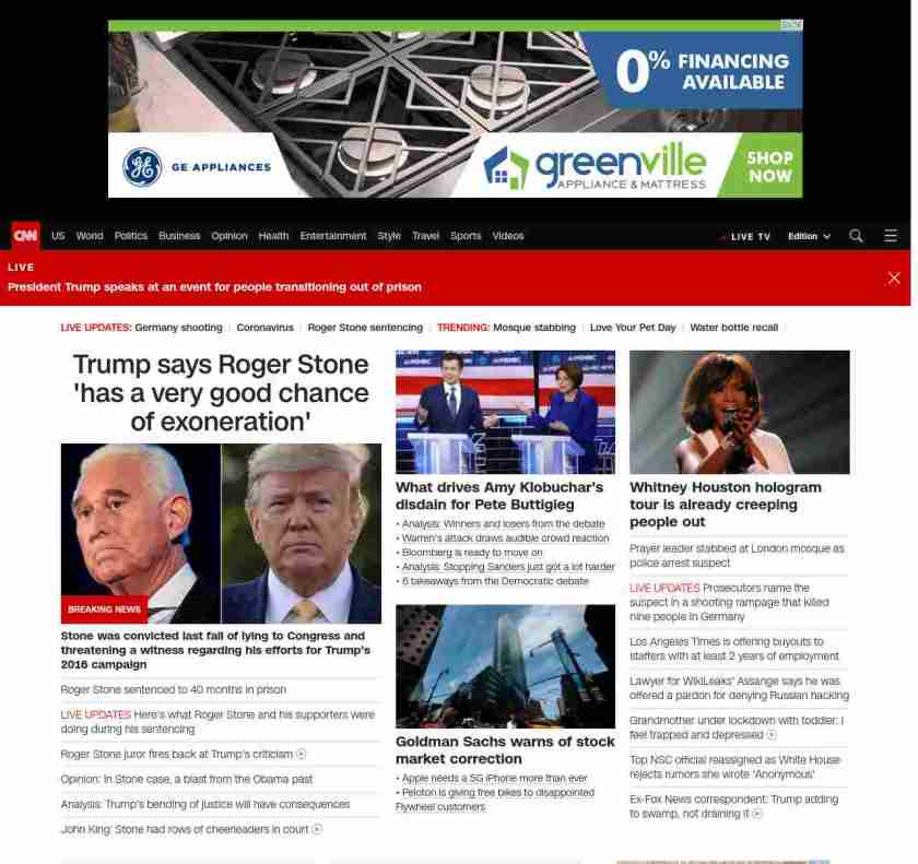 CNN: “:”u003cstrong>Stone was convicted of lying to Congress and threatening a witness regarding his efforts for Trump’s 2016 run. Trump says he’d like to see Stone exonerated. u003c/strong>”, “BANNER=|pagerendered| ((lubuntu at wor2))