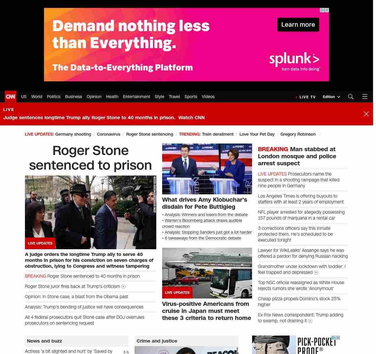|| screaming-banner-text banner-text-size–char-32″ data-analytics=”_list-hierarchical-xs_hyperlink_”> Roger Stone sentenced to prison ||” , title: “CNN – Breaking News, Latest News and Videos” , siblings: {“articleList”:[{“uri”:”/2020/02/20/politics/roger-stone-sentencing-hearing/index.html”,”headline”:”Roger Stone sentenced to 40 months in prison”,”thumbnail”:”//cdn.cnn.com/cnnnext/dam/assets/200220141118-04-roger-stone-0220-restricted-small-11.jpg”,”duration”:””,”description”:”Roger Stone, a longtime showman, political strategist and friend of Donald Trump’s whom a jury found guilty of lying to Congress and threatening a witness regarding his efforts for the President’s 2016 campaign, will be u003ca href=”http://www.cnn.com/2020/02/18/politics/roger-stone-hearing/index.html” target=”_blank”>sentencedu003c/a> Thursday in Washington.”,”layout”:””
