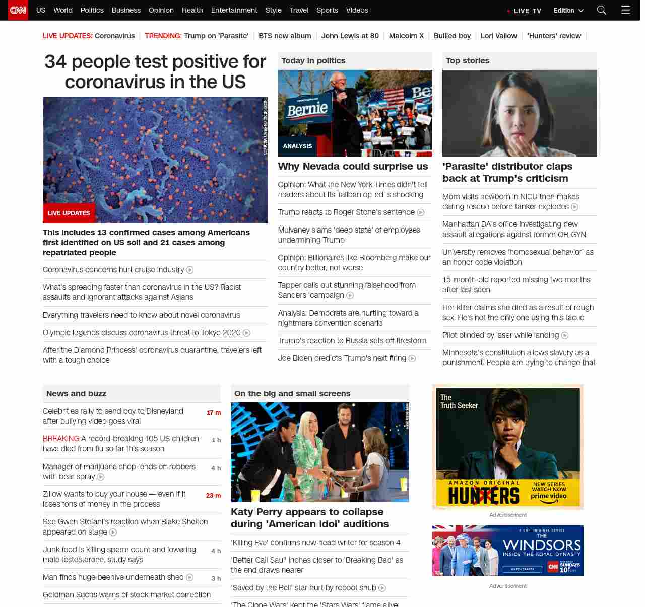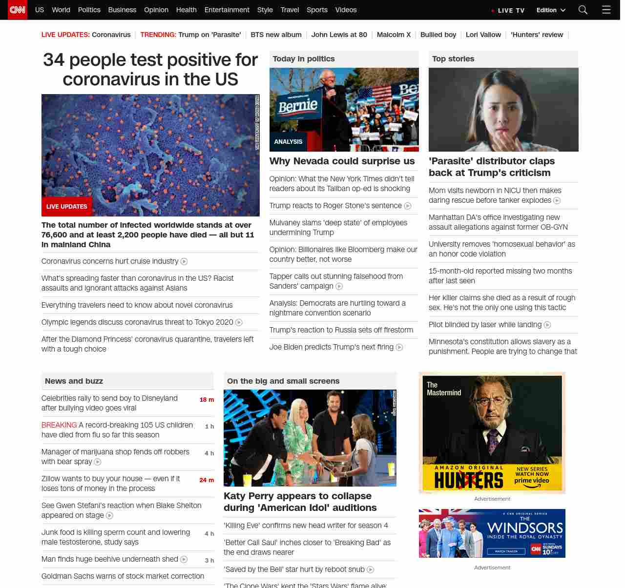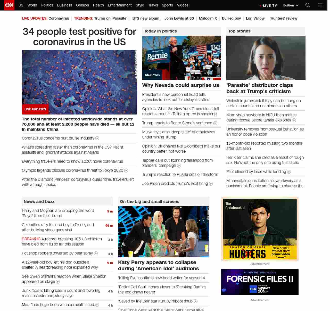 || screaming-banner-text banner-text-size–char-47″ data-analytics=”_list-hierarchical-xs_article_”> 34 people test positive for coronavirus in the US ||” , title: “CNN – Breaking News, Latest News and Videos” , siblings: {“articleList”:[{“uri”:”/asia/live-news/coronavirus-outbreak-02-21-20-intl-hnk/index.html”,”headline”:”u003cstrong>The total number of infected worldwide stands at over 76,600 and at least 2,200 people have died â all but 11 in mainland Chinau003c/strong>”,”thumbnail”:”//cdn.cnn.com/cnnnext/dam/assets/200221130556-coronavirus-image-university-of-hong-kong-small-11.jpg”,”duration”:””,”description”:””,”layout”:””
