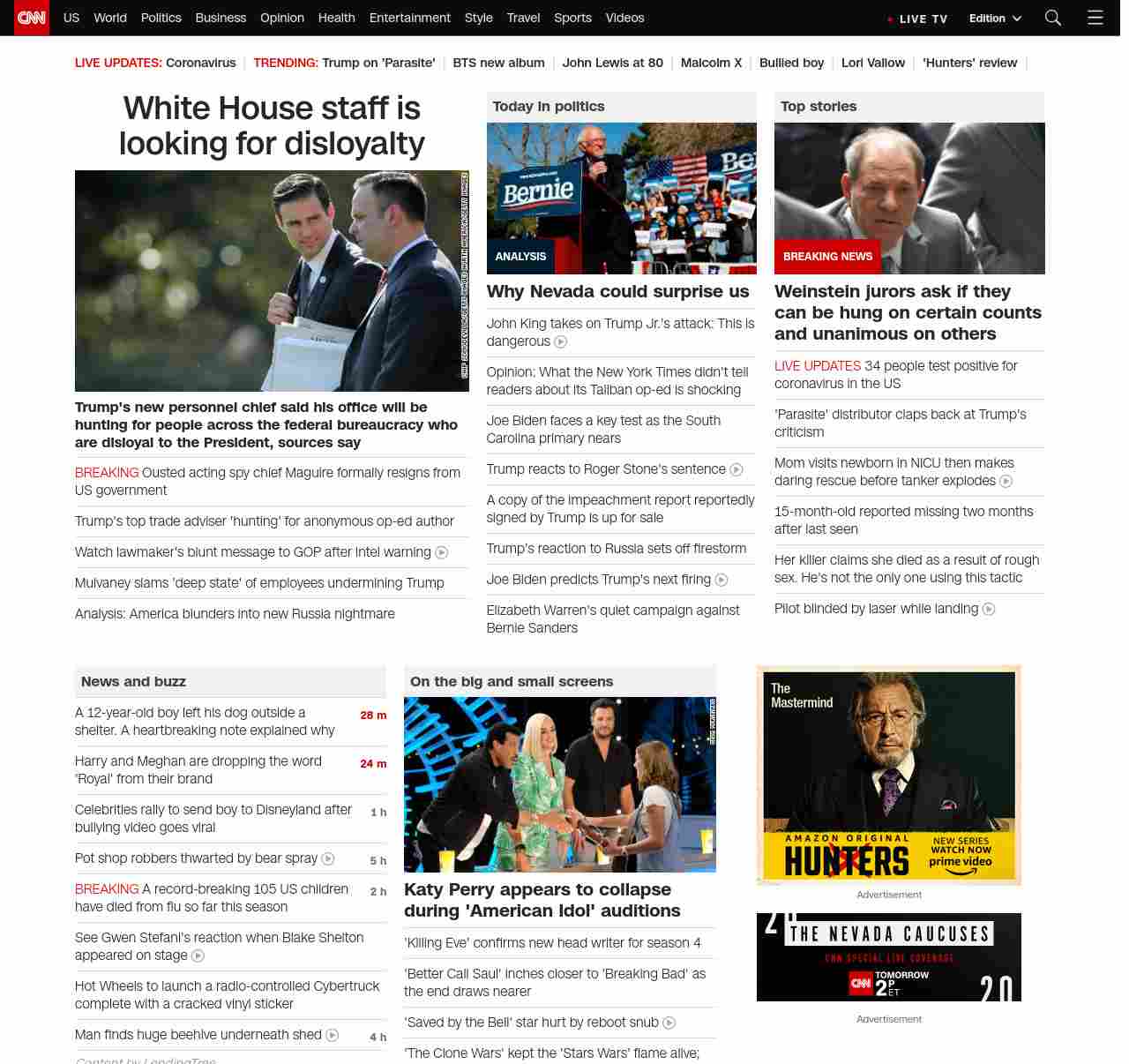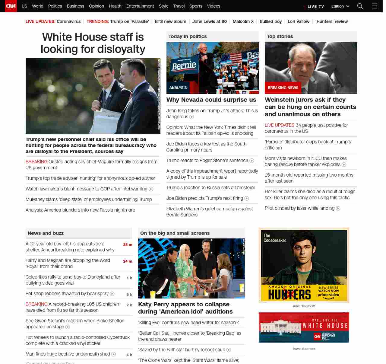 || screaming-banner-text banner-text-size–char-44″ data-analytics=”_list-hierarchical-xs_article_”> White House staff is looking for disloyalty ||” , title: “CNN – Breaking News, Latest News and Videos” , siblings: {“articleList”:[{“uri”:”/2020/02/21/politics/john-mcentee-disloyal-white-house-staffers/index.html”,”headline”:”u003cstrong>Trump’s new personnel chief said his office will be hunting for people across the federal bureaucracy who are disloyal to the President, sources sayu003c/strong>”,”thumbnail”:”//cdn.cnn.com/cnnnext/dam/assets/180313091931-john-mcentee-11-29-2017-small-11.jpg”,”duration”:””,”description”:”President Donald Trump’s new personnel chief told agency officials at a meeting on Thursday to expect staffing changes and movements across the government, people familiar with the meeting told CNN.”,”layout”:””
