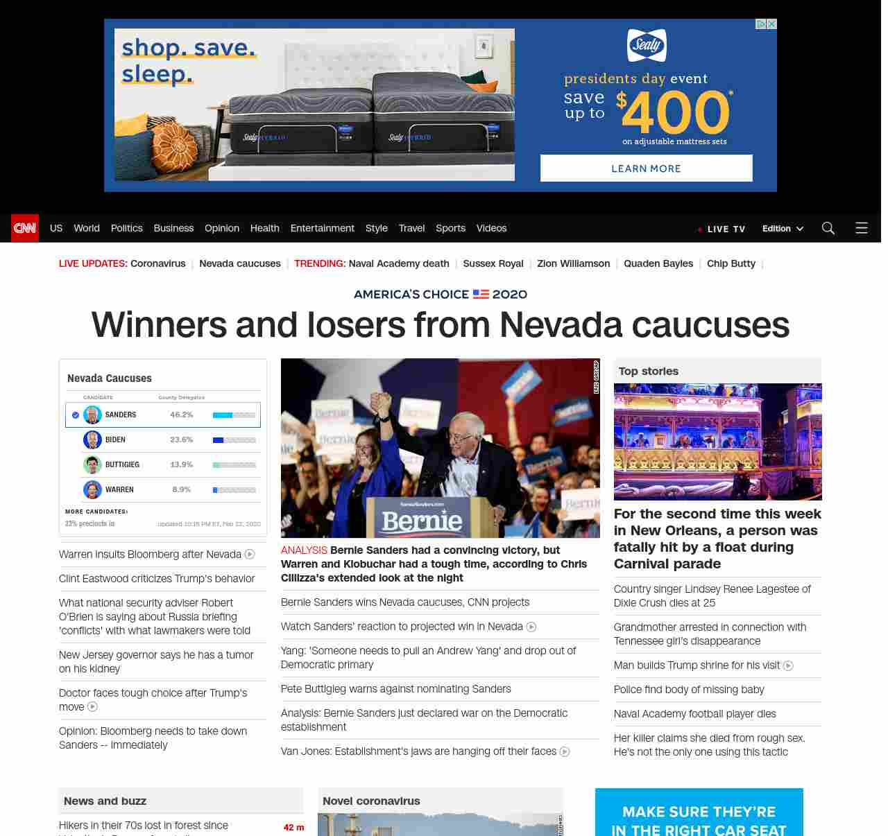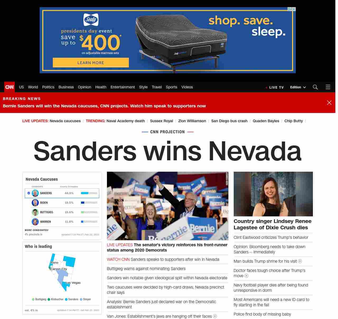 || banner-text–maximized banner-text-size–char-20″> Sanders wins Nevada ||” , title: “CNN – Breaking News, Latest News and Videos” , siblings: {“articleList”:[{“uri”:”/politics/live-news/nevada-caucuses-live-results-updates-2020/index.html”,”headline”:”u003cstrong>The senator’s victory reinforces his front-runner status among 2020 Democratsu003c/strong>”,”thumbnail”:”//cdn.cnn.com/cnnnext/dam/assets/200222202222-bernie-speaks-0222-screengrab-small-11.jpg”,”duration”:””,”description”:””,”layout”:””