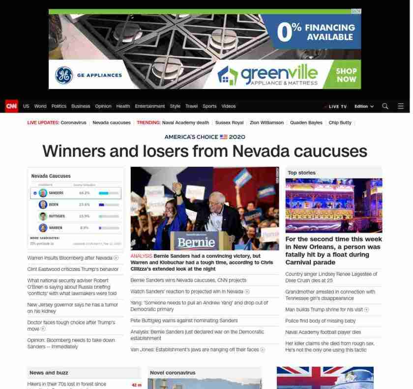 || banner-text–maximized banner-text-size–char-20″> Sanders wins Nevada ||” , title: “CNN – Breaking News, Latest News and Videos” , siblings: {“articleList”:[{“uri”:”/politics/live-news/nevada-caucuses-live-results-updates-2020/index.html”,”headline”:”u003cstrong>The senator’s victory reinforces his front-runner status among 2020 Democratsu003c/strong>”,”thumbnail”:”//cdn.cnn.com/cnnnext/dam/assets/200207165727-bernie-sanders-lead-headshot-centered-small-11.jpg”,”duration”:””,”description”:””,”layout”:””