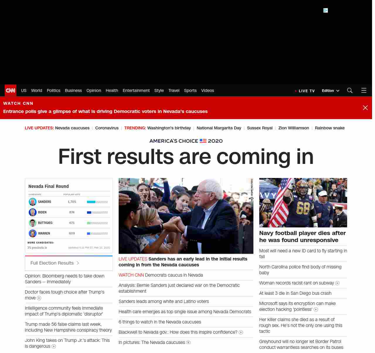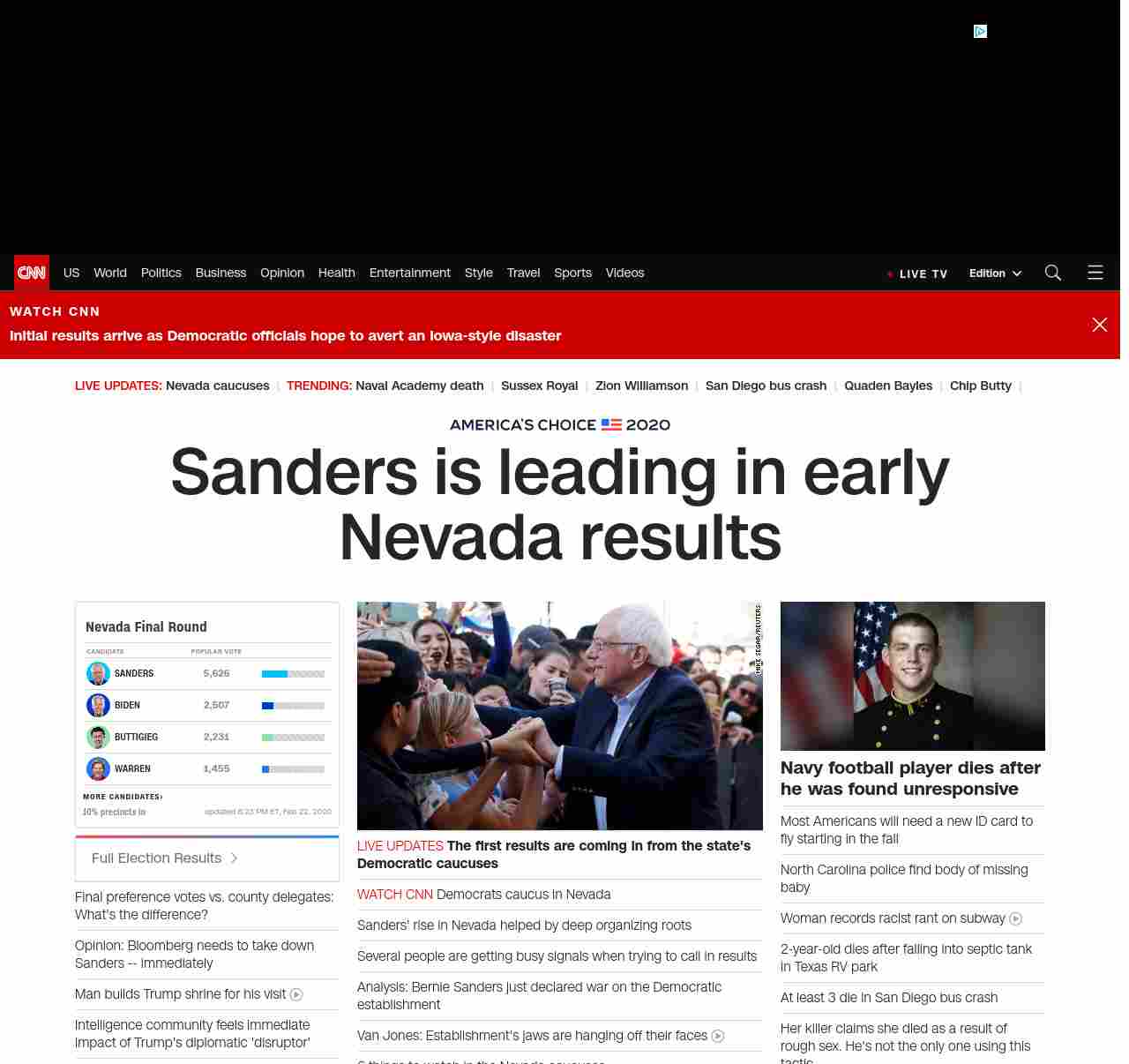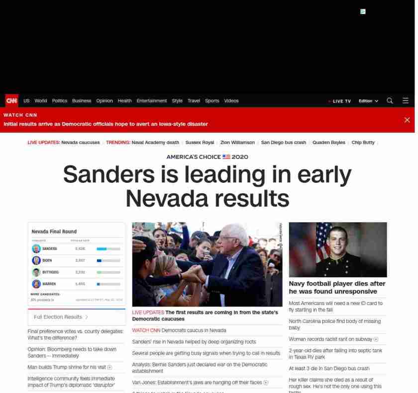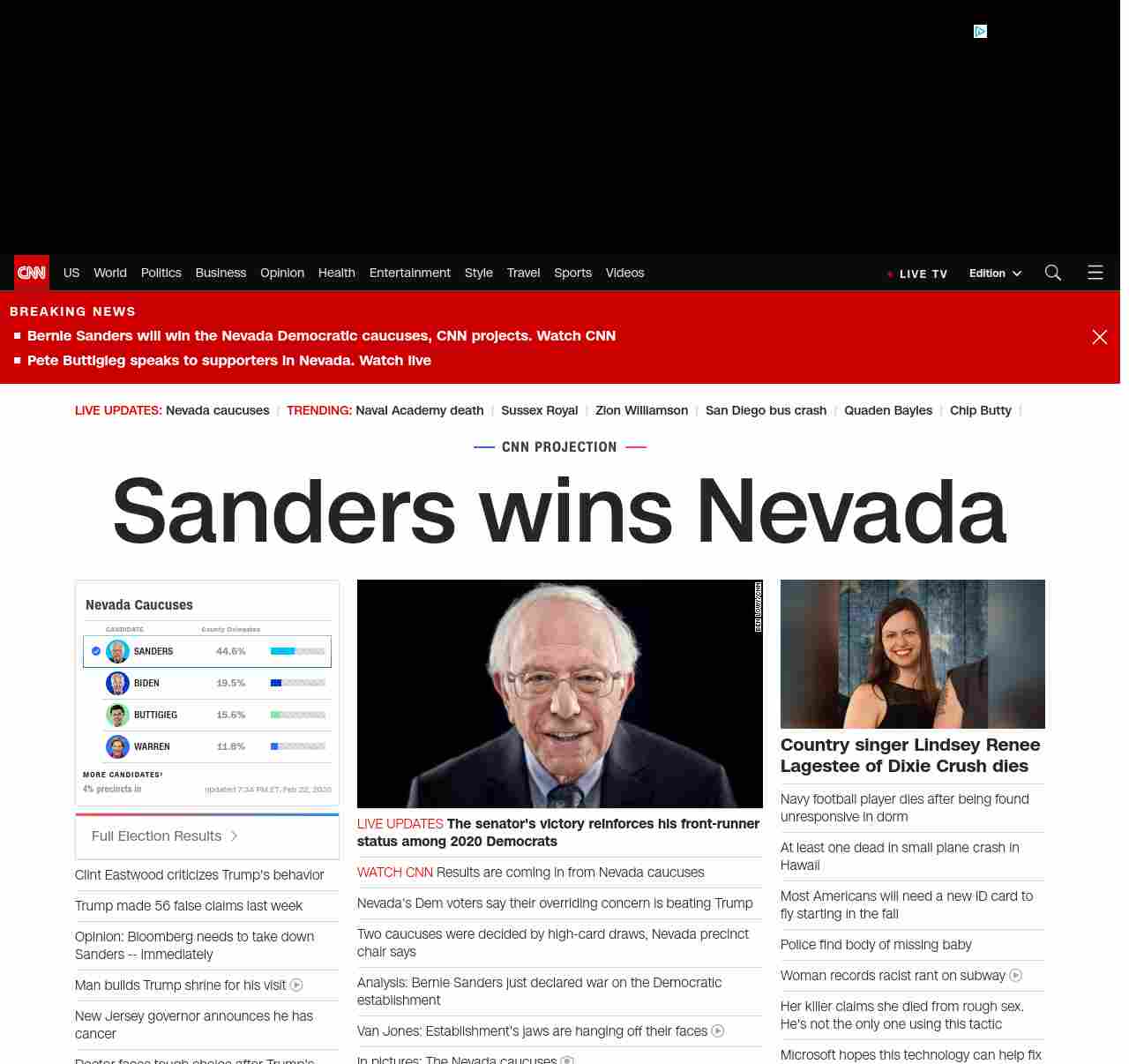 || banner-text–natural”> Sanders is leading in early Nevada results ||” , title: “CNN – Breaking News, Latest News and Videos” , siblings: {“articleList”:[{“uri”:”/2020/02/22/politics/clint-eastwood-2020-election-bloomberg-trump/index.html”,”headline”:”Clint Eastwood criticizes Trump’s behavior “,”thumbnail”:”//cdn.cnn.com/cnnnext/dam/assets/150115102445-clint-eastwood-0214-small-11.jpg”,”duration”:””,”description”:”Actor and director Clint Eastwood, a longtime supporter of Republican candidates, appeared to back Democratic candidate u003ca href=”https://www.cnn.com/election/2020/candidate/bloomberg” target=”_blank”>Michael Bloombergu003c/a> for president and criticized President u003ca href=”https://www.cnn.com/election/2020/candidate/trump” target=”_blank”>Donald Trumpu003c/a>’s behavior in office in an interview published in u003ca href=”https://www.wsj.com/articles/a-hollywood-legend-talks-politics-11582311359″ target=”_blank”>The Wall Street Journalu003c/a> Friday.”,”layout”:””
