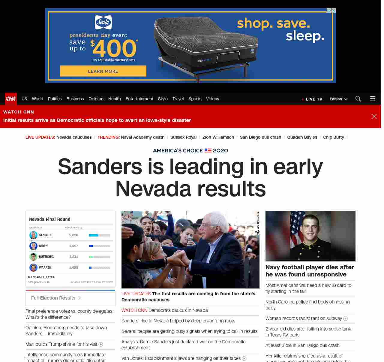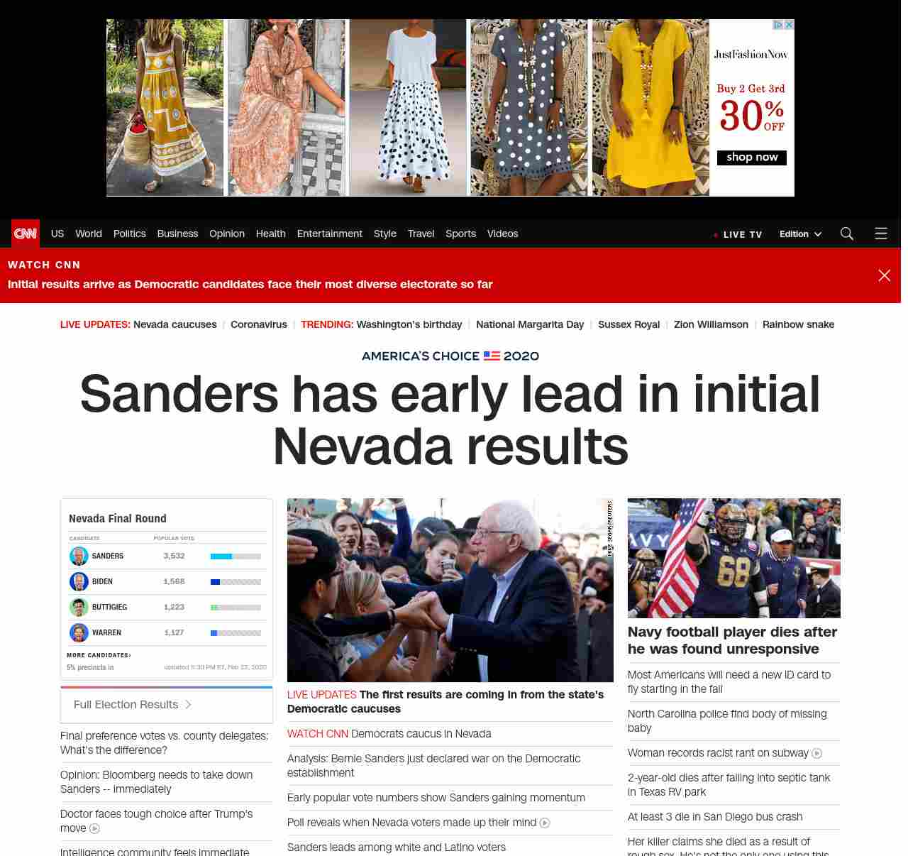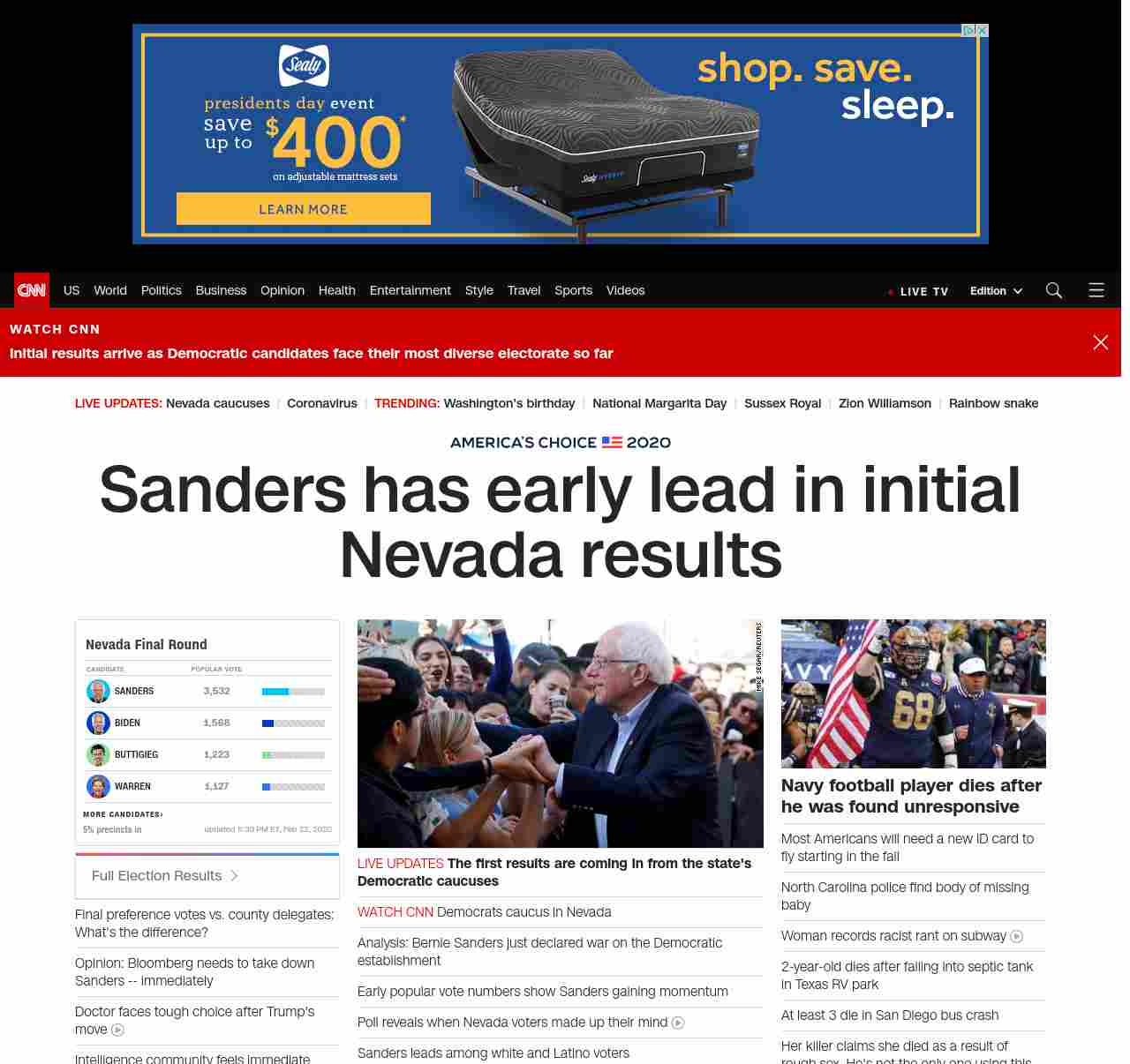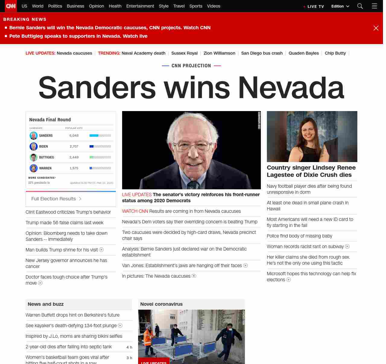 || banner-text–natural”> Sanders is leading in early Nevada results ||” , title: “CNN – Breaking News, Latest News and Videos” , siblings: {“articleList”:[{“uri”:”/2020/02/22/politics/clint-eastwood-2020-election-bloomberg-trump/index.html”,”headline”:”Clint Eastwood criticizes Trump’s behavior “,”thumbnail”:”//cdn.cnn.com/cnnnext/dam/assets/150115102445-clint-eastwood-0214-small-11.jpg”,”duration”:””,”description”:”Actor and director Clint Eastwood, a longtime supporter of Republican candidates, appeared to back Democratic candidate u003ca href=”https://www.cnn.com/election/2020/candidate/bloomberg” target=”_blank”>Michael Bloombergu003c/a> for president and criticized President u003ca href=”https://www.cnn.com/election/2020/candidate/trump” target=”_blank”>Donald Trumpu003c/a>’s behavior in office in an interview published in u003ca href=”https://www.wsj.com/articles/a-hollywood-legend-talks-politics-11582311359″ target=”_blank”>The Wall Street Journalu003c/a> Friday.”,”layout”:””