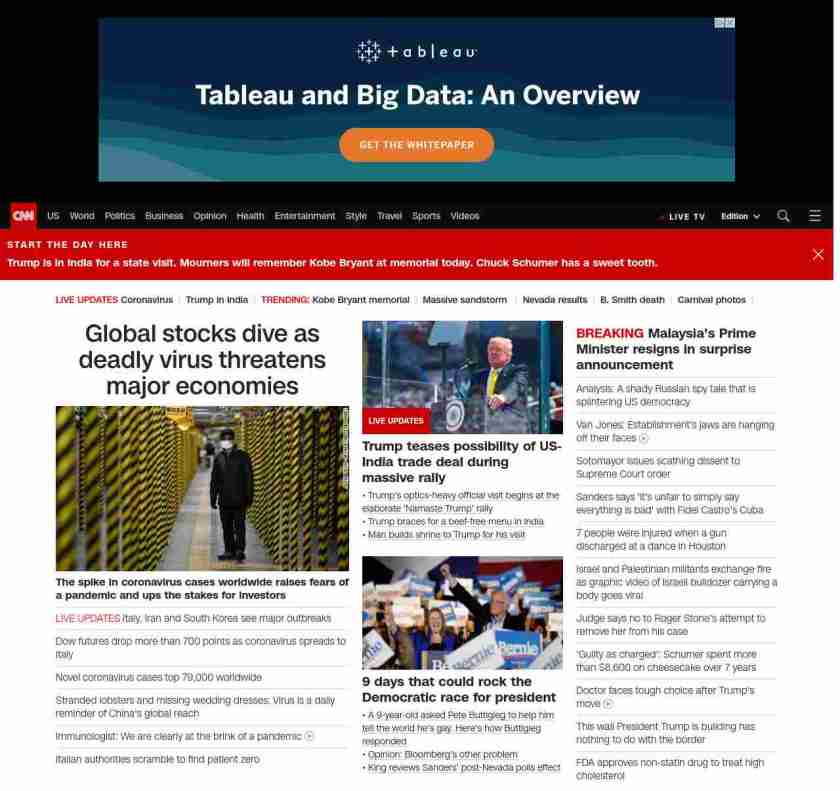|| screaming-banner-text banner-text-size–char-47″ data-analytics=”_list-hierarchical-xs_article_”> Global stocks dive as deadly virus threatens major economies ||” , title: “CNN – Breaking News, Latest News and Videos” , siblings: {“articleList”:[{“uri”:”/2020/02/23/business/stock-futures-coronavirus/index.html”,”headline”:”u003cstrong>The spike in coronavirus cases worldwide raises fears of a pandemic and ups the stakes for investorsu003c/strong>”,”thumbnail”:”//cdn.cnn.com/cnnnext/dam/assets/200224110707-coronavirus-south-korea-0222-small-11.jpg”,”duration”:””,”description”:”US stock futures dropped Sunday evening as the coronavirus outbreak continues to spread globally.”,”layout”:””