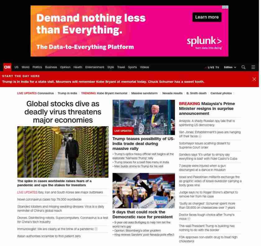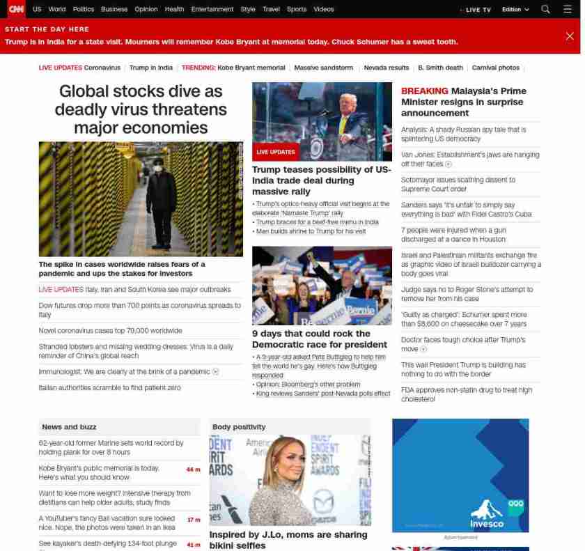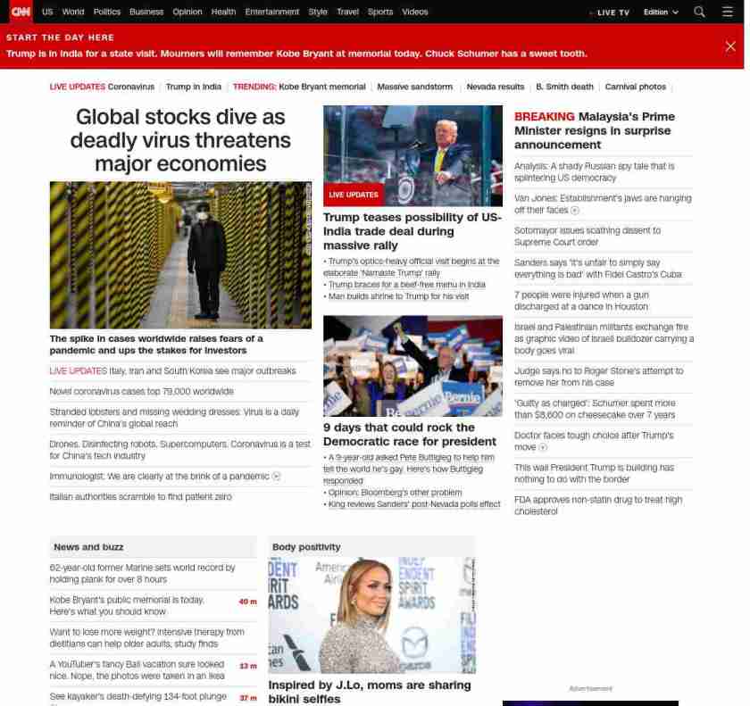 || screaming-banner-text banner-text-size–char-47″ data-analytics=”_list-hierarchical-xs_article_”> Global stocks dive as coronavirus threatens major economies ||” , title: “CNN – Breaking News, Latest News and Videos” , siblings: {“articleList”:[{“uri”:”/2020/02/23/business/stock-futures-coronavirus/index.html”,”headline”:”u003cstrong>The spike in cases worldwide raises fears of a pandemic and ups the stakes for investorsu003c/strong>”,”thumbnail”:”//cdn.cnn.com/cnnnext/dam/assets/200224110707-coronavirus-south-korea-0222-small-11.jpg”,”duration”:””,”description”:”US stock futures dropped Sunday evening as the coronavirus outbreak continues to spread globally.”,”layout”:””