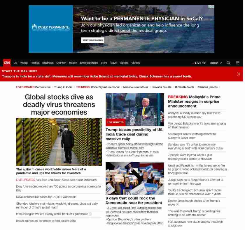|| screaming-banner-text banner-text-size–char-47″ data-analytics=”_list-hierarchical-xs_article_”> Global stocks dive as deadly virus threatens major economies ||” , title: “CNN – Breaking News, Latest News and Videos” , siblings: {“articleList”:[{“uri”:”/2020/02/23/business/stock-futures-coronavirus/index.html”,”headline”:”u003cstrong>The spike in coronavirus cases worldwide raises fears of a pandemic and ups the stakes for investorsu003c/strong>”,”thumbnail”:”//cdn.cnn.com/cnnnext/dam/assets/200224110707-coronavirus-south-korea-0222-small-11.jpg”,”duration”:””,”description”:”US stock futures dropped Sunday evening as the coronavirus outbreak continues to spread globally.”,”layout”:””