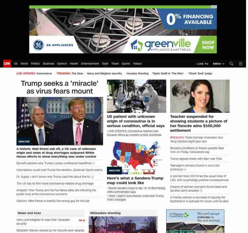 || screaming-banner-text banner-text-size–char-47″ data-analytics=”_list-hierarchical-xs_article_”> Trump seeks a ‘miracle’ as virus fears mount ||” , title: “CNN – Breaking News, Latest News and Videos” , siblings: {“articleList”:[{“uri”:”/2020/02/28/politics/donald-trump-coronavirus-miracle-stock-markets/index.html”,”headline”:”u003cstrong>A historic Wall Street sell off, a US case of unknown origin and news of drug shortages outpaced White House efforts to show everything was under controlu003c/strong>”,”thumbnail”:”//cdn.cnn.com/cnnnext/dam/assets/200226190946-02-trump-coronavirus-presser-0226-small-11.jpg”,”duration”:””,”description”:”u003ca href=”https://www.cnn.com/election/2020/candidate/trump” target=”_blank”>President Donald Trumpu003c/a> is hoping for a “miracle” that u003ca href=”https://www.cnn.com/2020/02/27/politics/trump-coronavirus-disappear/index.html” target=”_blank”>will make the coronavirus disappear u003c/a>but u003ca href=”https://www.cnn.com/2020/02/27/investing/dow-stock-market-selloff/index.html” target=”_blank”>tanking stock marketsu003c/a> and signs u003ca href=”https://www.cnn.com/2020/02/27/health/coronavirus-community-spread-us-response-explainer/index.html” target=”_blank”>the disease is stalking Americau003c/a> are delivering their verdict on his scattershot management of the crisis.”,”layout”:””