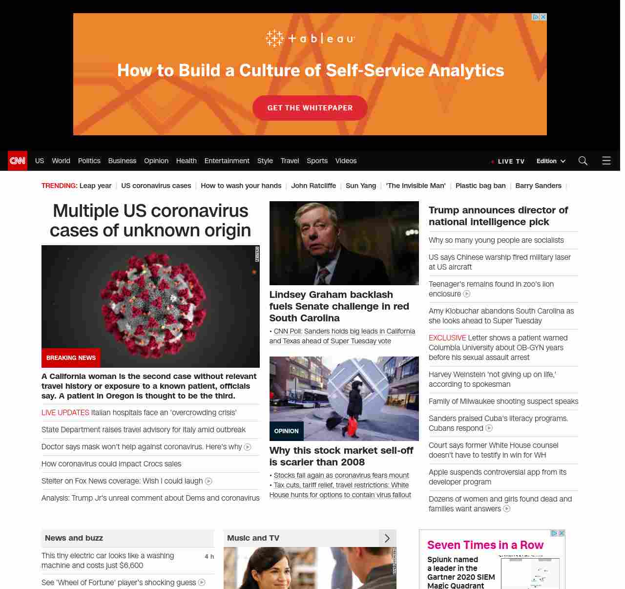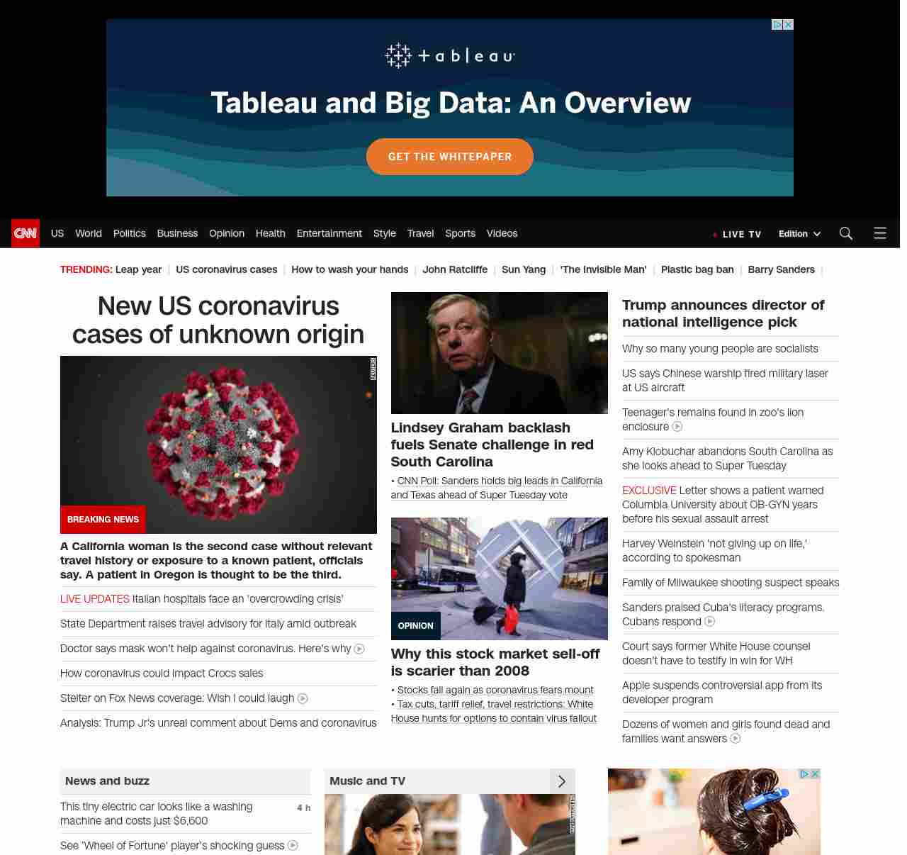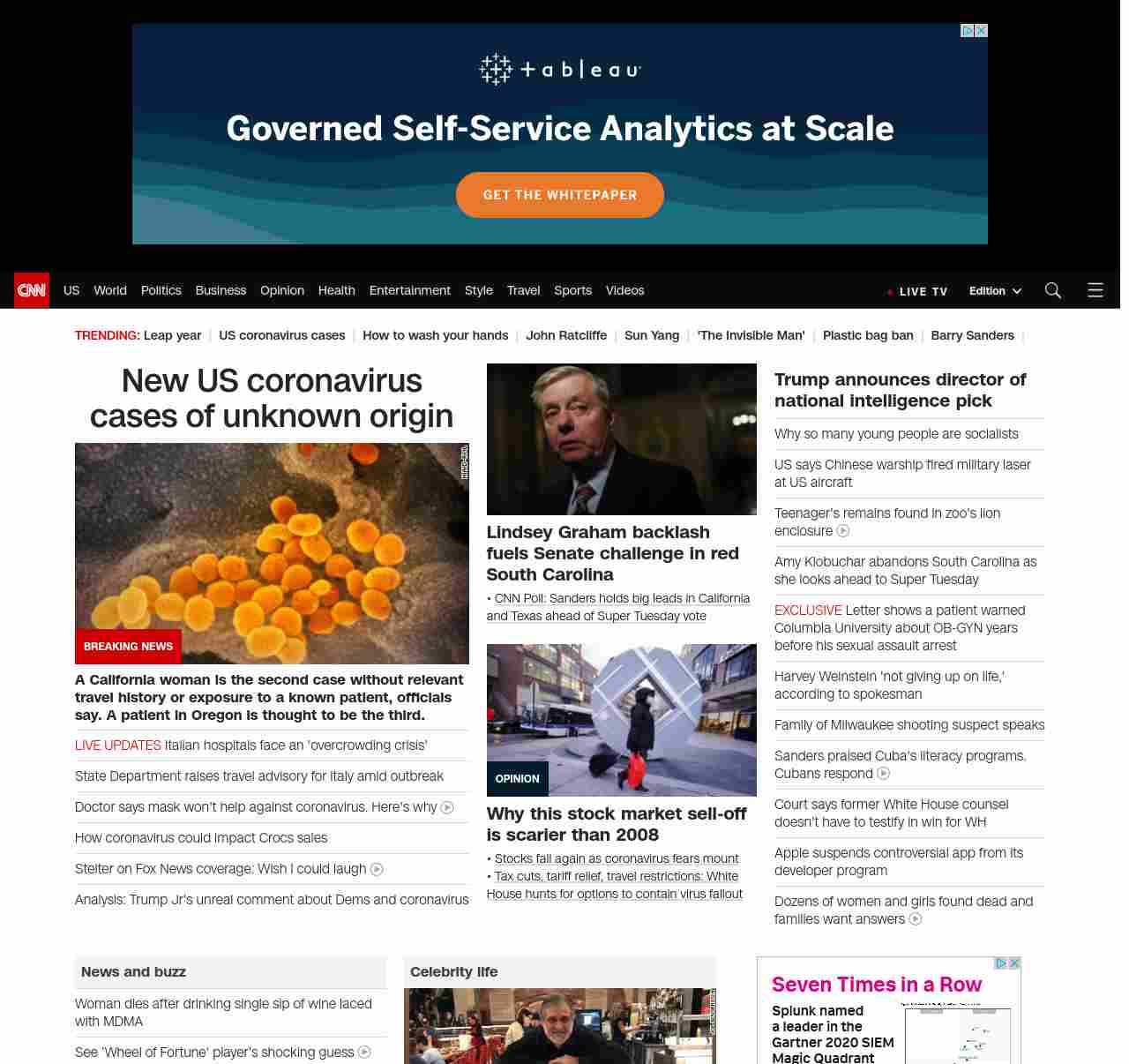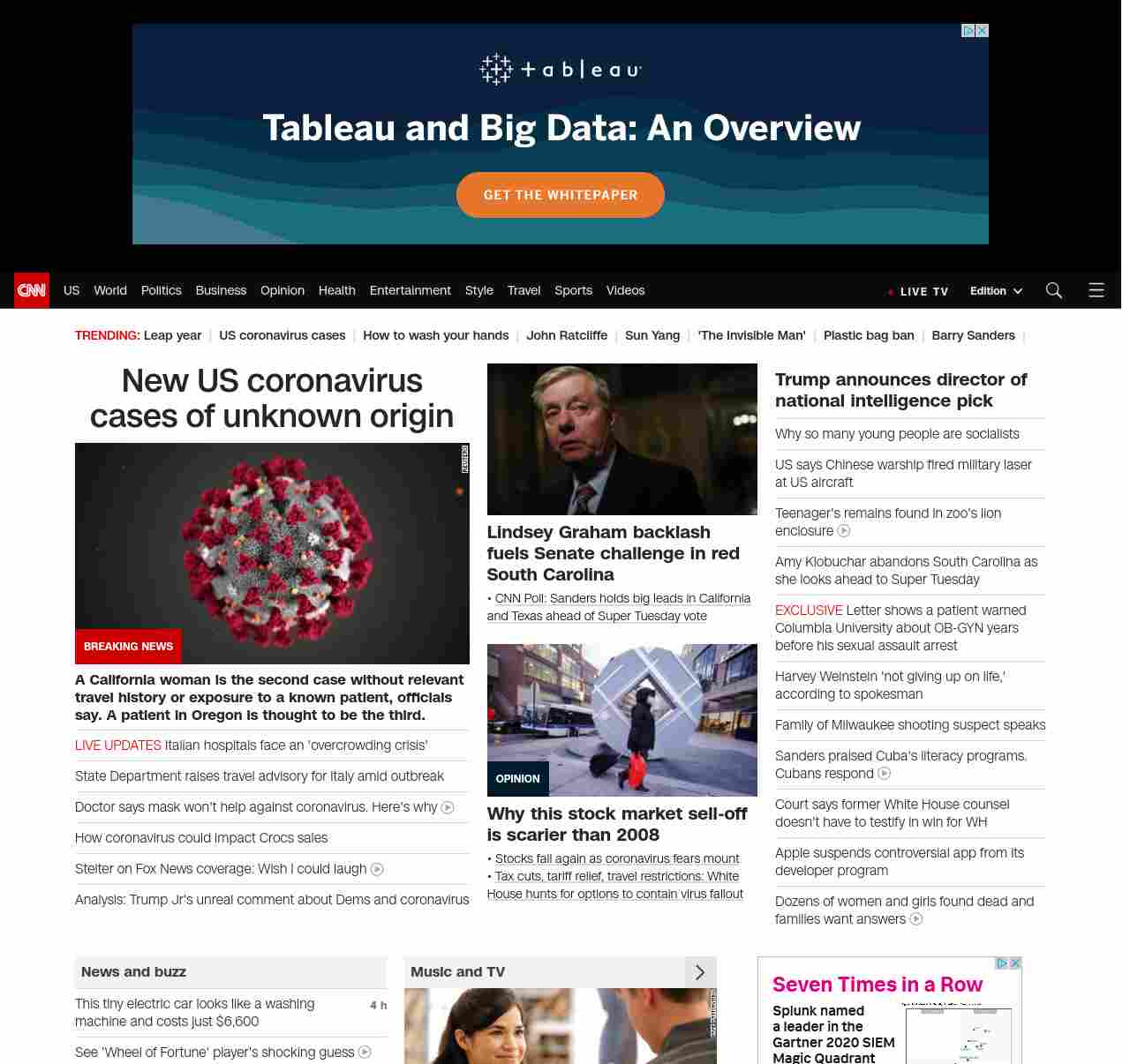 || screaming-banner-text banner-text-size–char-44″ data-analytics=”_list-hierarchical-xs_article_”> New US coronavirus cases of unknown origin ||” , title: “CNN – Breaking News, Latest News and Videos” , siblings: {“articleList”:[{“uri”:”/2020/02/28/health/coronavirus-us-updates-california-patient/index.html”,”headline”:”u003cstrong>A California woman is the second case without relevant travel history or exposure to a known patientu003c/strong>u003cstrong>, officials say. A patient in Oregon is thought to be the third.u003c/strong>”,”thumbnail”:”//cdn.cnn.com/cnnnext/dam/assets/200130165125-corona-virus-cdc-image-small-11.jpg”,”duration”:””,”description”:”An older adult woman from California might be the second case of community transmission of the u003ca href=”https://www.cnn.com/asia/live-news/coronavirus-outbreak-02-28-20-intl-hnk/index.html” target=”_blank”>novel coronavirusu003c/a>, health officials in Santa Clara County said Friday.”,”layout”:””