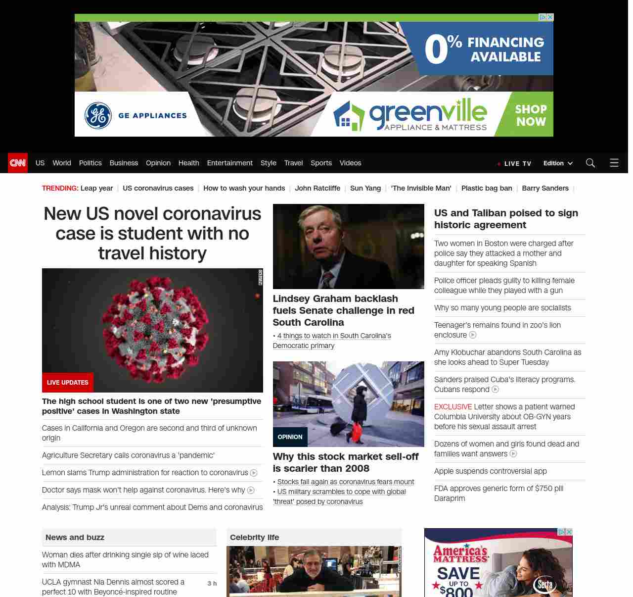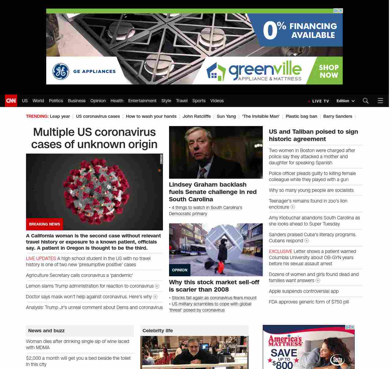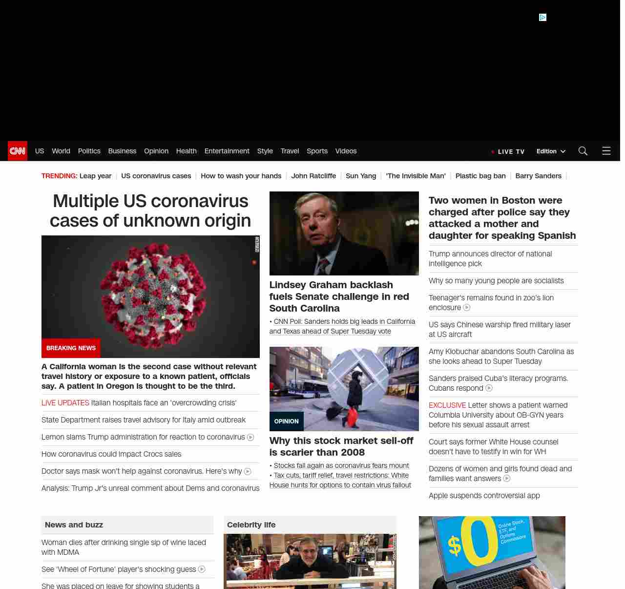 || screaming-banner-text banner-text-size–char-47″ data-analytics=”_list-hierarchical-xs_article_”> Multiple US coronavirus cases of unknown origin ||” , title: “CNN – Breaking News, Latest News and Videos” , siblings: {“articleList”:[{“uri”:”/2020/02/28/health/coronavirus-us-updates-california-patient/index.html”,”headline”:”Cases in California and Oregon are second and third of unknown origin”,”thumbnail”:”//cdn.cnn.com/cnnnext/dam/assets/200130165125-corona-virus-cdc-image-small-11.jpg”,”duration”:””,”description”:”An older adult woman from California might be the second case of community transmission of the u003ca href=”https://www.cnn.com/asia/live-news/coronavirus-outbreak-02-28-20-intl-hnk/index.html” target=”_blank”>novel coronavirusu003c/a>, health officials in Santa Clara County said Friday.”,”layout”:””