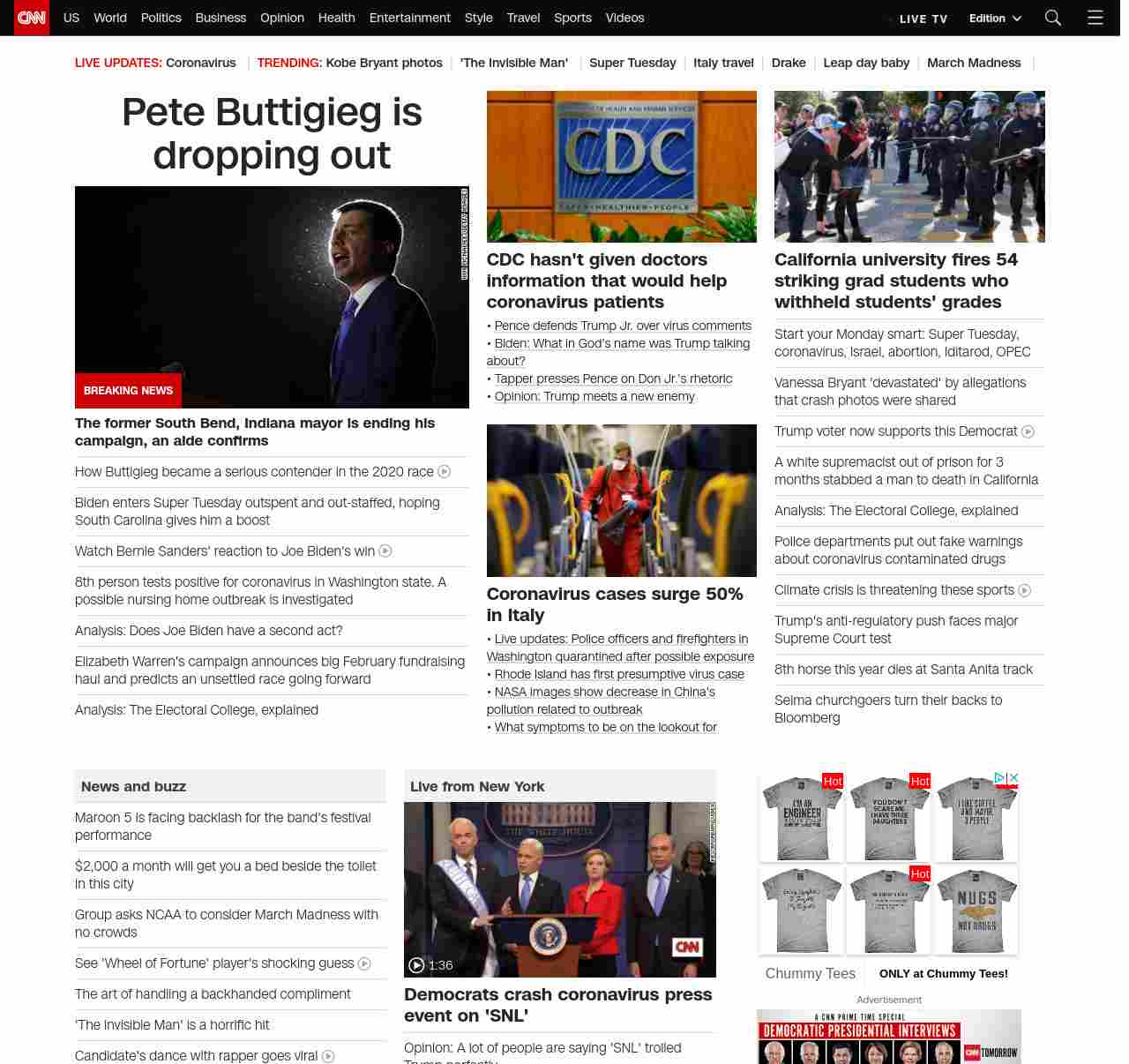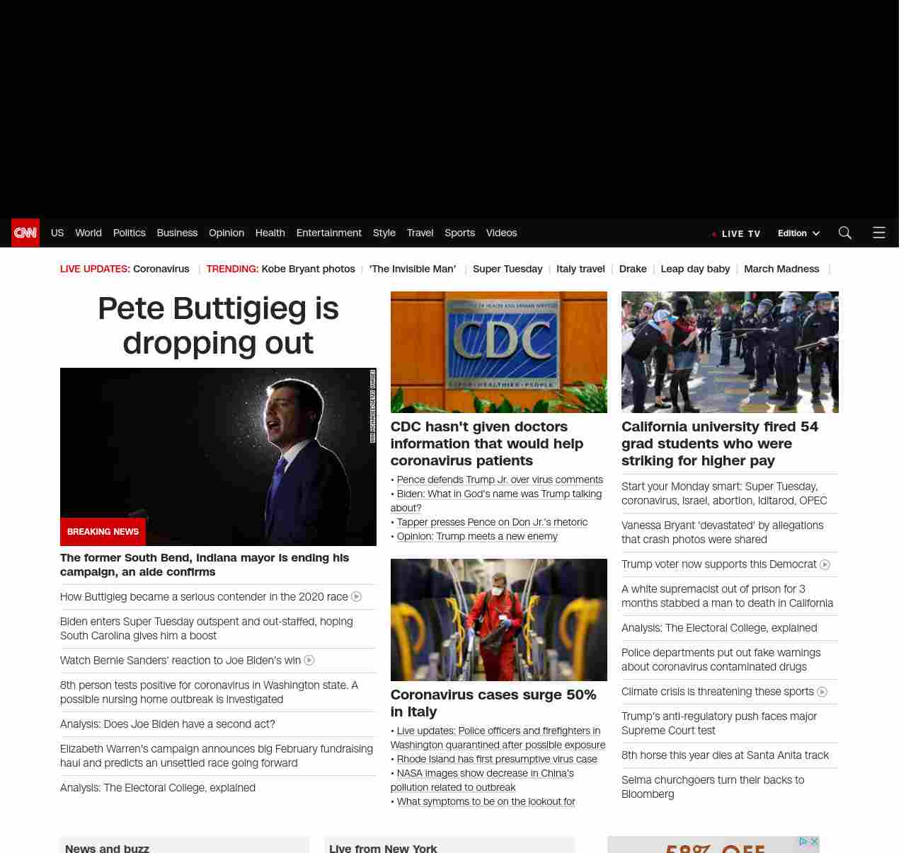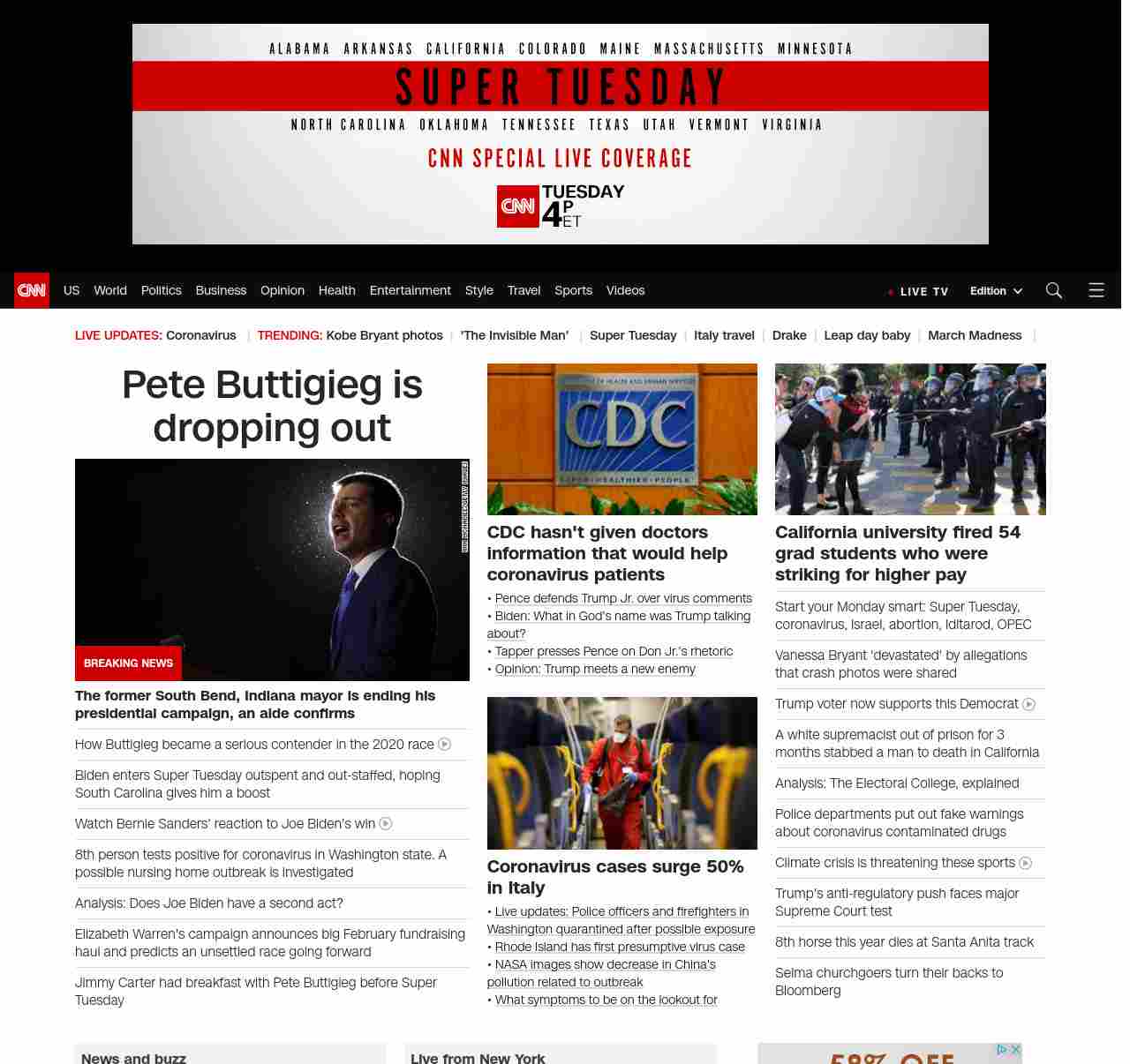 || screaming-banner-text banner-text-size–char-32″ data-analytics=”_list-hierarchical-xs_article_”> Pete Buttigieg is dropping out ||” , title: “CNN – Breaking News, Latest News and Videos” , siblings: {“articleList”:[{“uri”:”/2020/03/01/politics/buttigieg-campaign/index.html”,”headline”:”u003cstrong>The former South Bend, Indiana mayor is ending his campaign, an aide confirmsu003c/strong>”,”thumbnail”:”//cdn.cnn.com/cnnnext/dam/assets/200204004445-04-buttigieg-speaks-iowa-caucus-0203-small-11.jpg”,”duration”:””,”description”:”⢠u003ca href=”http://www.cnn.com/2020/03/01/politics/joe-biden-super-tuesday/index.html” target=”_blank”>Biden tries to keep momentum as he enters Super Tuesday outspent and out-staffedu003c/a>u003cbr />⢠u003ca href=”http://www.cnn.com/2020/03/01/politics/south-carolina-primary-winners-and-losers/index.html” target=”_blank”>Analysis: Winners, losers from the SC primaryu003c/a>u003cbr />⢠u003ca href=”https://www.cnn.com/videos/politics/2020/03/01/bernie-sanders-south-carolina-primary-vpx.cnn” target=”_blank”>Watch Sanders’ reaction to Biden’s winu003c/a>u003cbr />⢠u003ca href=”https://www.cnn.com/2020/03/01/us/march-madness-coronavirus-no-audiences-request-trnd/index.html” target=”_blank”>Analysis: Why South Carolina still mattersu003c/a>”,”layout”:””