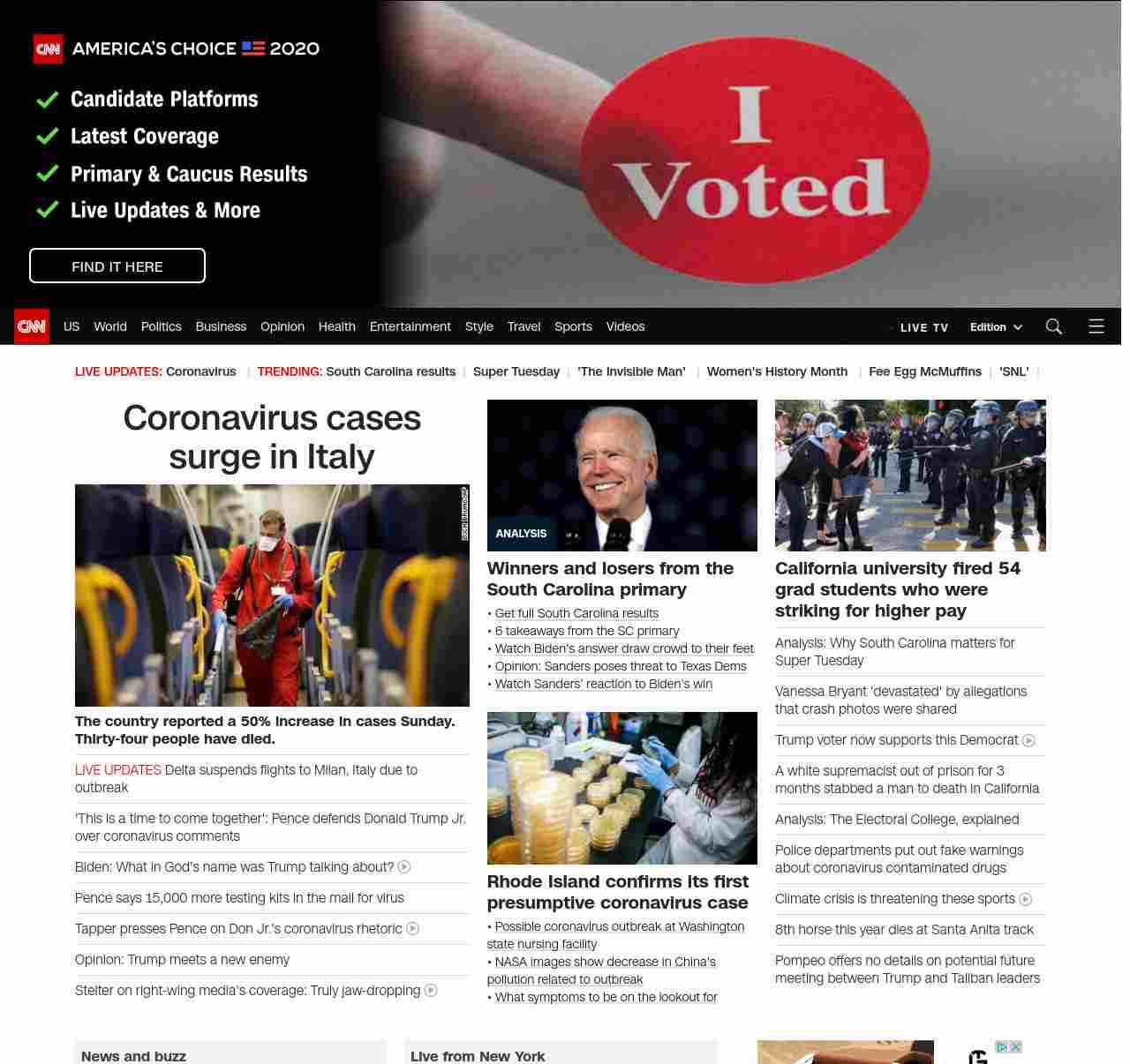 || screaming-banner-text banner-text-size–char-35″ data-analytics=”_list-hierarchical-xs_hyperlink_”> Coronavirus cases surge in Italy ||” , title: “CNN – Breaking News, Latest News and Videos” , siblings: {“articleList”:[{“uri”:”/videos/politics/2020/03/01/joe-biden-trump-coronavirus-sotu-vpx.cnn”,”headline”:”Biden: What in God’s name was Trump talking about?”,”thumbnail”:”//cdn.cnn.com/cnnnext/dam/assets/200301094407-biden-sotu-3-1-2020-small-11.jpg”,”duration”:”02:45″,”description”:”CNN’s Jake Tapper asks 2020 Democratic presidential candidate Joe Biden how he would handle the coronavirus outbreak differently than President Trump.”,”layout”:””,”iconType”:”video”