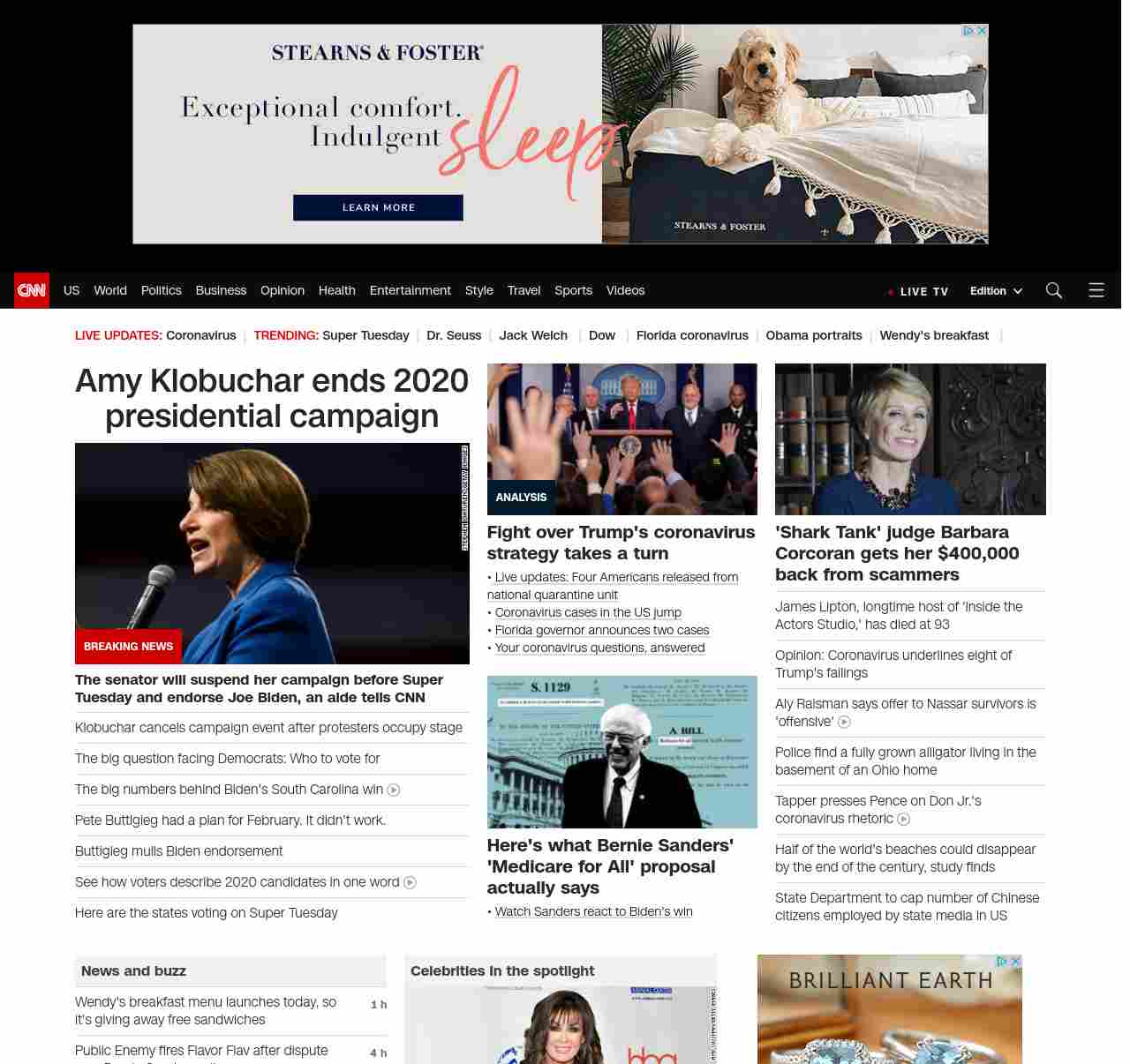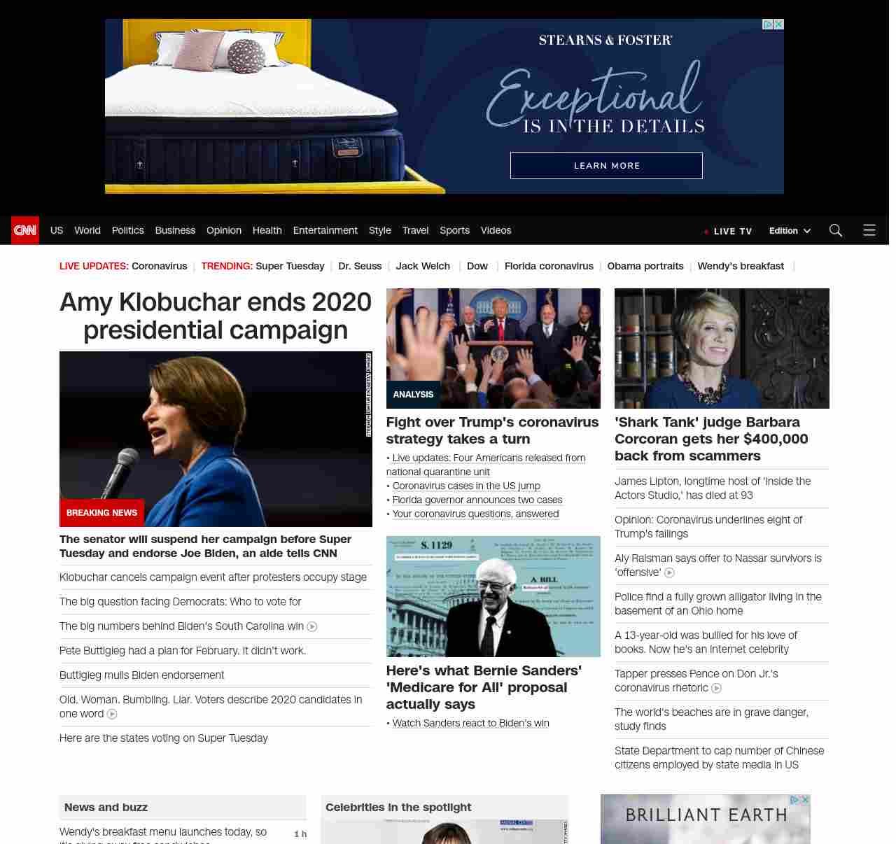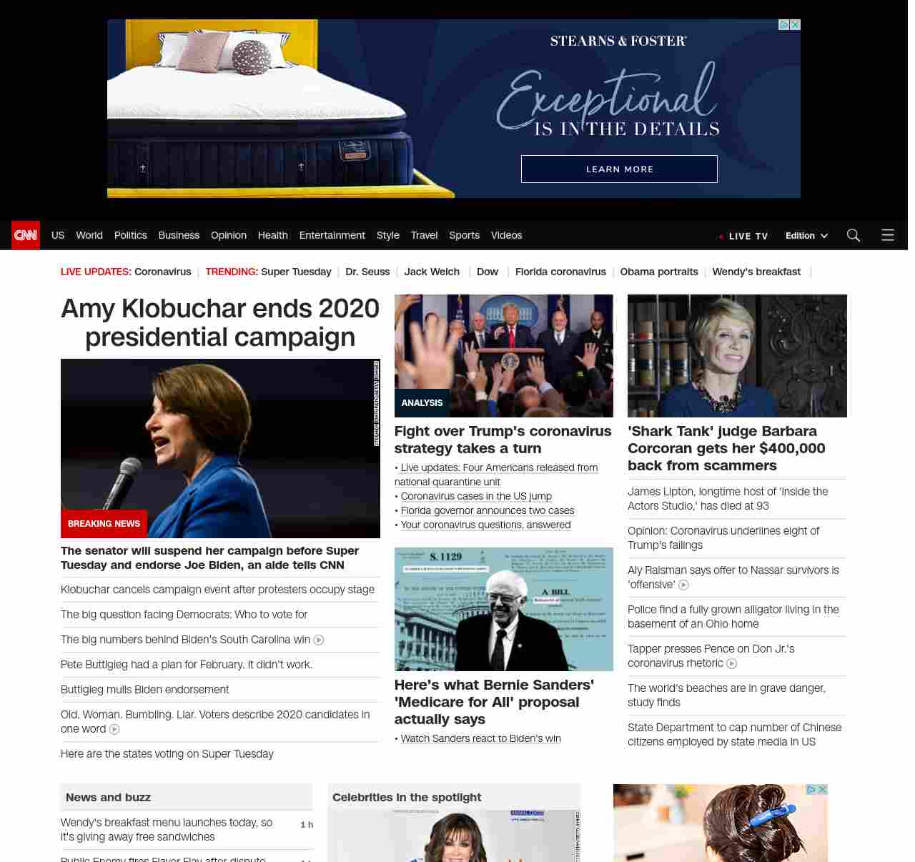 || screaming-banner-text banner-text-size–char-47″ data-analytics=”_list-hierarchical-xs_article_”> Amy Klobuchar ends 2020 presidential campaign ||” , title: “CNN – Breaking News, Latest News and Videos” , siblings: {“articleList”:[{“uri”:”/2020/03/02/politics/amy-klobuchar-ends-2020-campaign/index.html”,”headline”:”u003cstrong>The senator will suspend her campaign before Super Tuesday and endorse Joe Biden, an aide tells CNNu003c/strong>”,”thumbnail”:”//cdn.cnn.com/cnnnext/dam/assets/190902155136-02-amy-klobuchar-lead-image-small-11.jpg”,”duration”:””,”description”:”Sen. Amy Klobuchar will end her presidential bid on Monday and endorse Joe Biden, a campaign aide tells CNN. “,”layout”:””