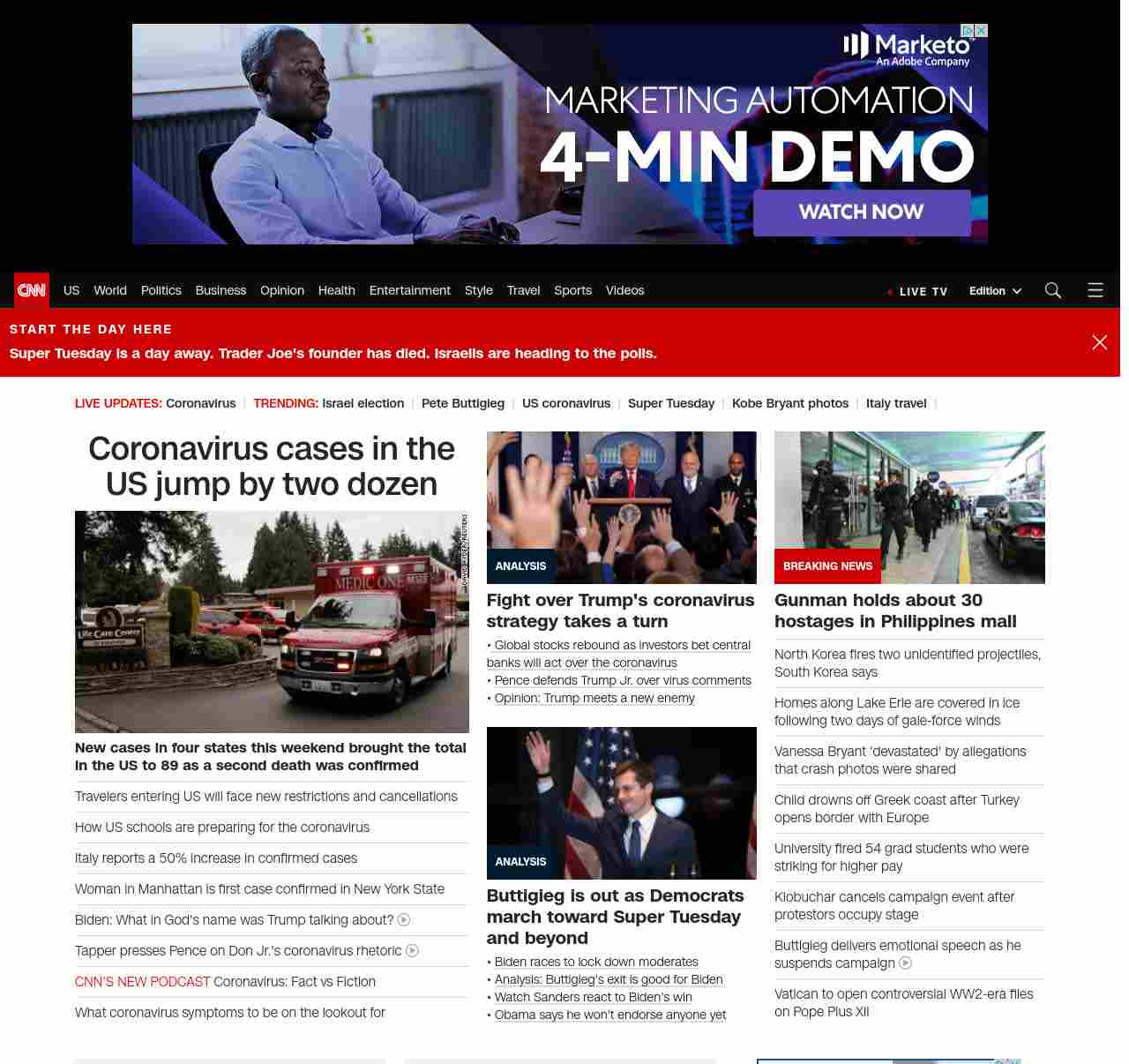 || screaming-banner-text banner-text-size–char-47″ data-analytics=”_list-hierarchical-xs_article_”> Coronavirus cases in the US jump by two dozen ||” , title: “CNN – Breaking News, Latest News and Videos” , siblings: {“articleList”:[{“uri”:”/2020/03/02/health/us-coronavirus-cases-monday/index.html”,”headline”:”u003cstrong>New cases in four states this weekend brought the total in the US to 89 as a second death was confirmedu003c/strong>”,”thumbnail”:”//cdn.cnn.com/cnnnext/dam/assets/200302104935-05-coronavirus-0301-washington-state-small-11.jpg”,”duration”:””,”description”:”The total number of novel coronavirus cases in the United States jumped by two dozen over the weekend, as the first two deaths from the outbreak were confirmed.”,”layout”:””