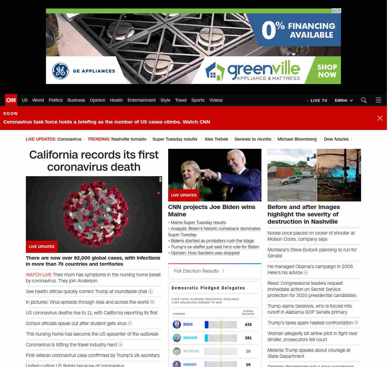 || screaming-banner-text banner-text-size–char-47″ data-analytics=”_list-hierarchical-xs_hyperlink_”> California records its first coronavirus death ||” , title: “CNN – Breaking News, Latest News and Videos” , siblings: {“articleList”:[{“uri”:”/videos/politics/2020/03/03/burnett-monologue-trump-scientist-coronavirus-reaction-ebof-vpx.cnn”,”headline”:”See health official quickly correct Trump at roundtable chat”,”thumbnail”:”//cdn.cnn.com/cnnnext/dam/assets/200302192417-burnett-trump-coronavirus-small-11.jpg”,”duration”:”02:10″,”description”:”CNN’s Erin Burnett discusses claims made by President Donald Trump about the coronavirus that have completely contradicted what scientists have reported.”,”layout”:””,”iconType”:”video”