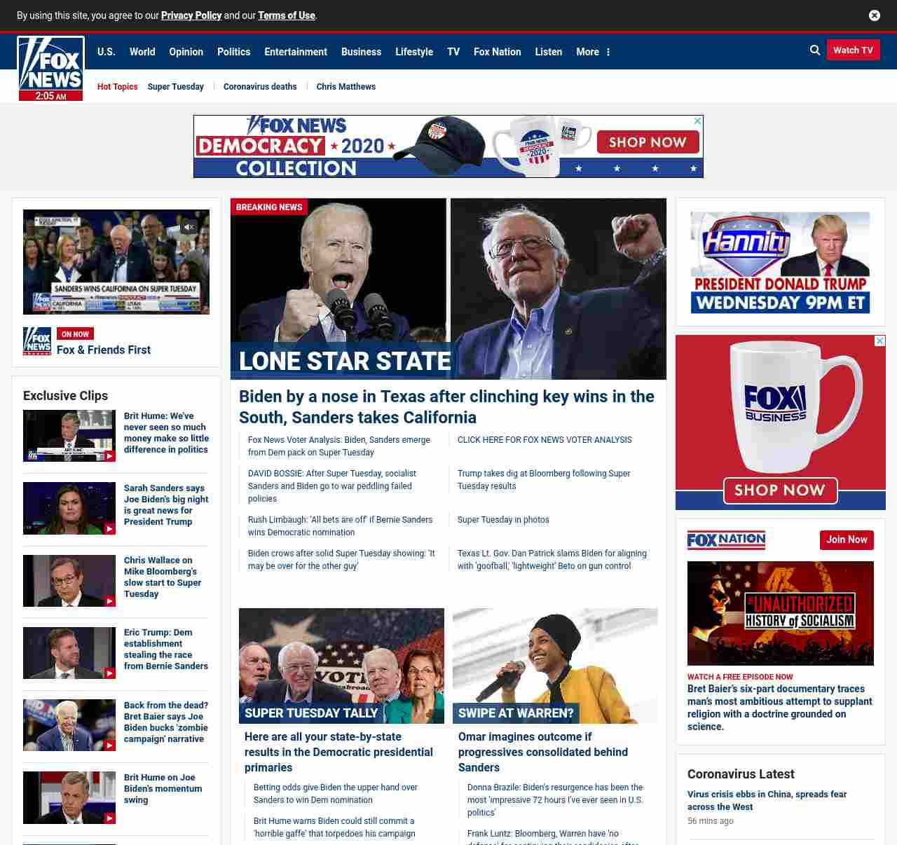FN: [[LONE STAR STATE]] Biden by a nose in Texas after clinching key wins in the South, Sanders takes California ((lubuntu at wor2))