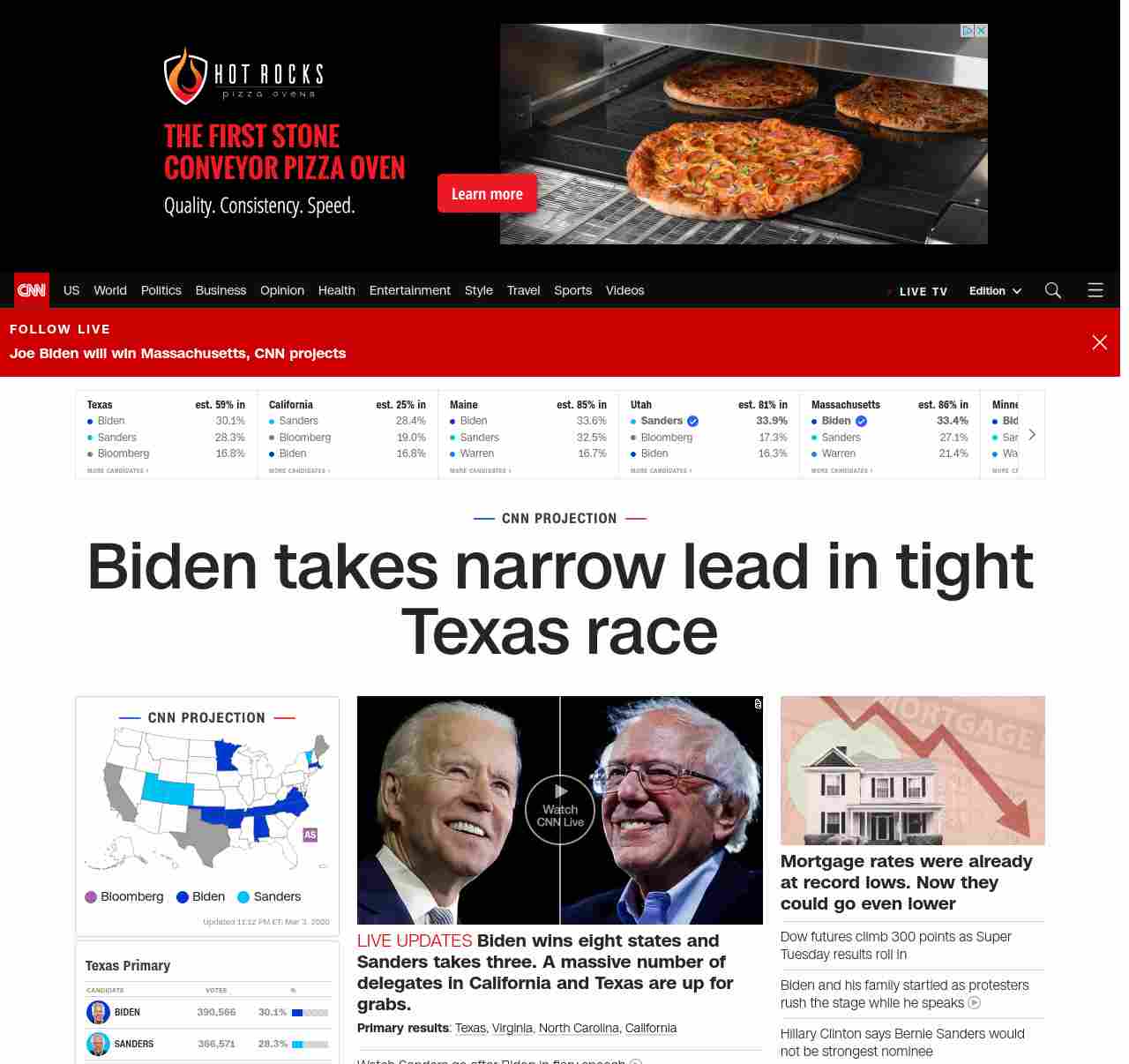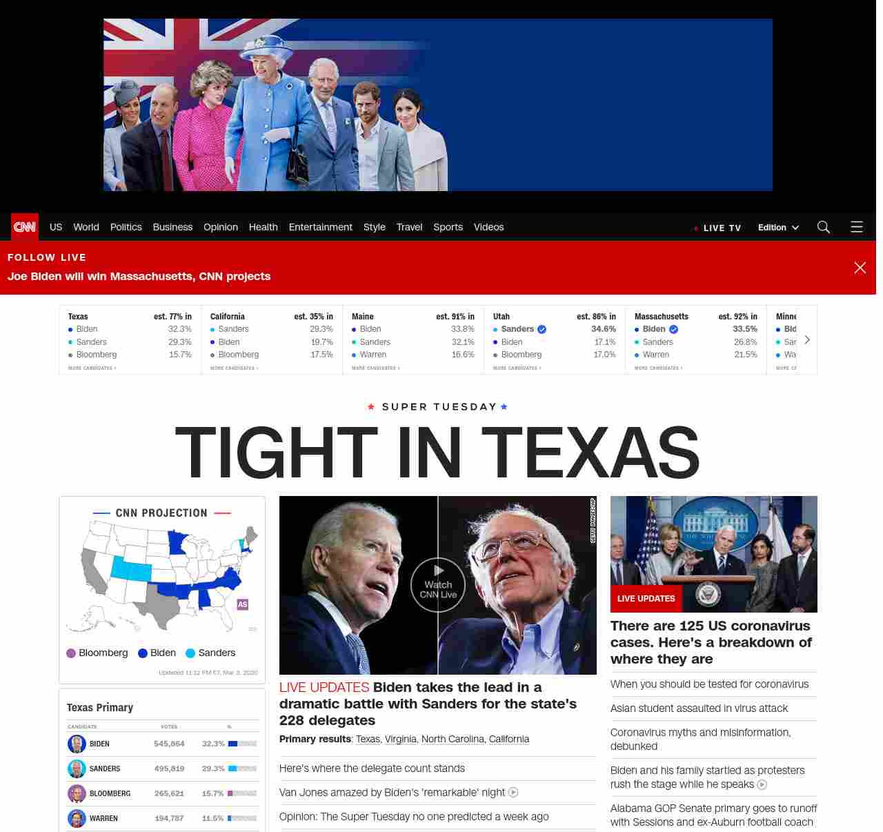 || banner-text–natural”> Biden takes narrow lead in tight Texas race ||” , title: “CNN – Breaking News, Latest News and Videos” , siblings: {“articleList”:[{“uri”:”/2020/03/03/politics/super-tuesday-democratic-primary-2020/index.html”,”headline”:”CNN projects: Joe Biden scores big wins on Super Tuesday”,”thumbnail”:”//cdn.cnn.com/cnnnext/dam/assets/200303191234-01-biden-0302-small-11.jpg”,”duration”:””,”description”:”Former Vice President u003ca href=”https://www.cnn.com/election/2020/candidate/biden” target=”_blank”>Joe Bidenu003c/a> grabbed u003ca href=”https://cnn.it/3aiZUfo” target=”_blank”>two huge early wins on Super Tuesdayu003c/a>, winning the Virginia and North Carolina Democratic primaries, CNN projects, u003ca href=”https://www.cnn.com/2020/03/03/politics/super-tuesday-polls-voting/index.html” target=”_blank”>confirming that his comeback momentumu003c/a> is for real on the most crucial night yet in the 2020 election.”,”layout”:””