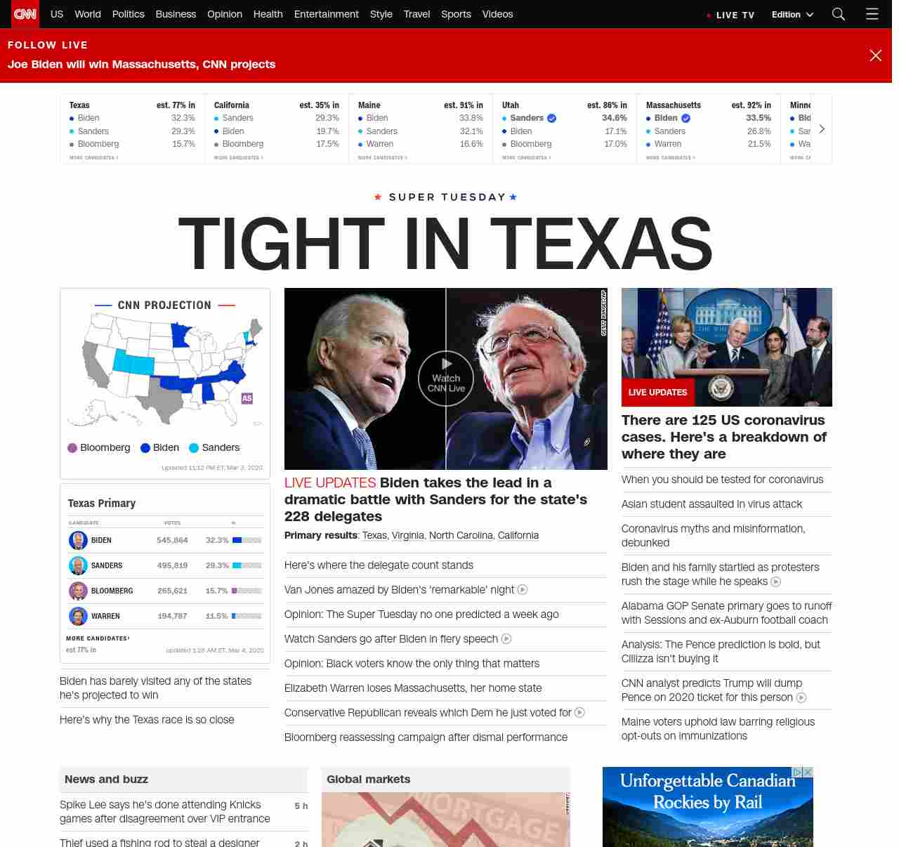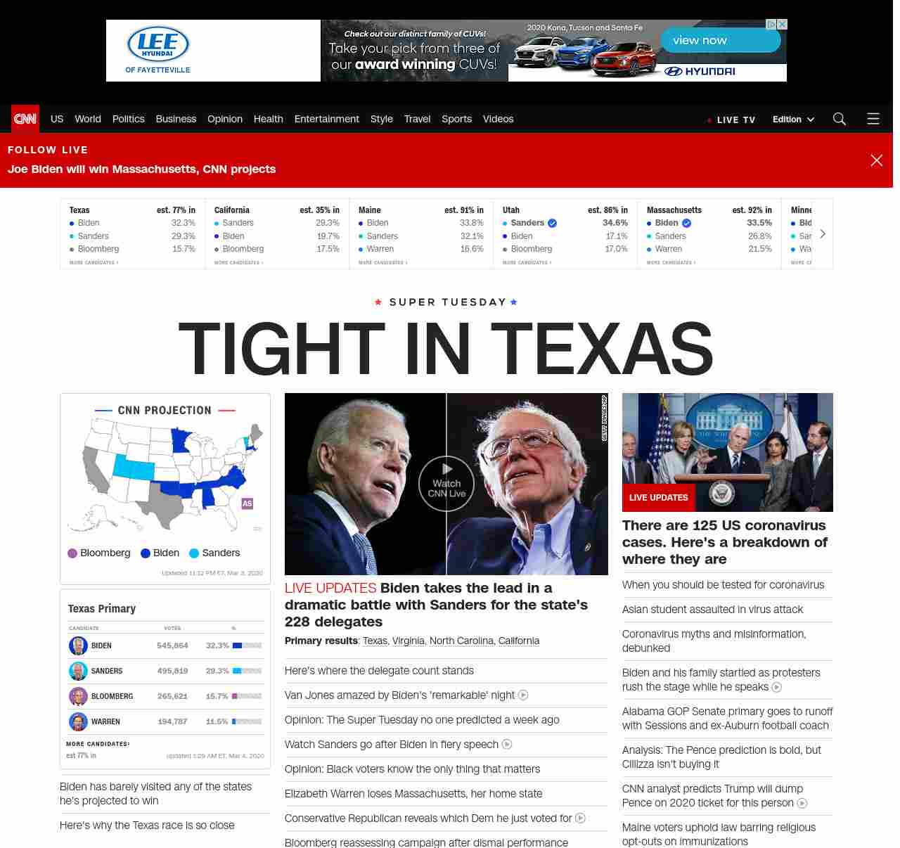 || banner-text–maximized banner-text-size–char-17-uc”> TIGHT IN TEXAS ||” , title: “CNN – Breaking News, Latest News and Videos” , siblings: {“articleList”:[{“uri”:”/politics/live-news/super-tuesday-results-2020/index.html”,”headline”:”u003cstrong>Biden takes the lead in a dramatic battle with Sanders for the state’s 228 delegatesu003c/strong>”,”thumbnail”:”//cdn.cnn.com/cnnnext/dam/assets/200304001645-09-biden-sanders-split-small-11.jpg”,”duration”:””,”description”:”u003cstrong>Primary resultsu003c/strong>: u003ca href=”http://www.cnn.com/2020/03/03/politics/texas-primary-results-live/index.html” target=”_blank”>Texasu003c/a>, u003ca href=”http://www.cnn.com/2020/03/03/politics/virginia-primary-results-live/index.html” target=”_blank”>Virginiau003c/a>, u003ca href=”https://www.cnn.com/2020/03/03/politics/north-carolina-primary-results-live/index.html” target=”_blank”>North Carolinau003c/a>, u003ca href=”http://www.cnn.com/2020/03/03/politics/california-primary-results-live/index.html” target=”_blank”>Californiau003c/a>”,”layout”:””