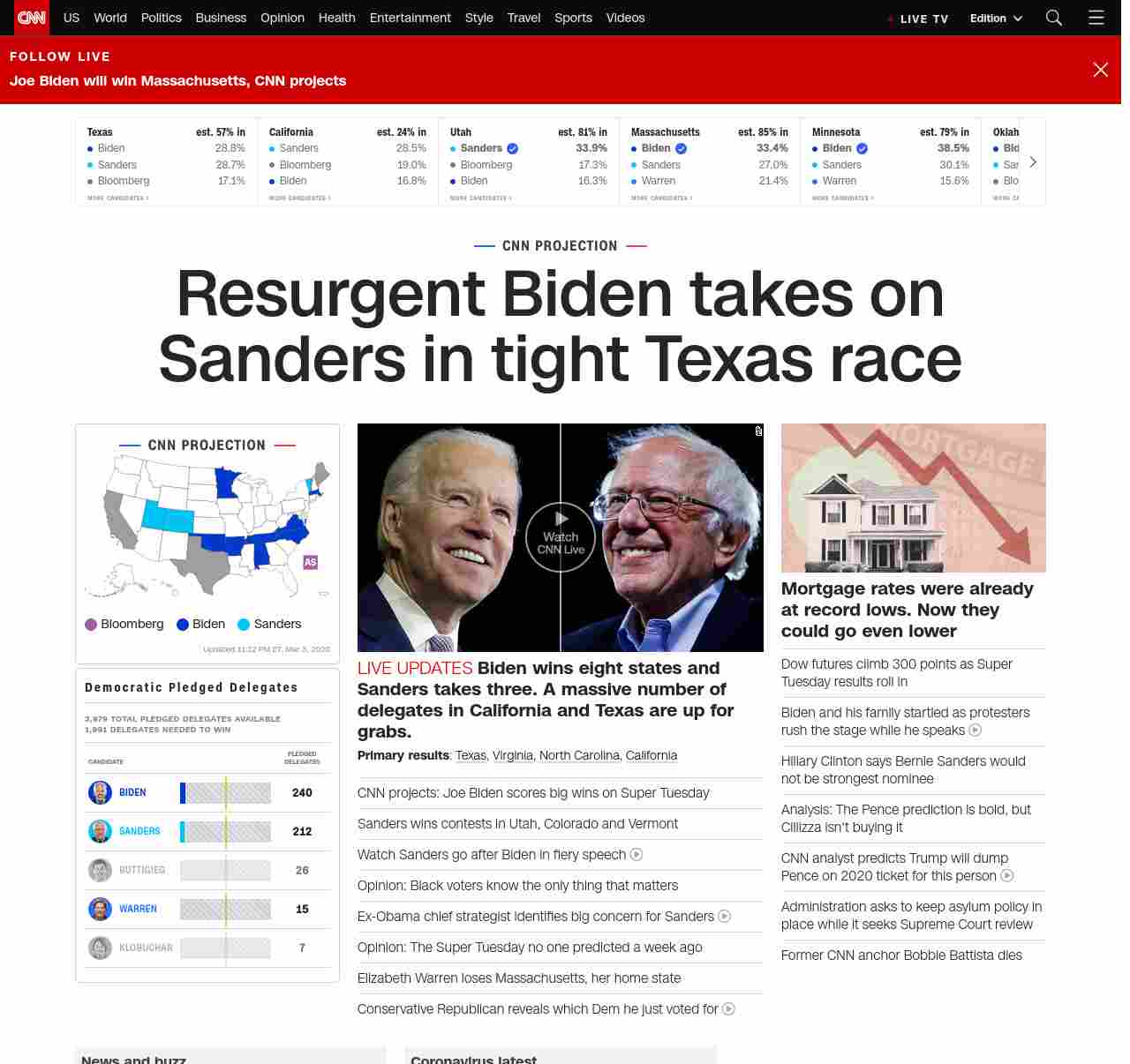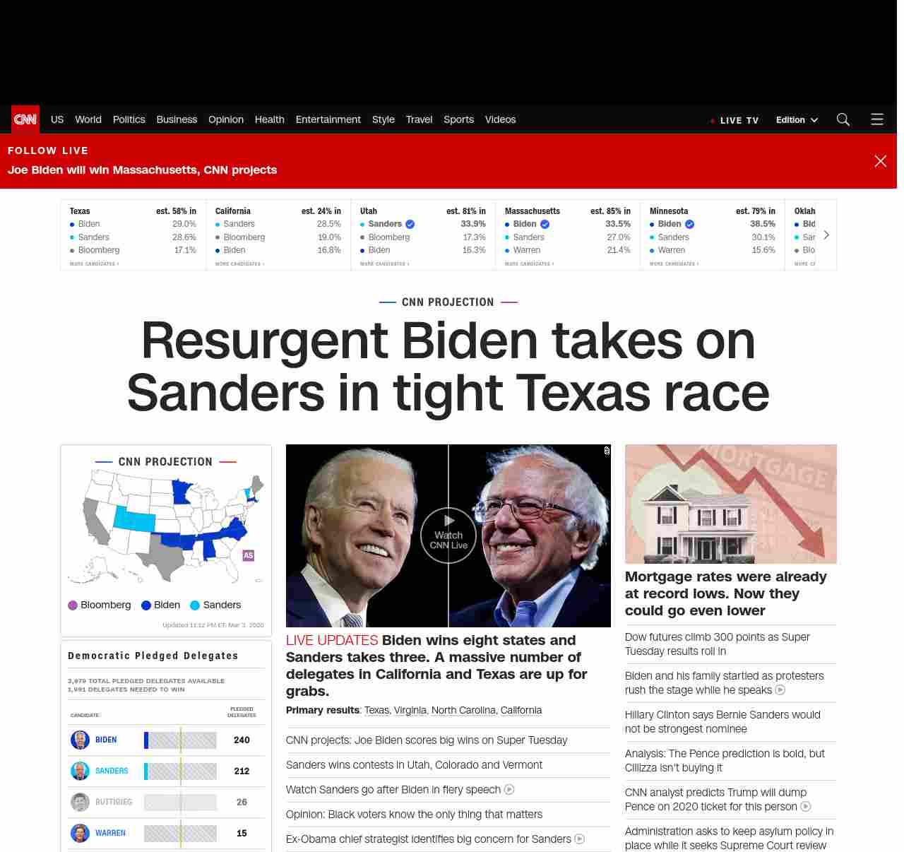 || banner-text–natural”> Resurgent Biden takes on Sanders in tight Texas race ||” , title: “CNN – Breaking News, Latest News and Videos” , siblings: {“articleList”:[{“uri”:”/politics/live-news/super-tuesday-results-2020/index.html”,”headline”:”u003cstrong>Biden wins eight states and Sanders takes three. A massive number of delegates in California and Texas are up for grabs.u003c/strong>”,”thumbnail”:”//cdn.cnn.com/cnnnext/dam/assets/200303233206-08-biden-sadners-split-small-11.jpg”,”duration”:””,”description”:”u003cstrong>Primary resultsu003c/strong>: u003ca href=”http://www.cnn.com/2020/03/03/politics/texas-primary-results-live/index.html” target=”_blank”>Texasu003c/a>, u003ca href=”http://www.cnn.com/2020/03/03/politics/virginia-primary-results-live/index.html” target=”_blank”>Virginiau003c/a>, u003ca href=”https://www.cnn.com/2020/03/03/politics/north-carolina-primary-results-live/index.html” target=”_blank”>North Carolinau003c/a>, u003ca href=”http://www.cnn.com/2020/03/03/politics/california-primary-results-live/index.html” target=”_blank”>Californiau003c/a>”,”layout”:””